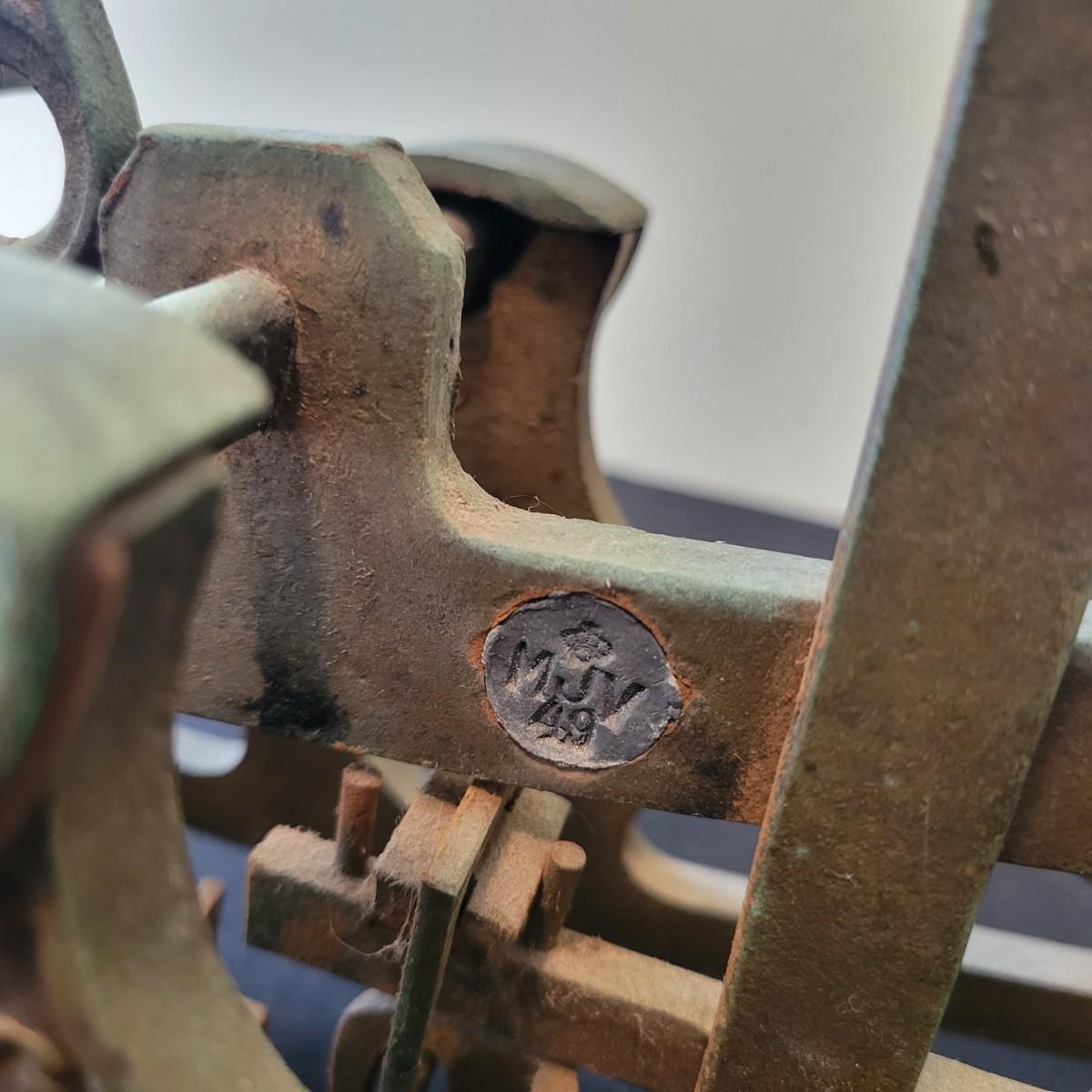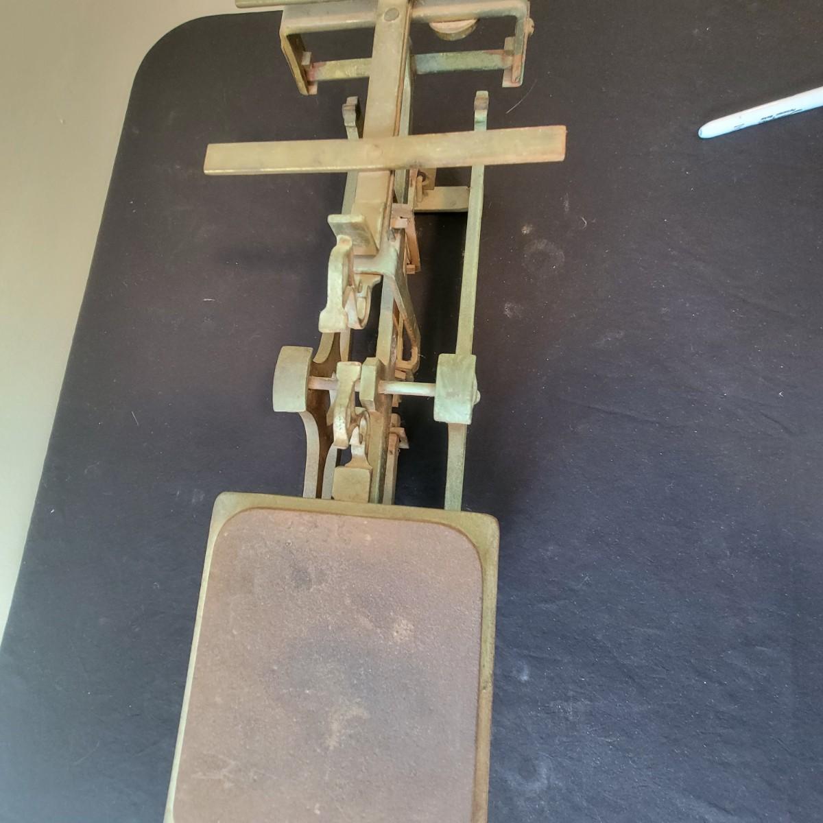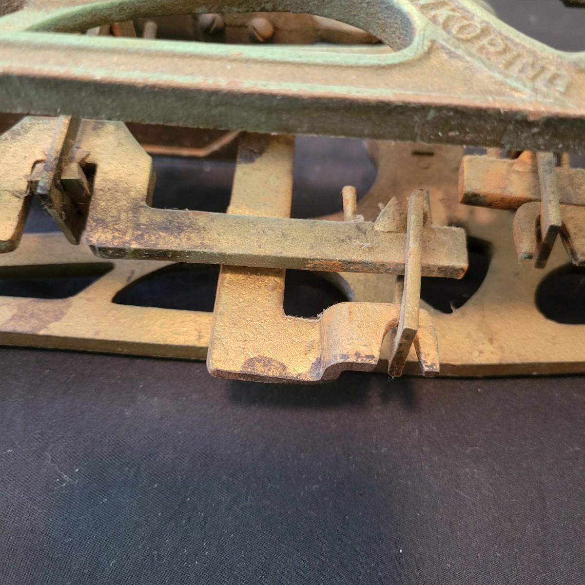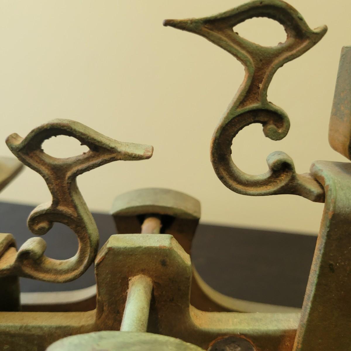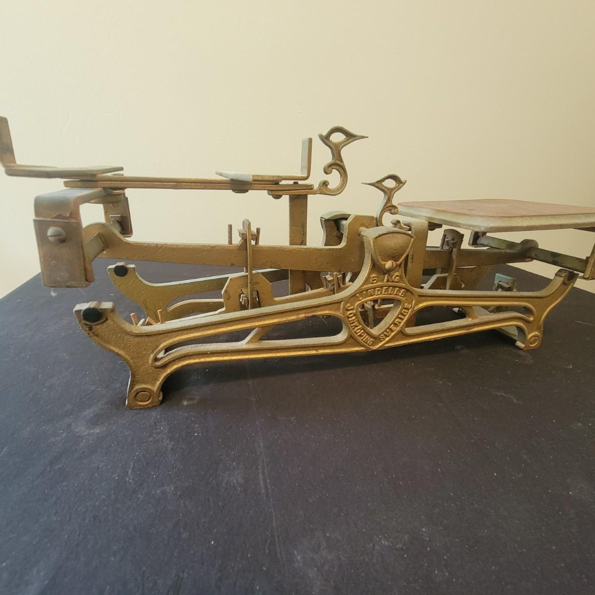 Cast iron scale produced by Lindelle, Jonkoping and Sverige. Made of cast iron and in beautiful condition. Has a faux copper patina and is scaled to measure 5kgs. All parts appear to be present and working. Shipping available.