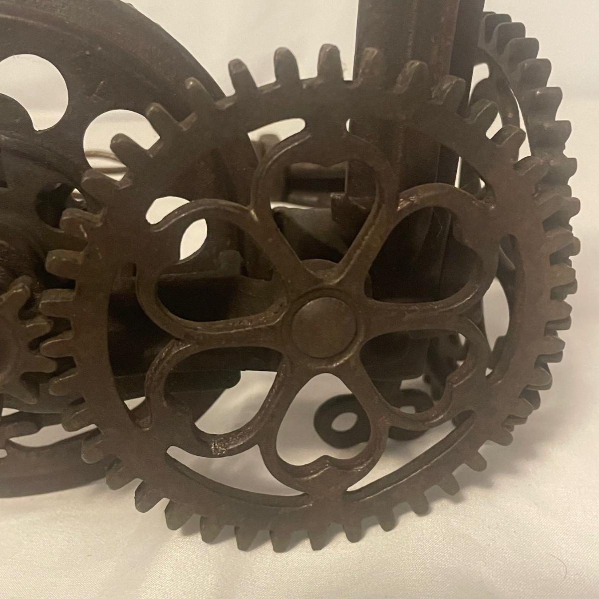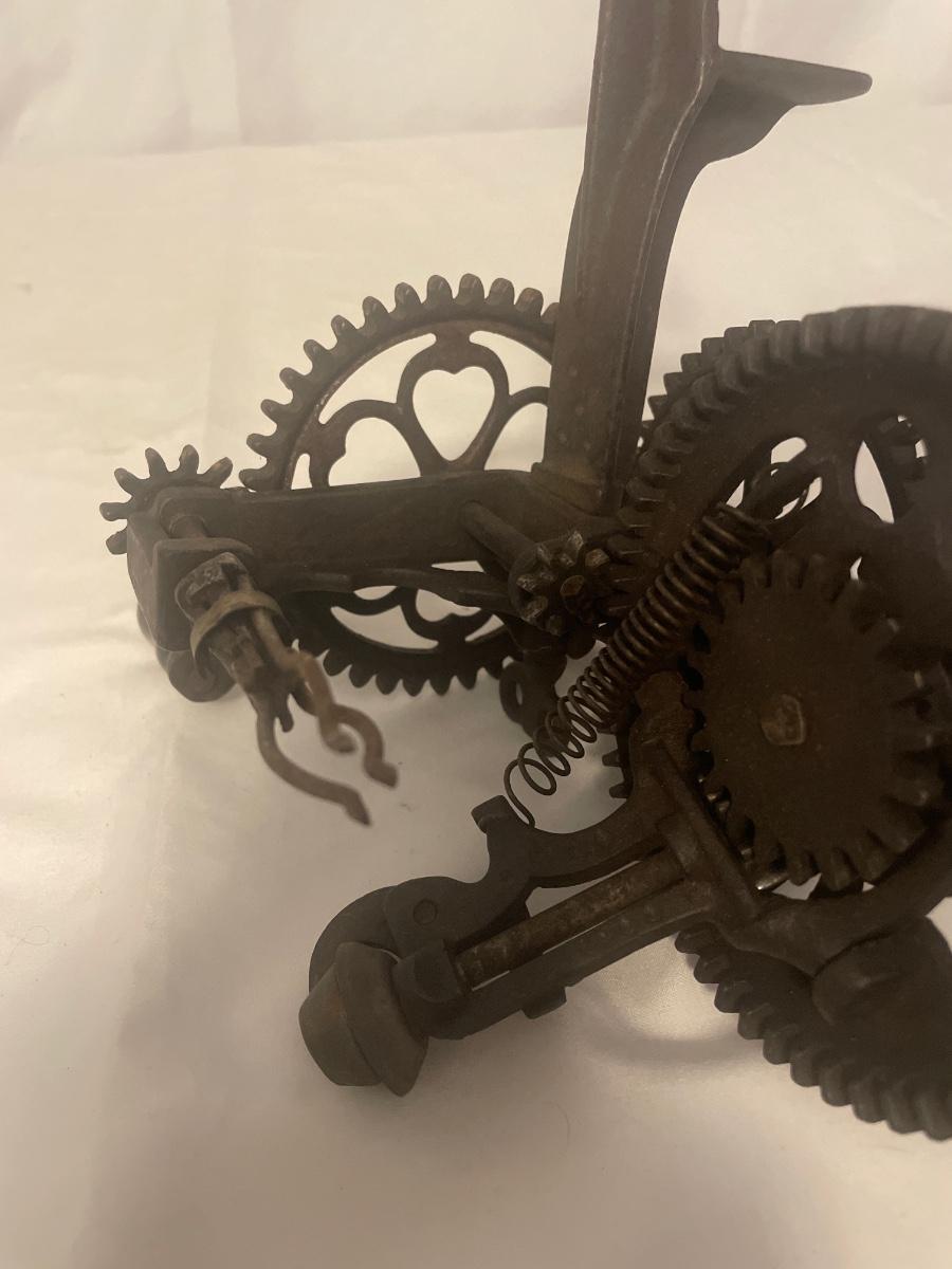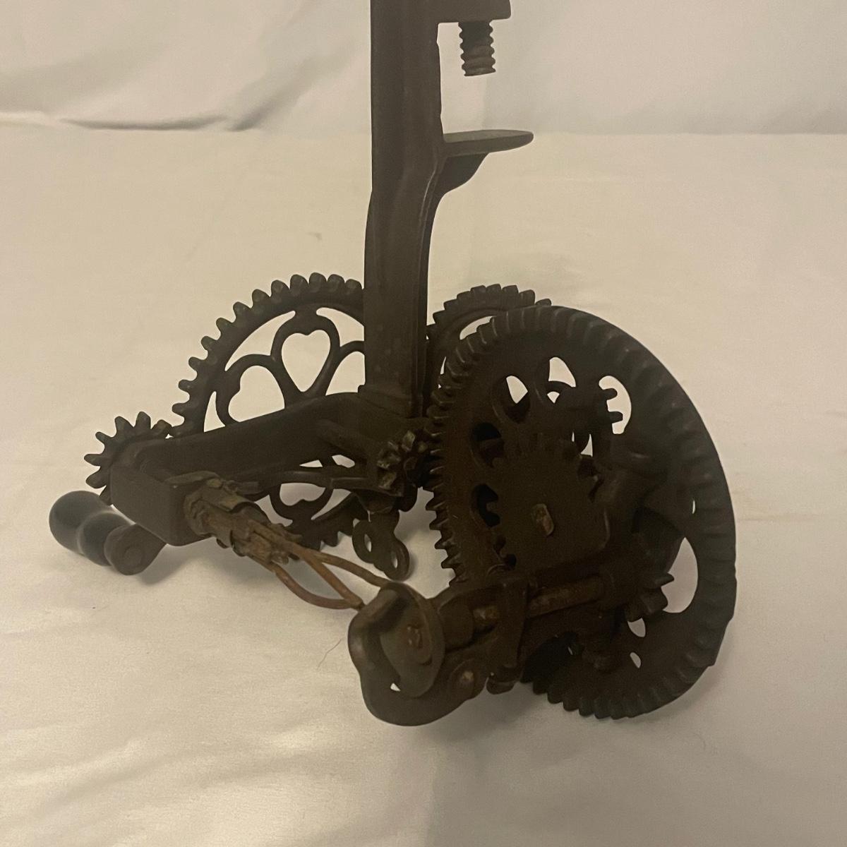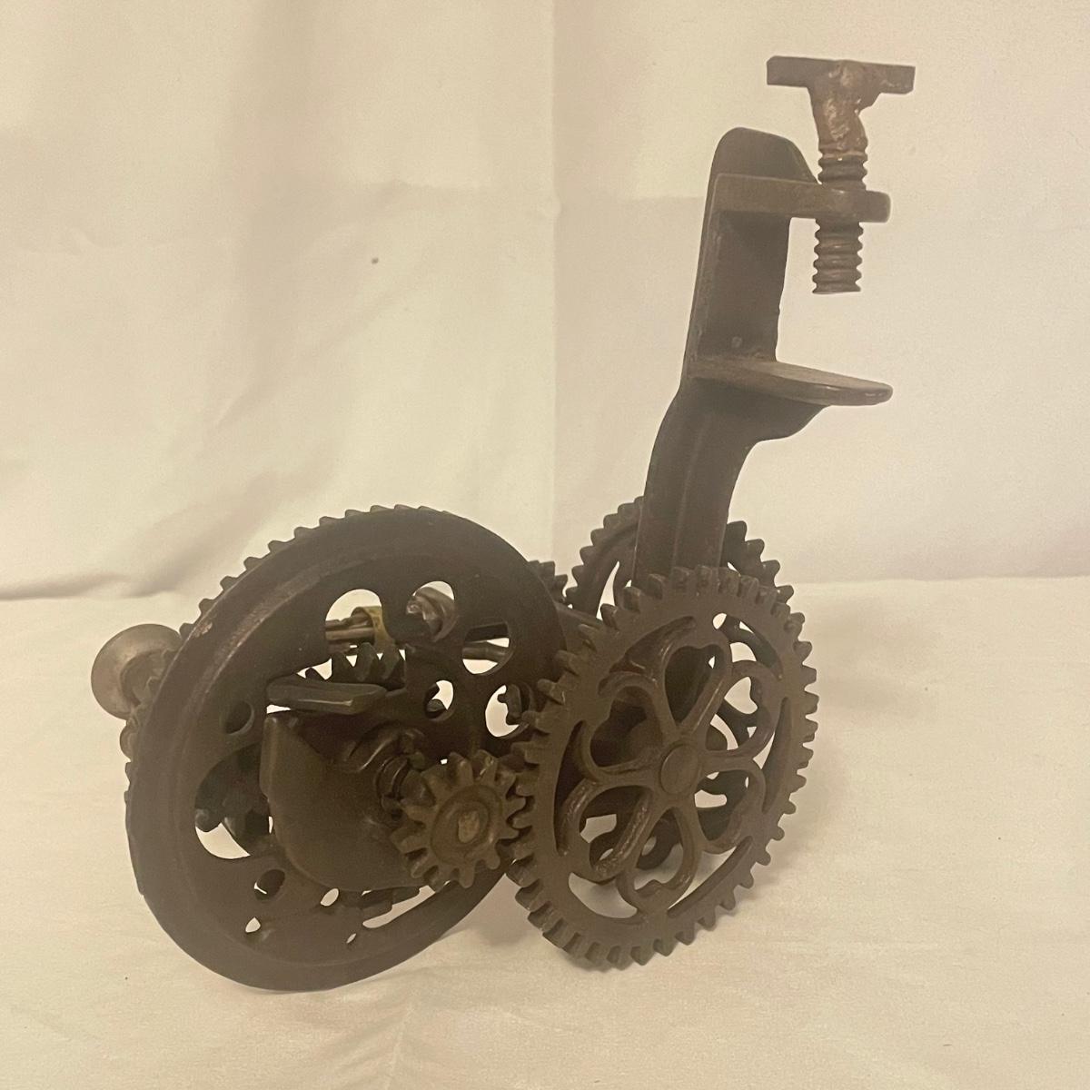 This antique piece is we believe, an apple peeler. It is cast iron and in very good condition; all cogs etc. turn smoothly and effortlessly. Measures approximately 5” x 7” x 7.5”.