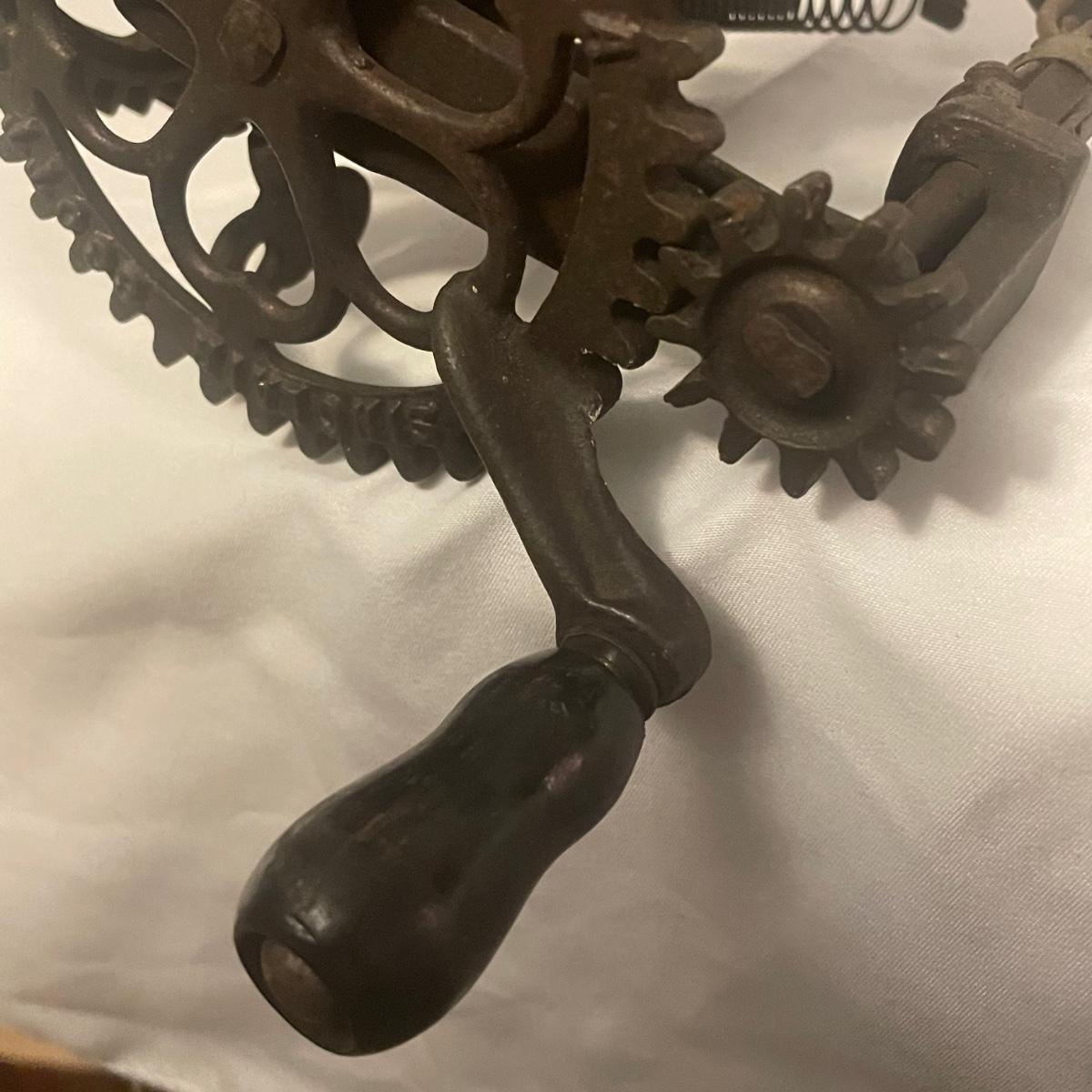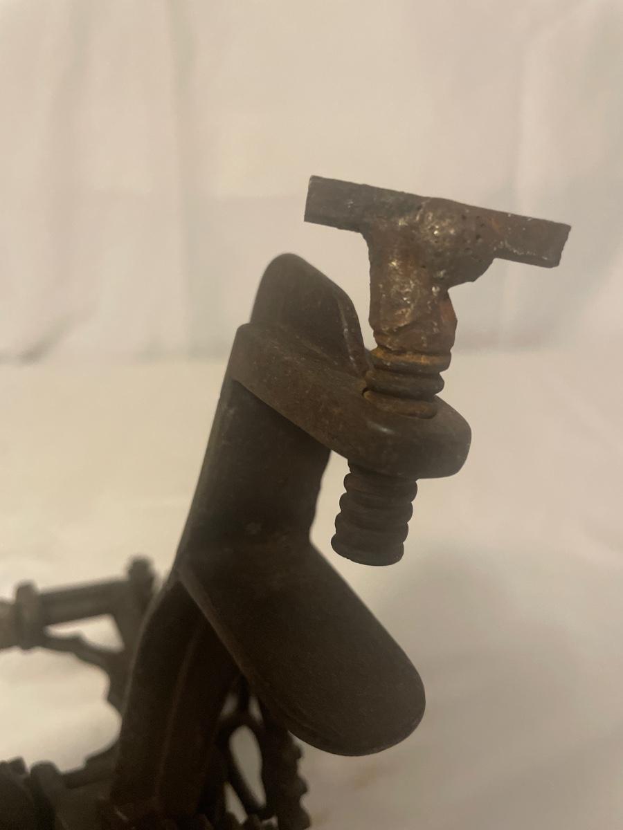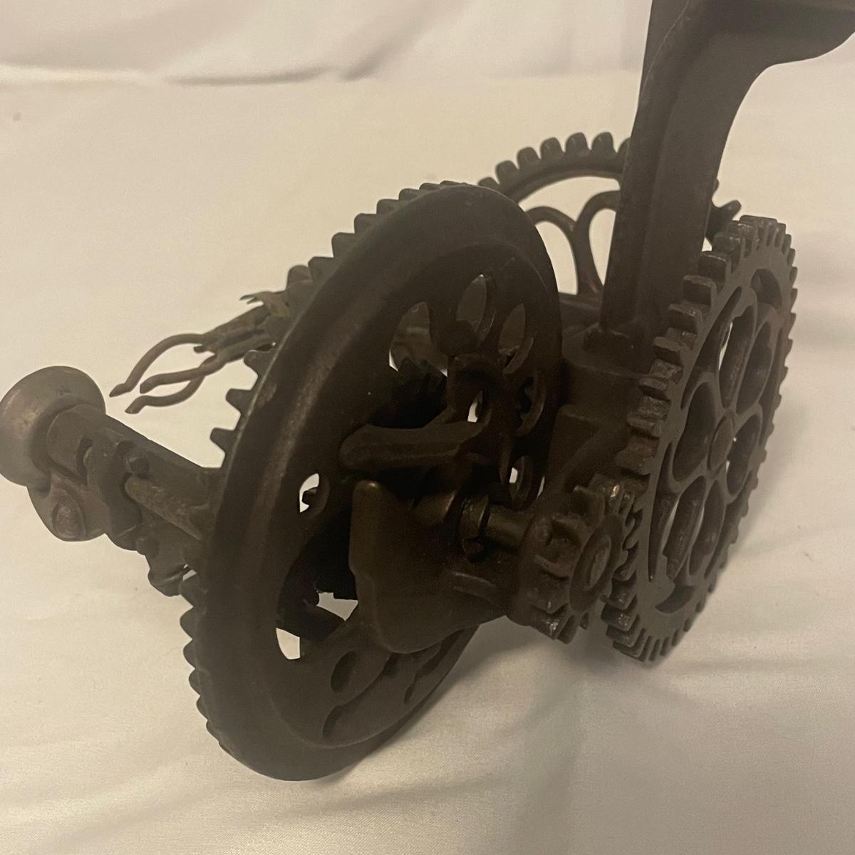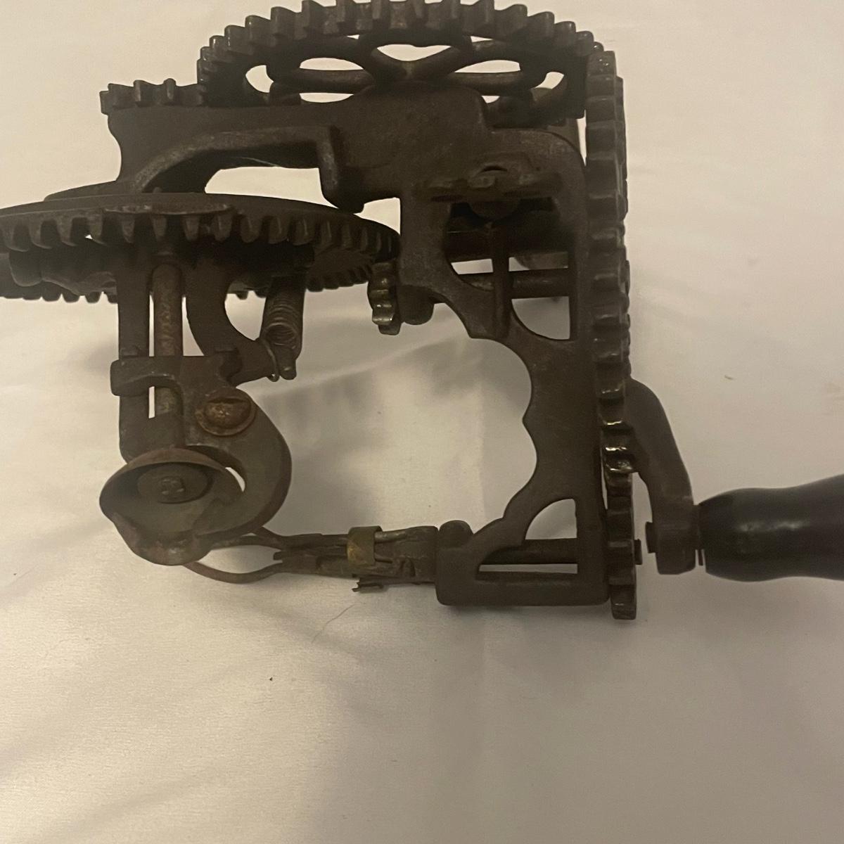 This antique piece is we believe, an apple peeler. It is cast iron and in very good condition; all cogs etc. turn smoothly and effortlessly. Measures approximately 5” x 7” x 7.5”.
