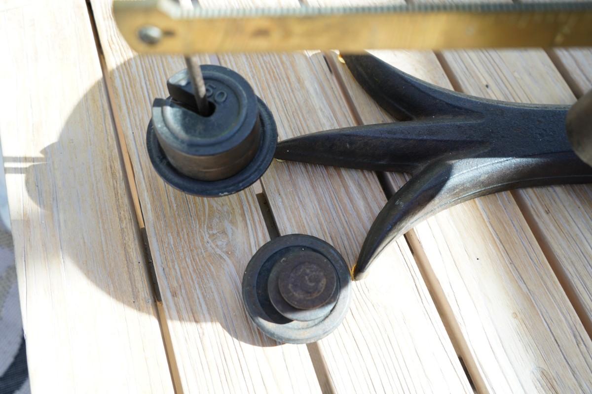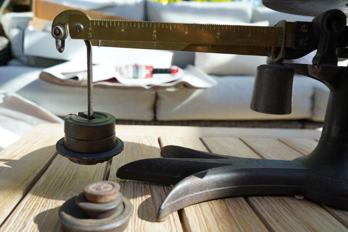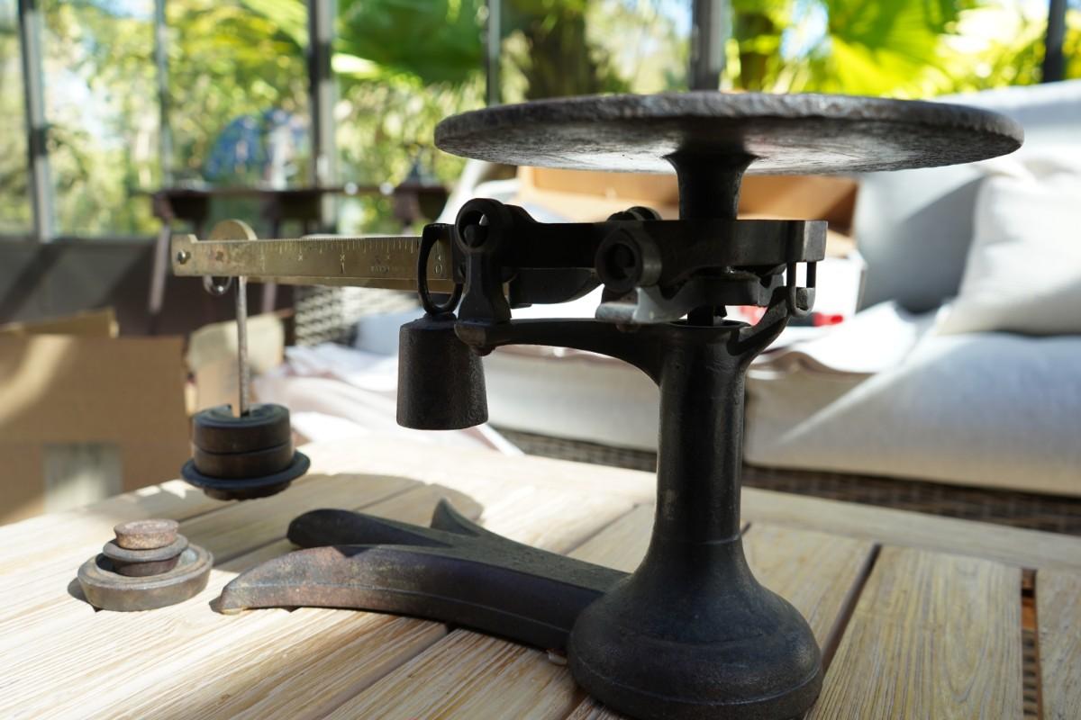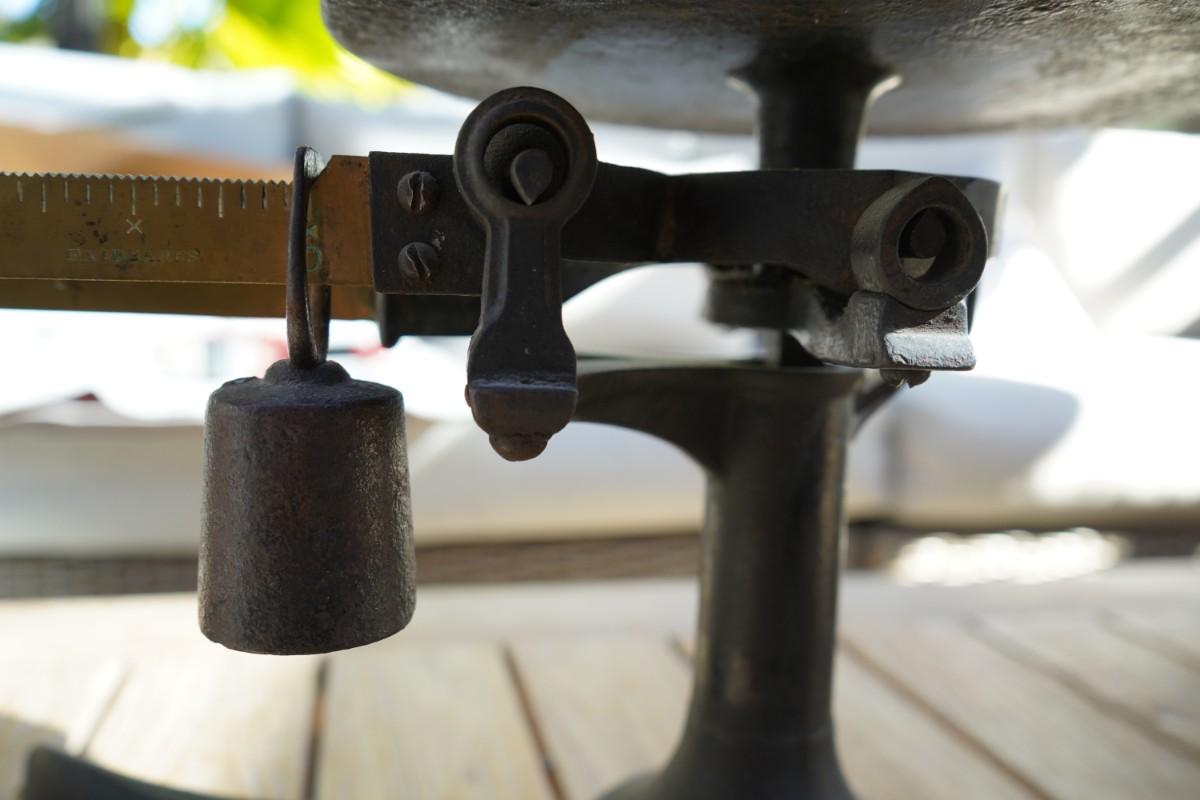 Crow's foot brass and cast iron scale balance with weights and measures. Measures 20.25 W x 9.75 D x 10.25 H.