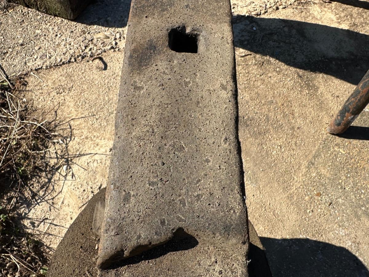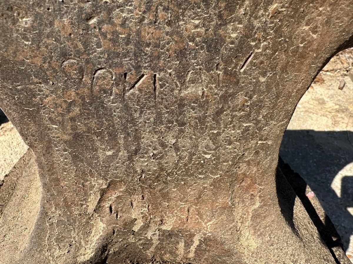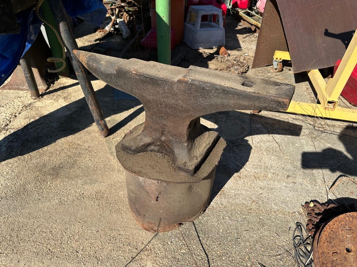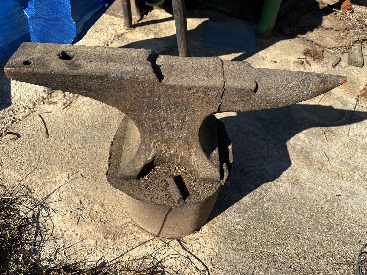 Heavy antique blacksmith anvil mounted on a cylindrical steel stand. Traditional London-pattern style with tapered horn, square hardy hole, and pritchel hole. Faint stamped marking visible on the waist (appears hand-stamped, not clearly legible due to age).