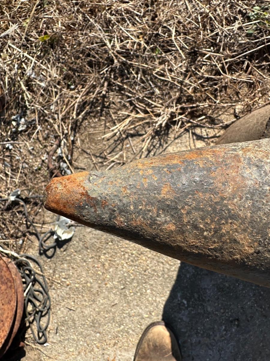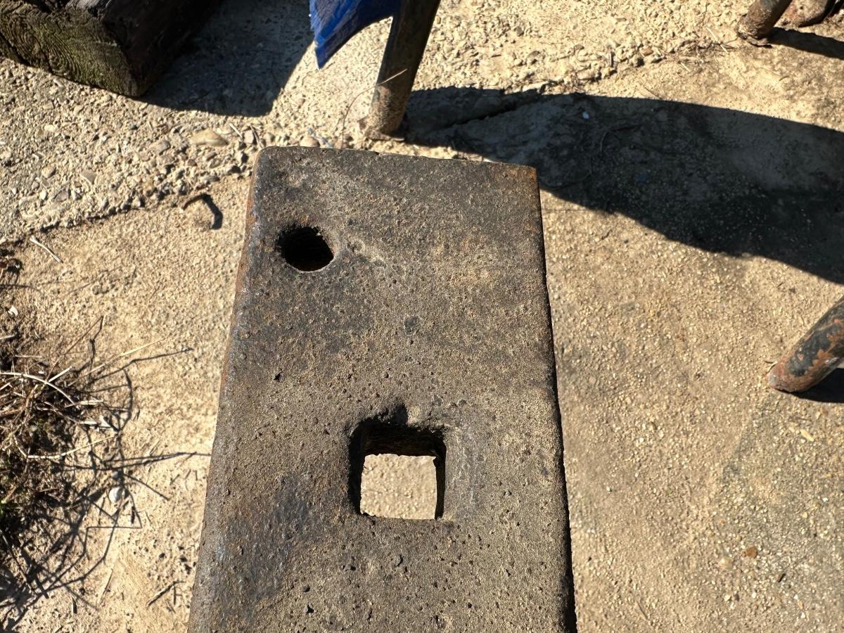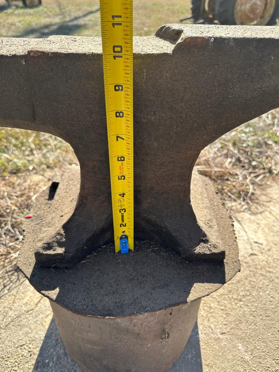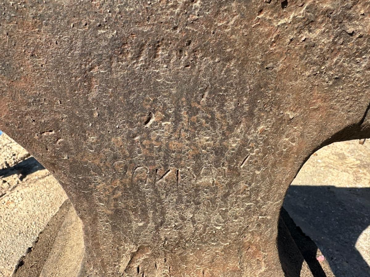 Heavy antique blacksmith anvil mounted on a cylindrical steel stand. Traditional London-pattern style with tapered horn, square hardy hole, and pritchel hole. Faint stamped marking visible on the waist (appears hand-stamped, not clearly legible due to age).