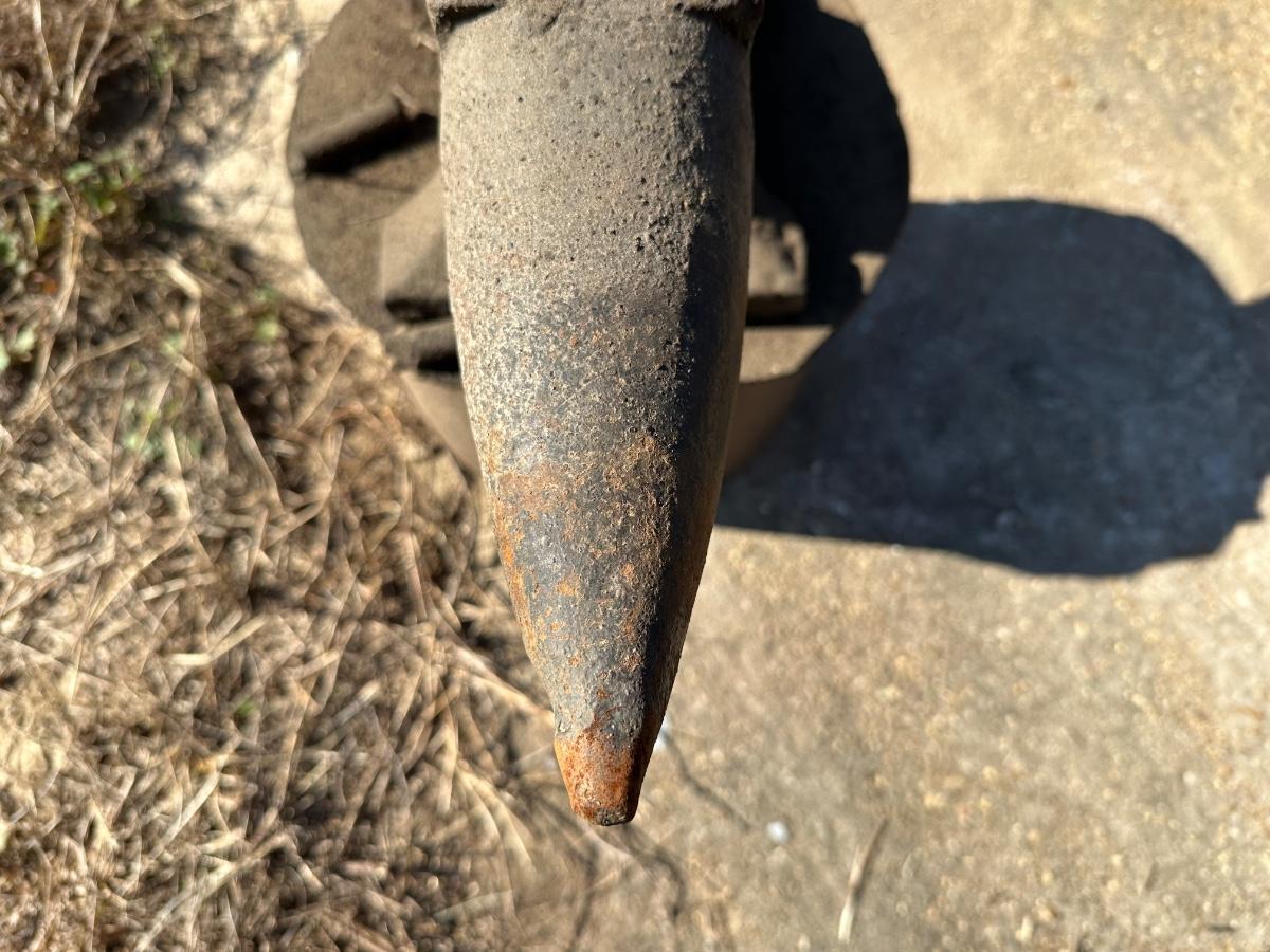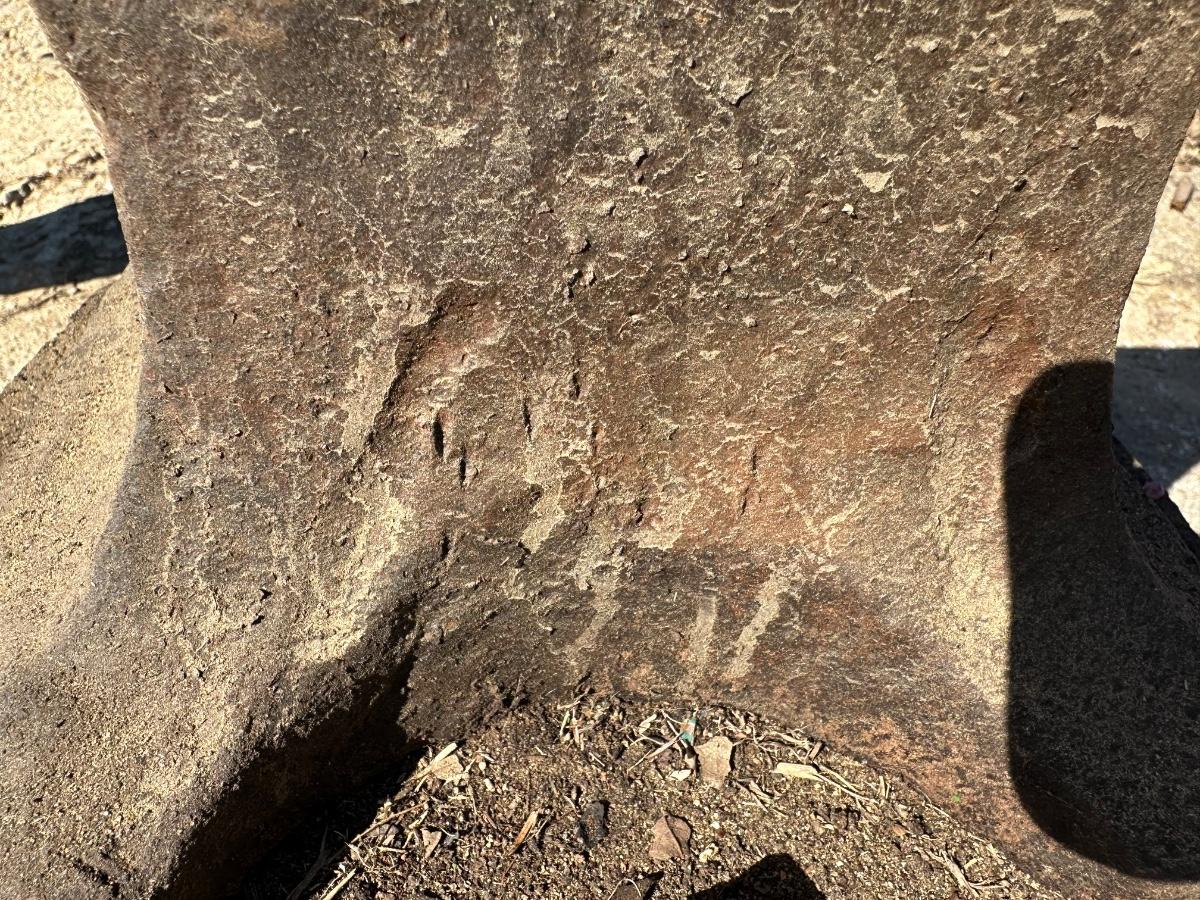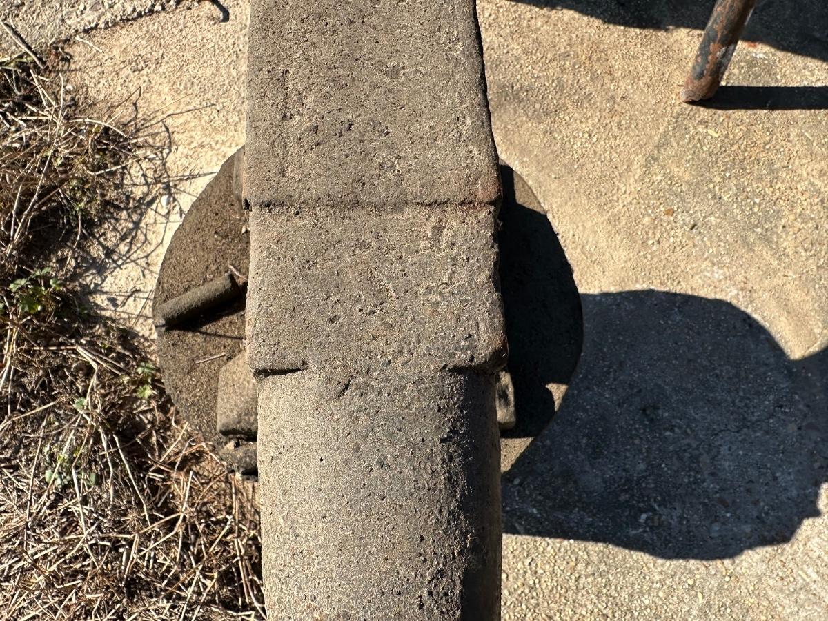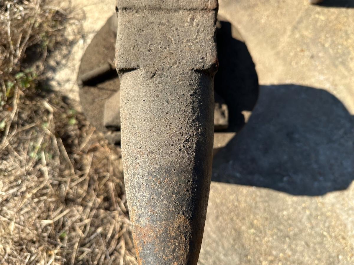 Heavy antique blacksmith anvil mounted on a cylindrical steel stand. Traditional London-pattern style with tapered horn, square hardy hole, and pritchel hole. Faint stamped marking visible on the waist (appears hand-stamped, not clearly legible due to age).