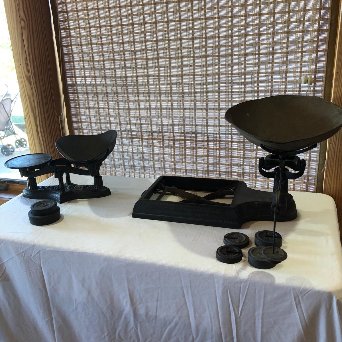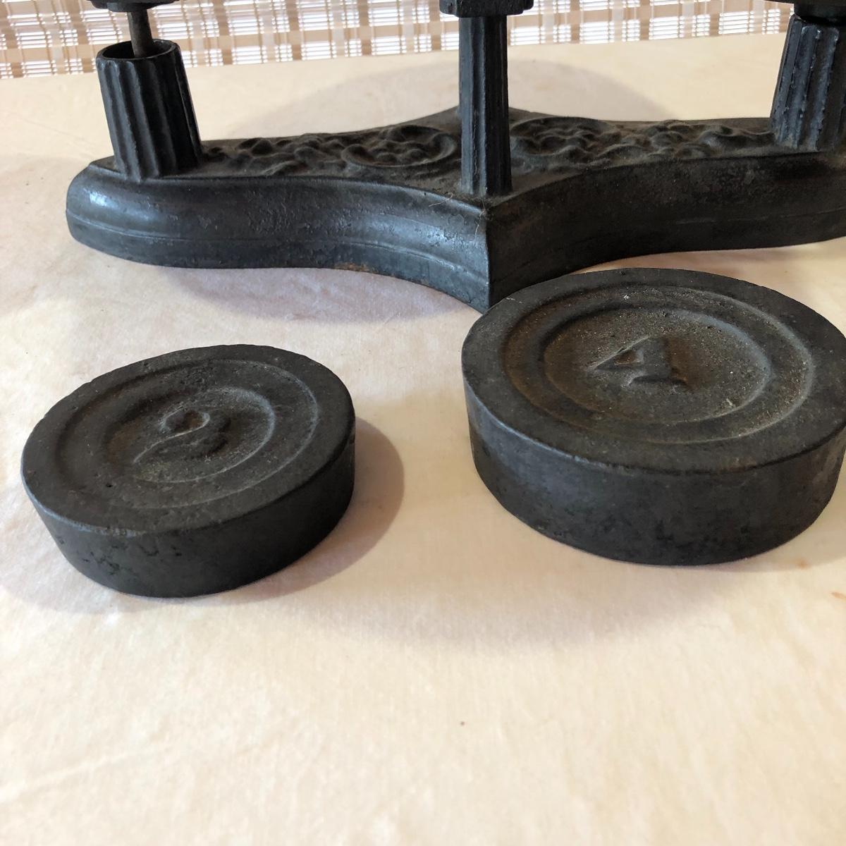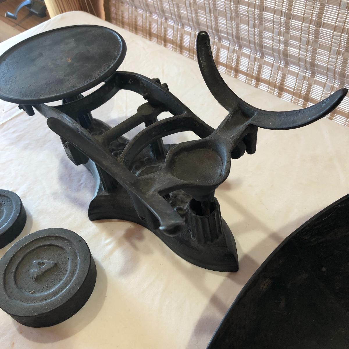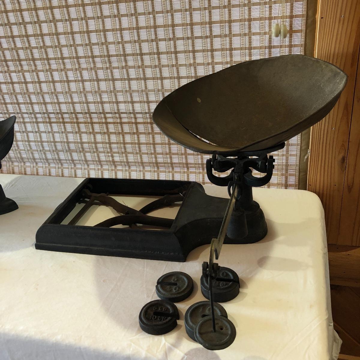 The antique cast iron candy hardware balance scale comes with 2 weights (2 & 4 lb). It measures 14” x 16” x 9”. The antique Fox Cast iron counter scale from a general store is missing the platform and u-connector. It comes with 4 weights (two each 5 lb & 10 lb weights). Note the basket has come apart a bit at the seams. Local pick up only.