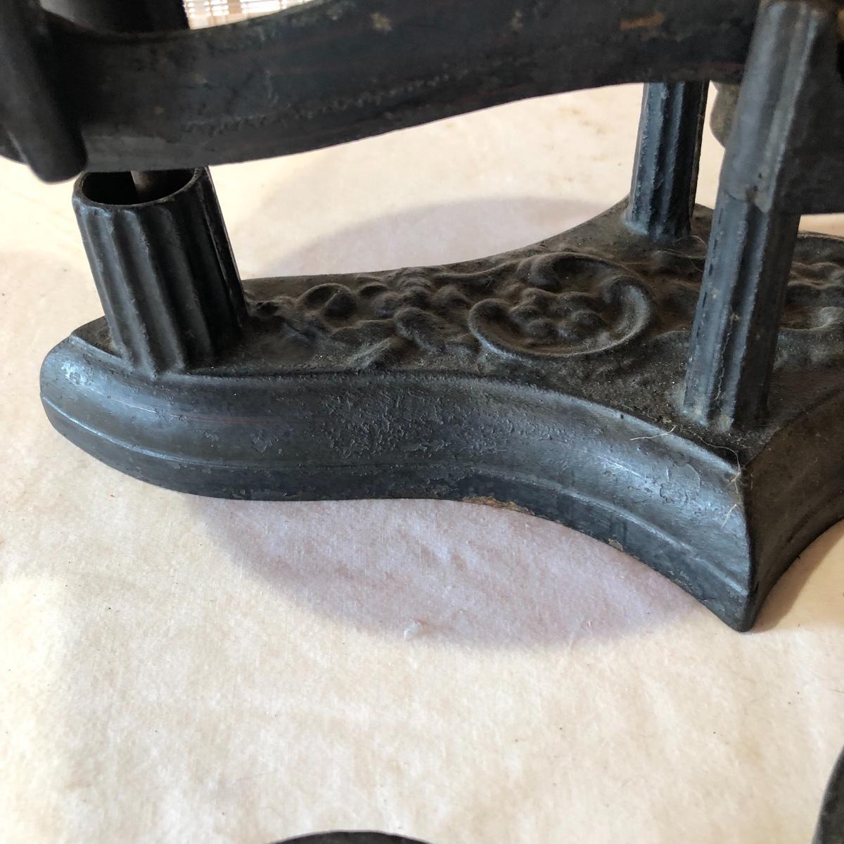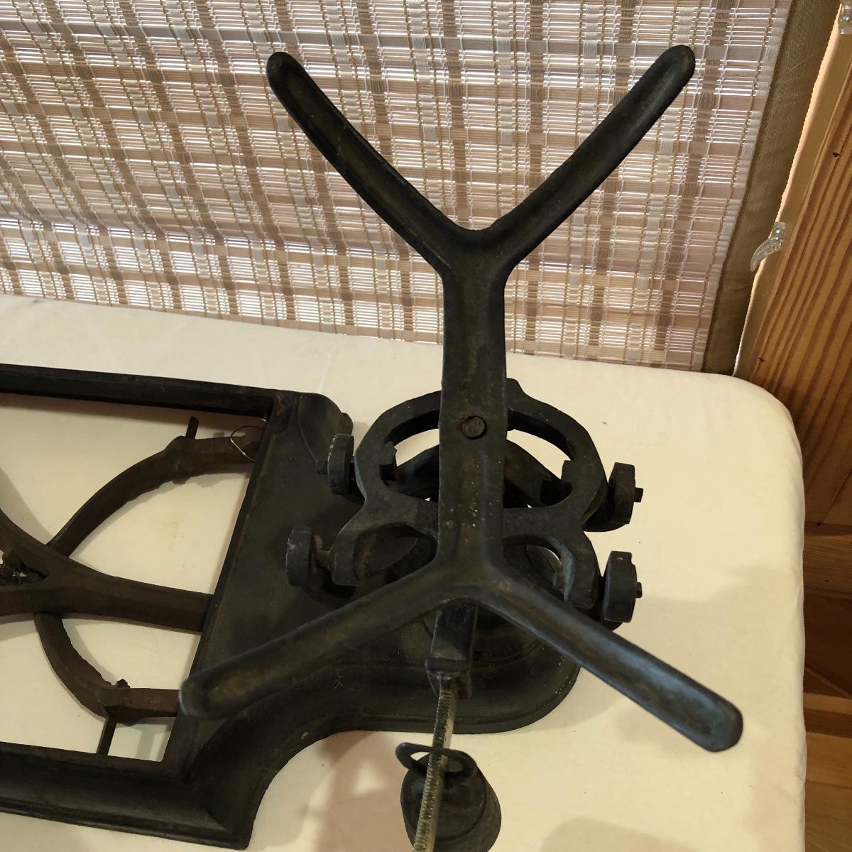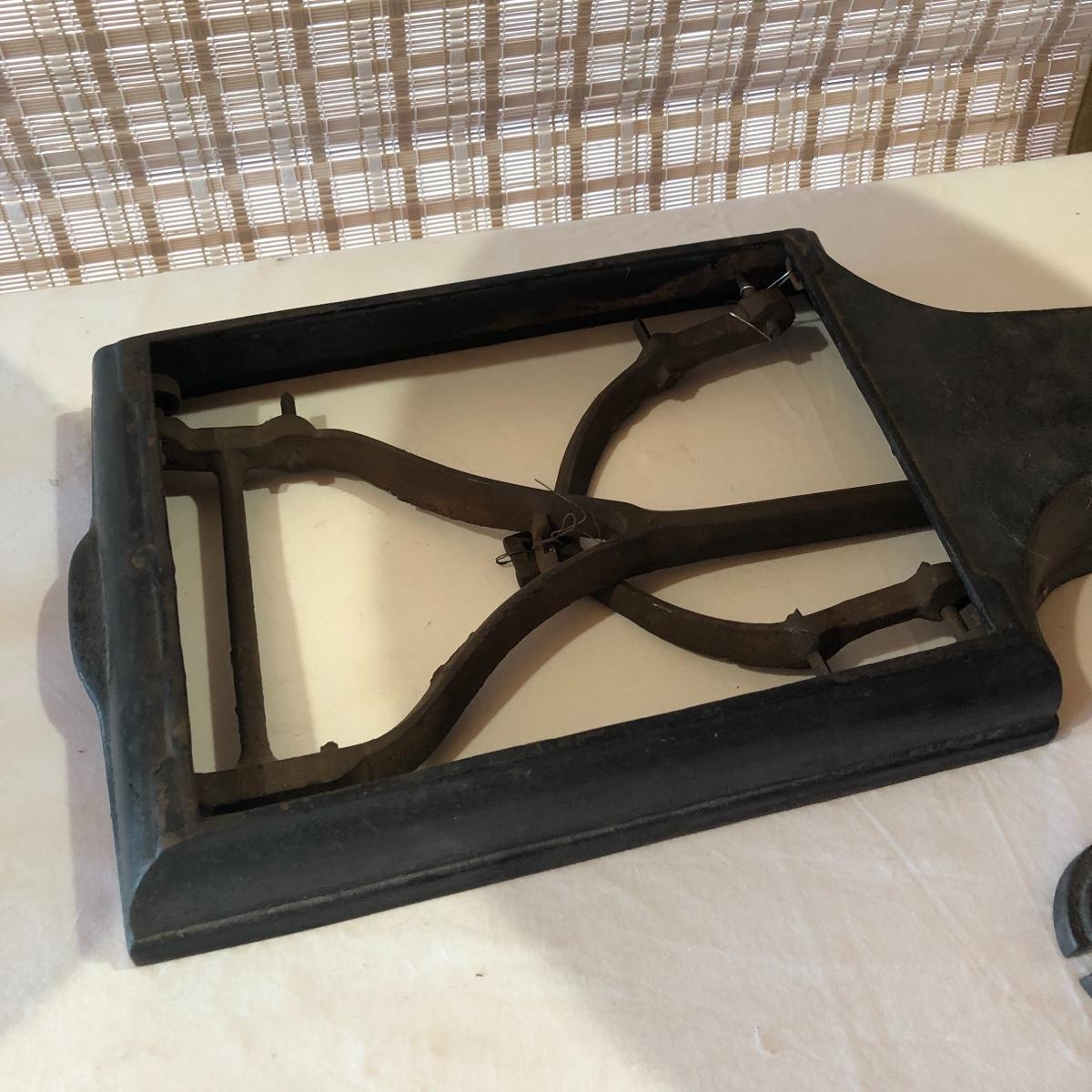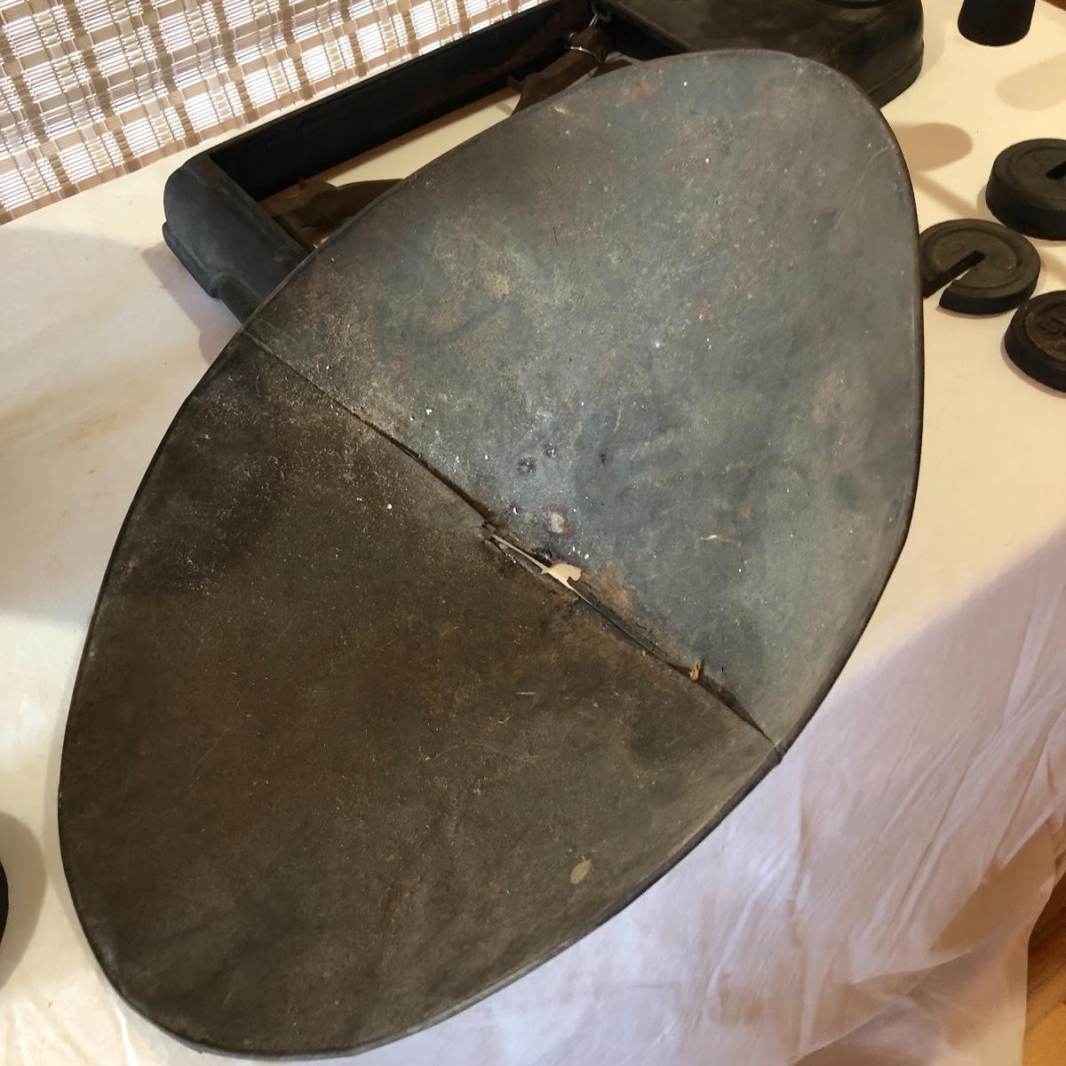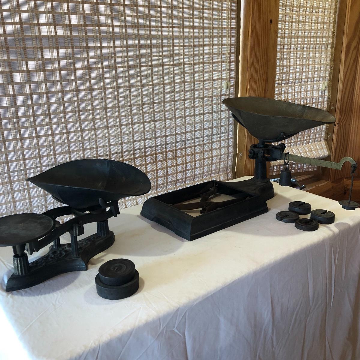 The antique cast iron candy hardware balance scale comes with 2 weights (2 & 4 lb). It measures 14” x 16” x 9”. The antique Fox Cast iron counter scale from a general store is missing the platform and u-connector. It comes with 4 weights (two each 5 lb & 10 lb weights). Note the basket has come apart a bit at the seams. Local pick up only.