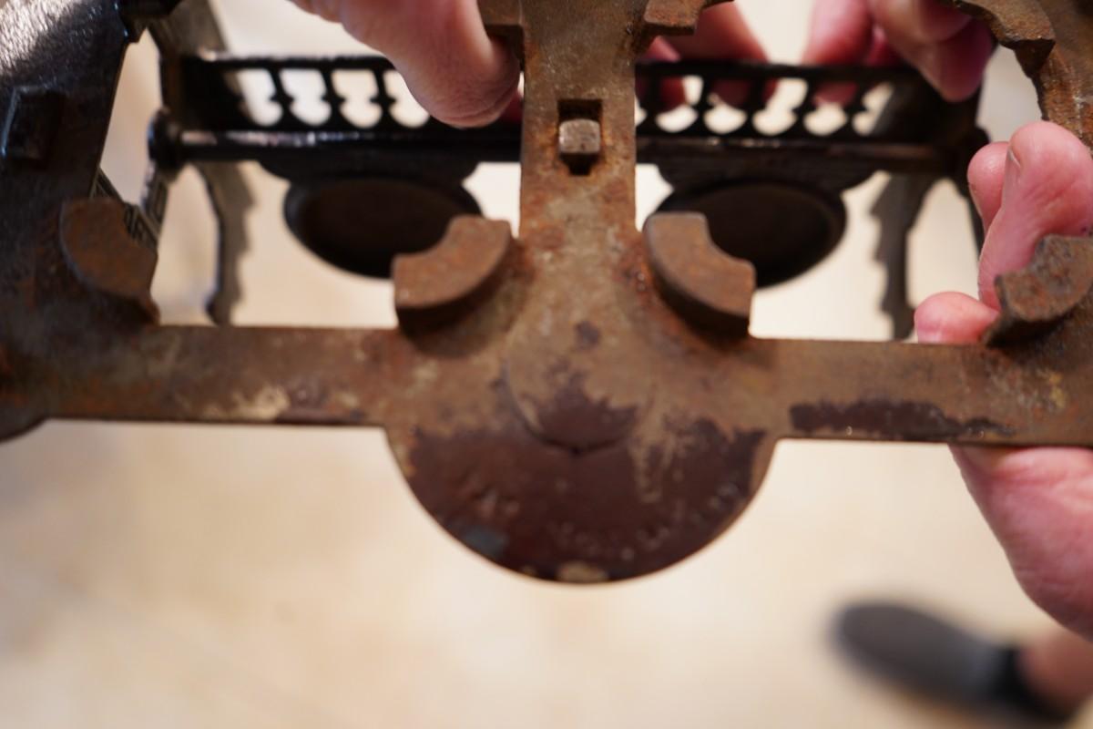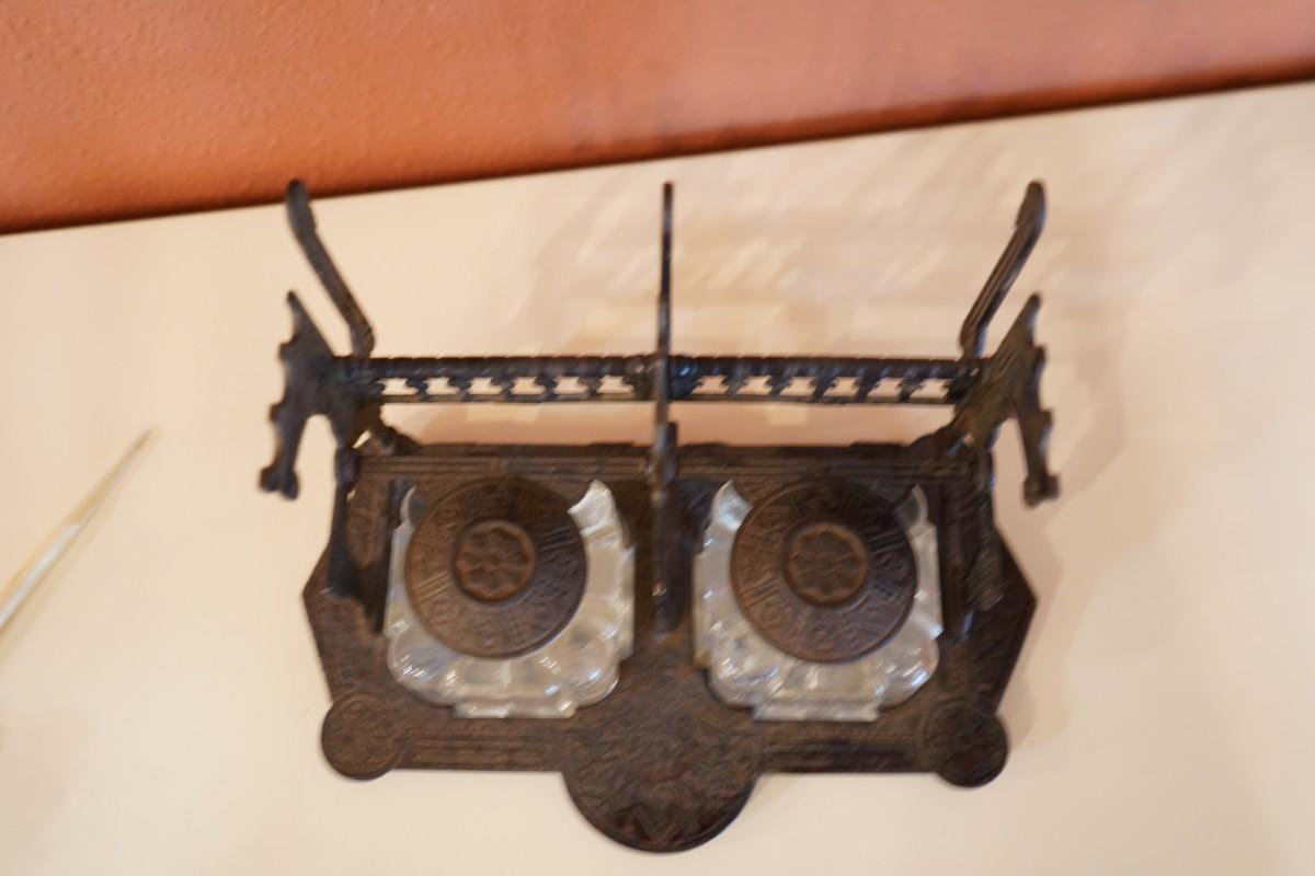 Cast iron and glass. Measures 9W x 5D x 5H.