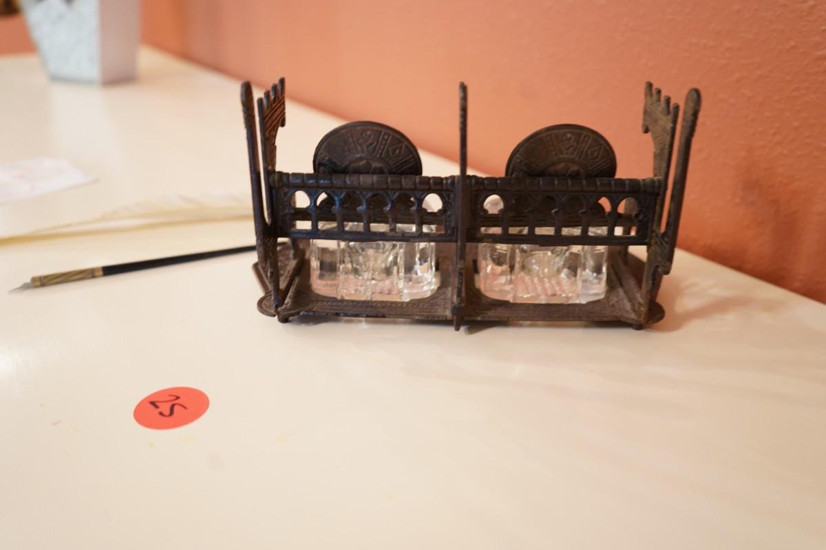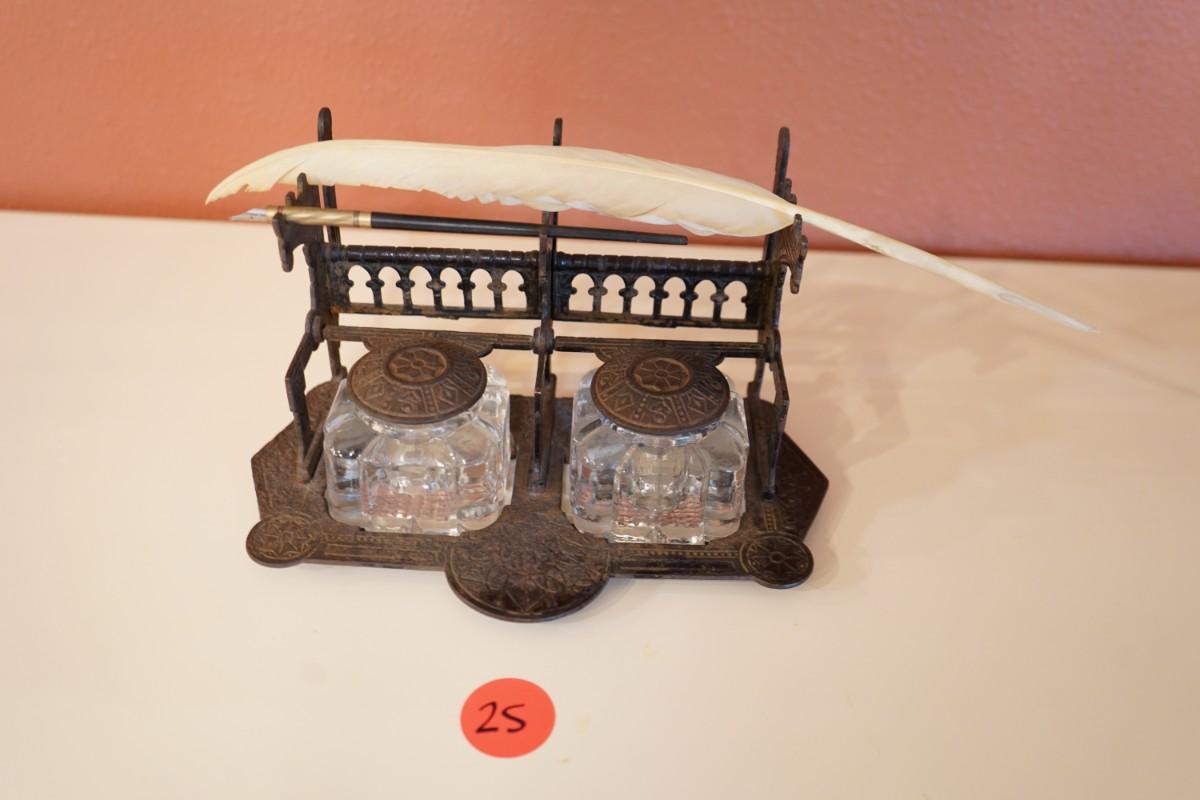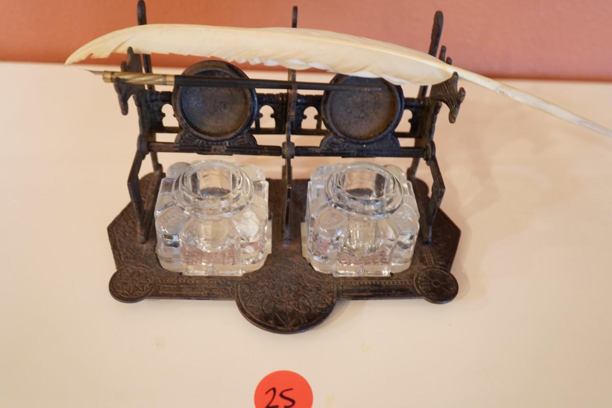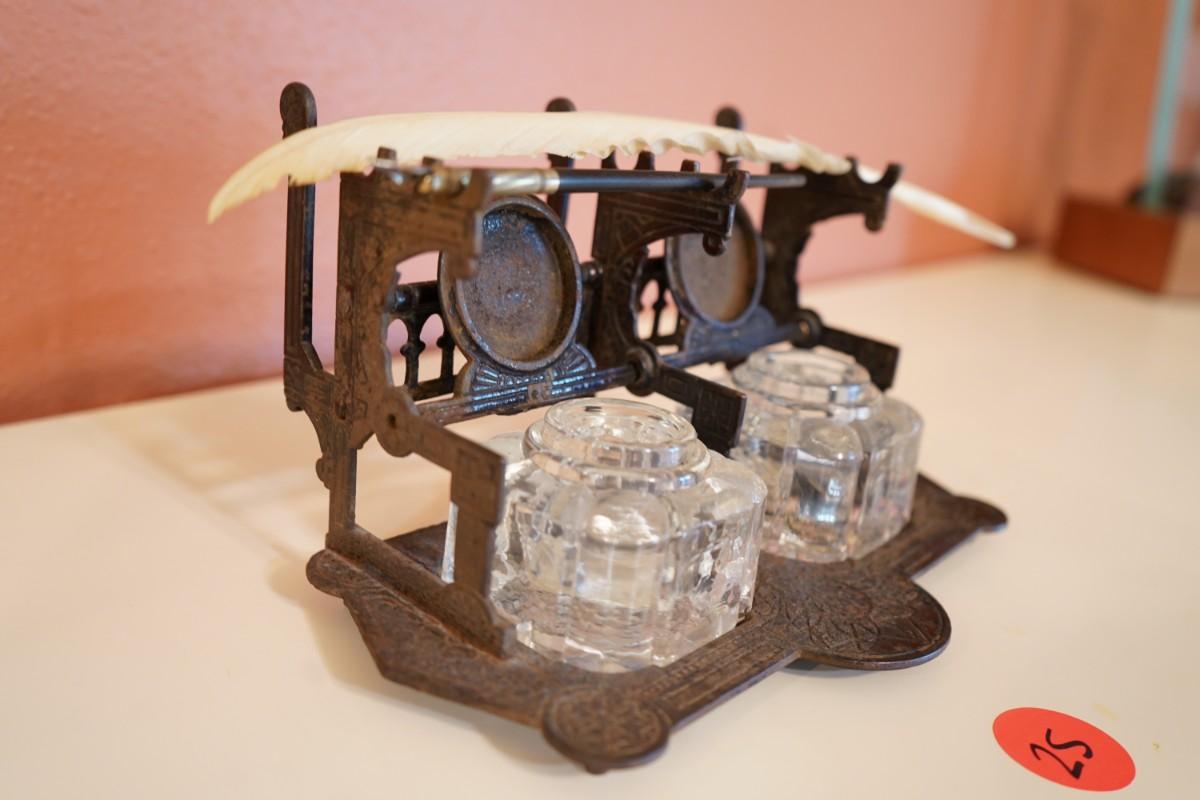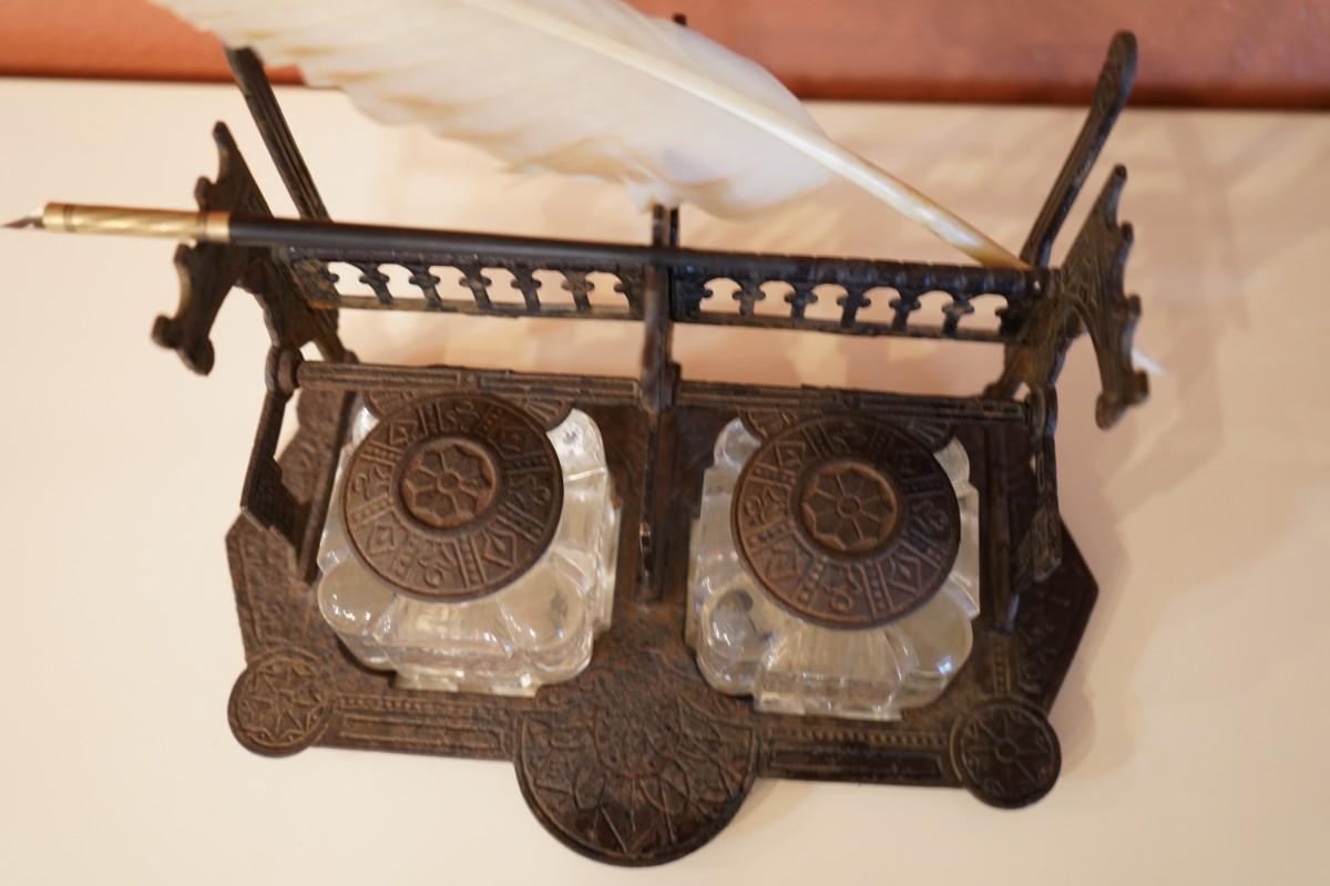 Antique Cast Iron Double Inkwell Desk Set