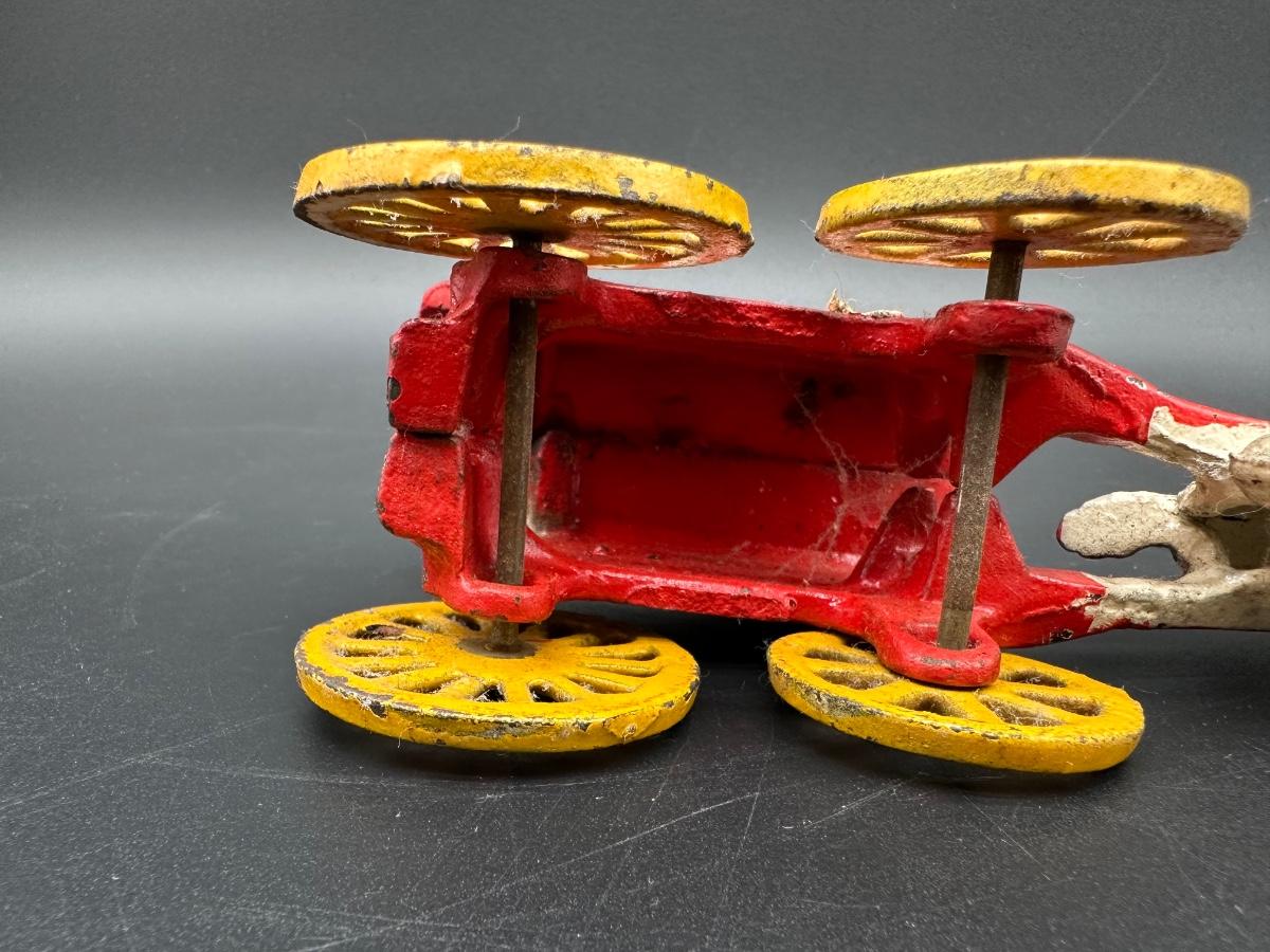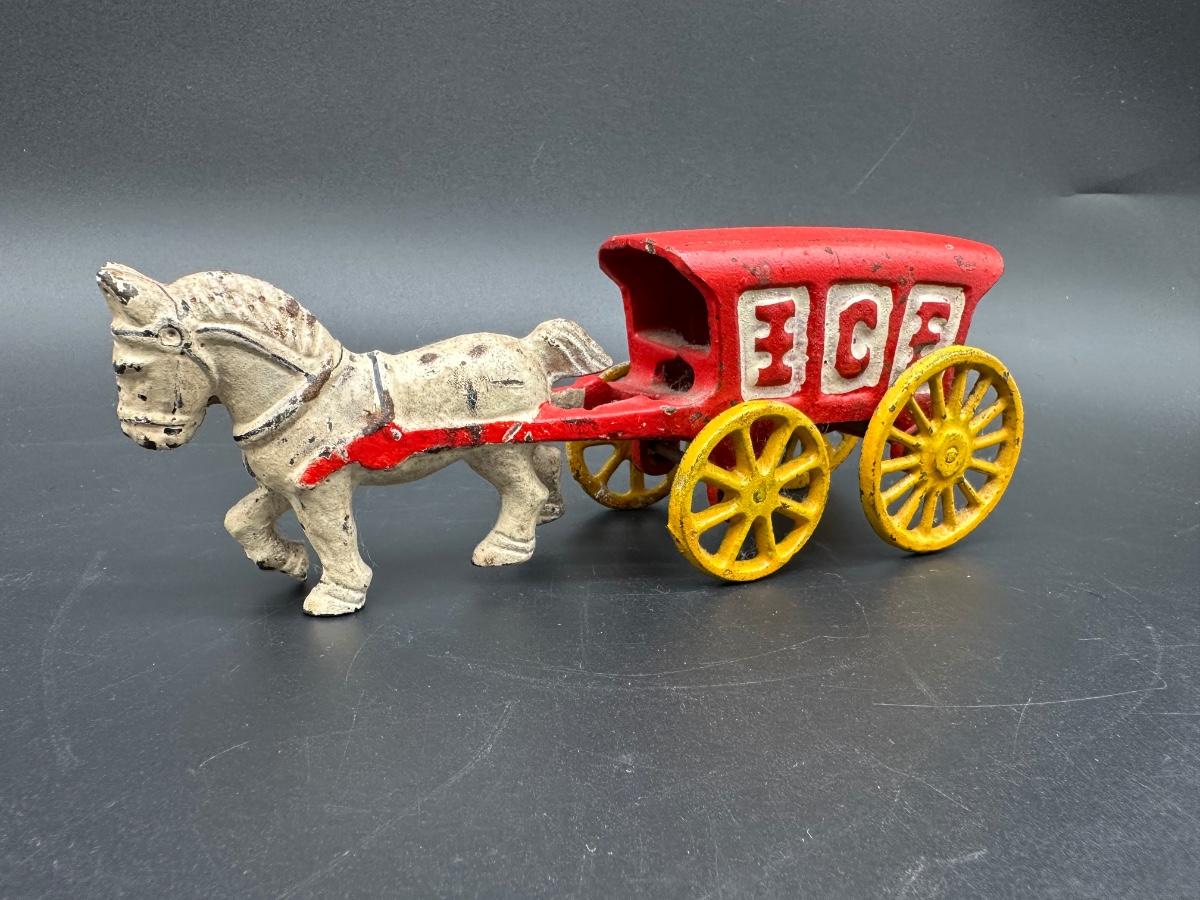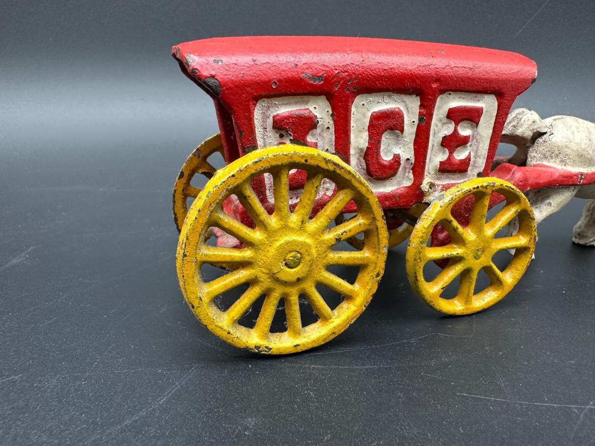 Antique cast iron horse and wagon featuring raised “ICE.” lettering on the wagon sides. Classic early 20th century style with yellow spoked wheels and red wagon body.