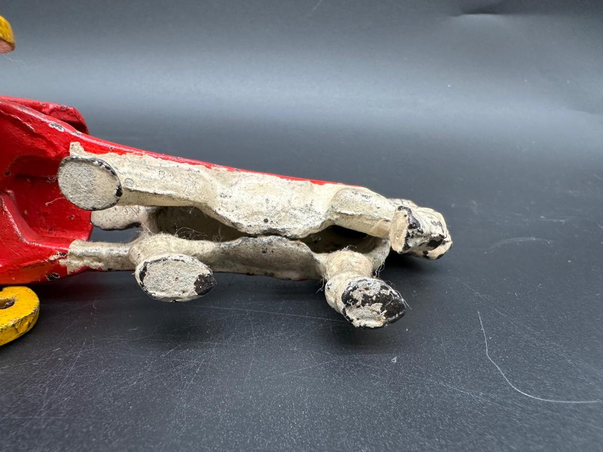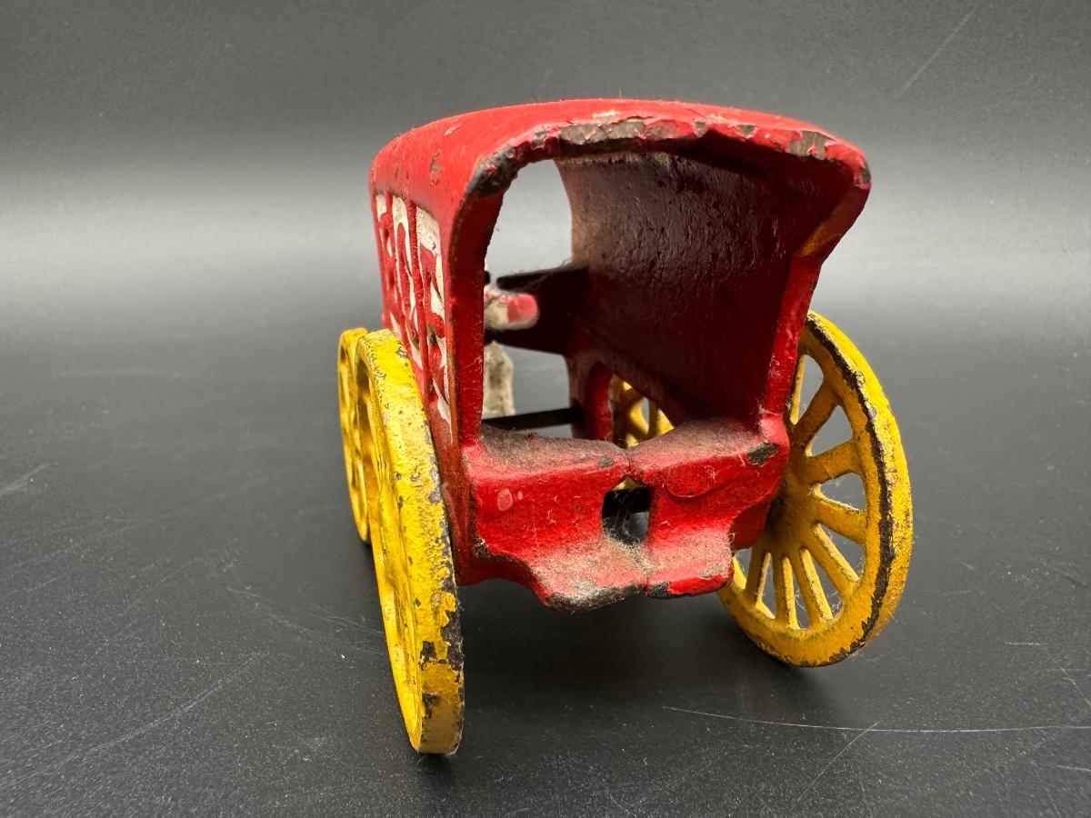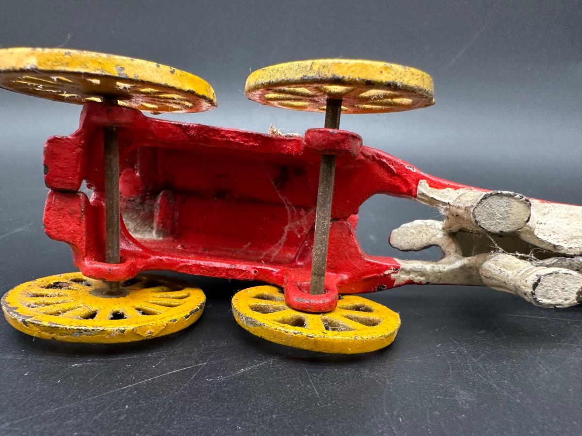 Antique cast iron horse and wagon featuring raised “ICE.” lettering on the wagon sides. Classic early 20th century style with yellow spoked wheels and red wagon body.