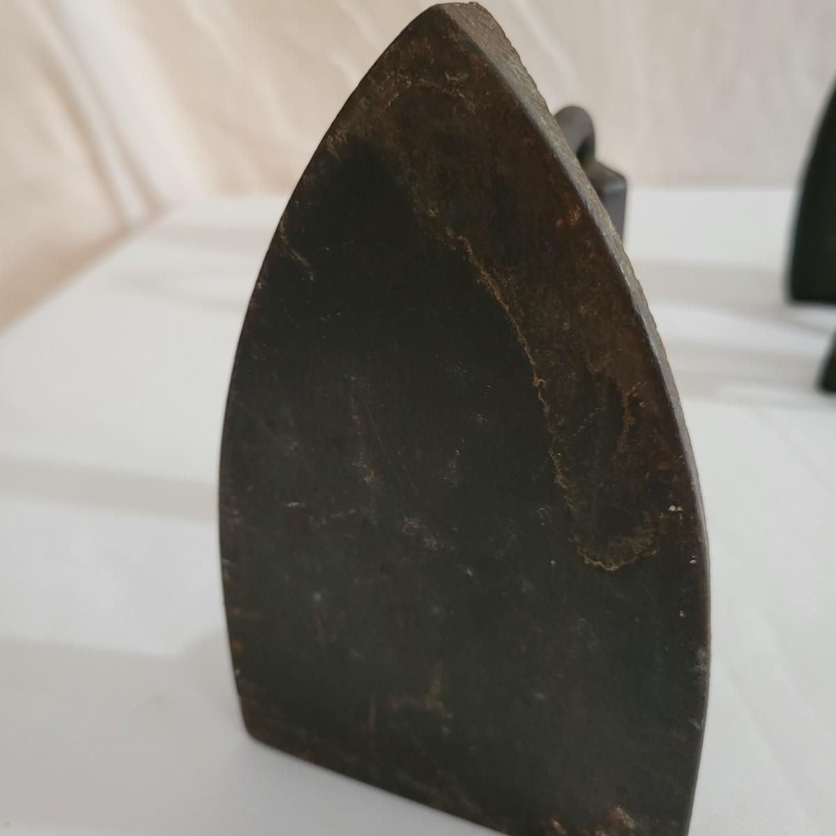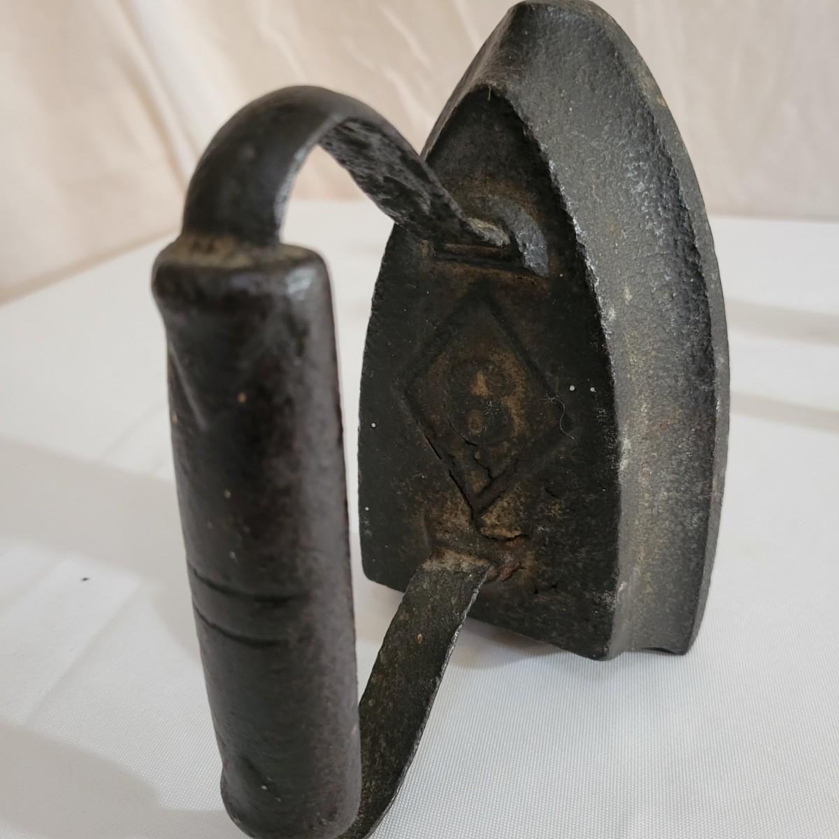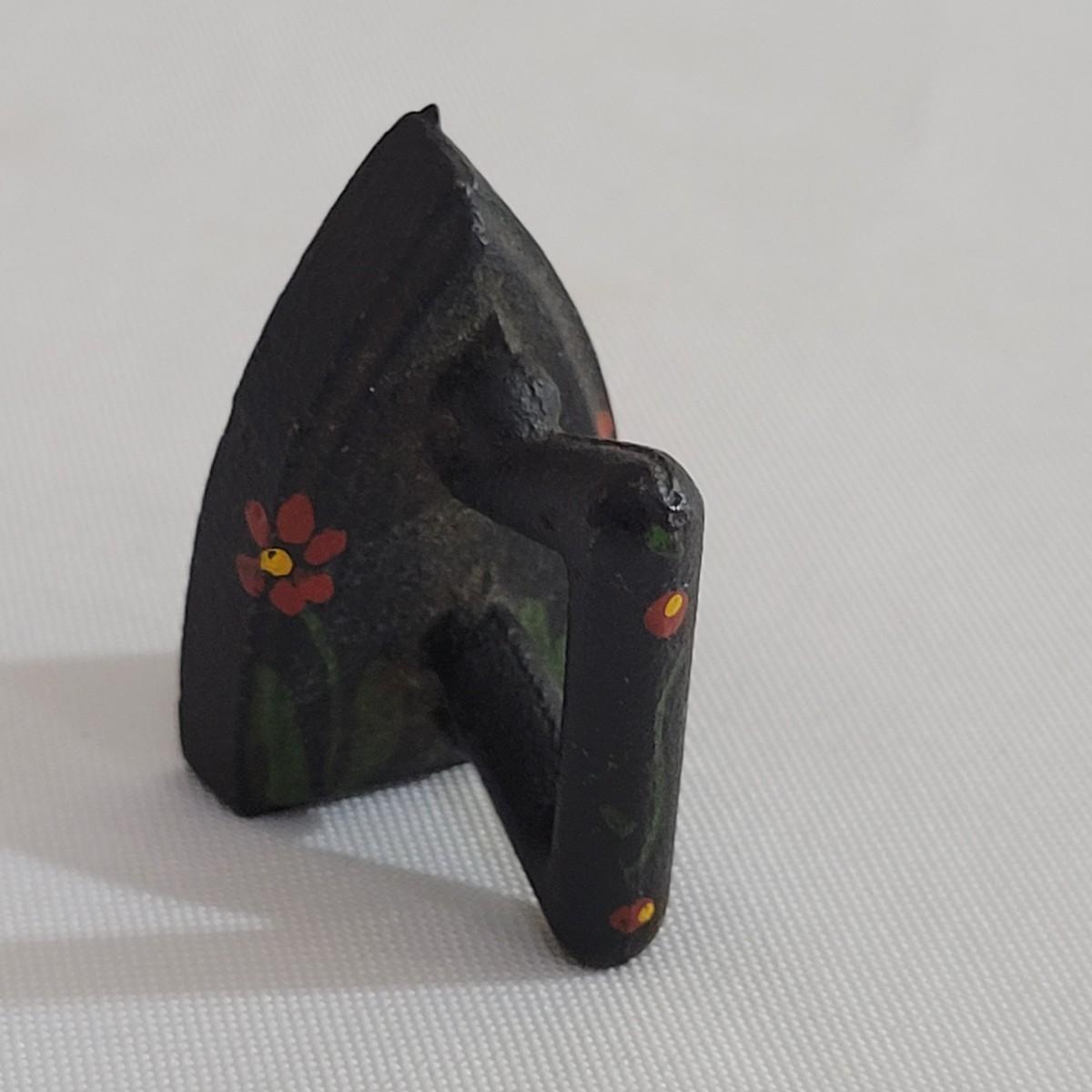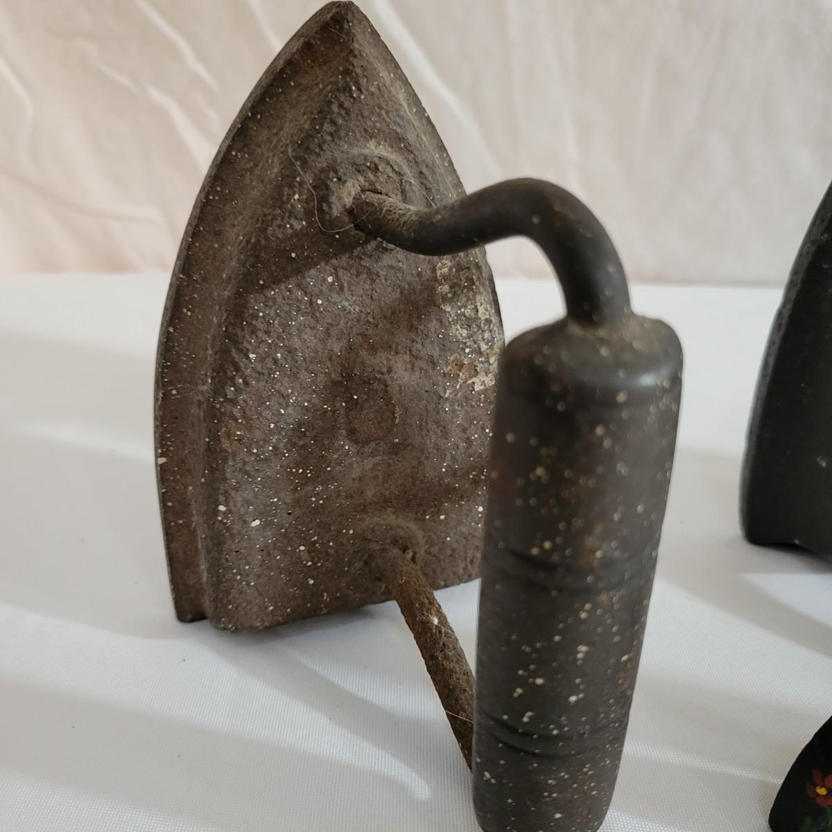 A collection of three antique irons and one tiny decorative iron in good condition. Two of the irons have paint stains on them and a little rust. Included is three antique irons, a 3, a 5 and a six. Also included is a tiny decorative iron with flowers painted on it. The #6 iron measures approximately 6" x 4" x 5". Shipping available. Shipping can be costly. We suggest calling our local UPS with dimensions and getting an estimate. 828-252-6930
