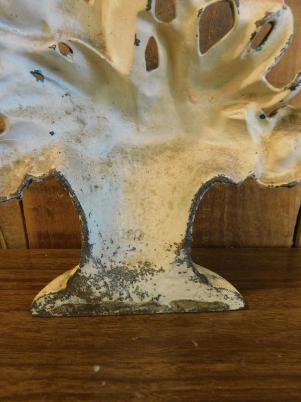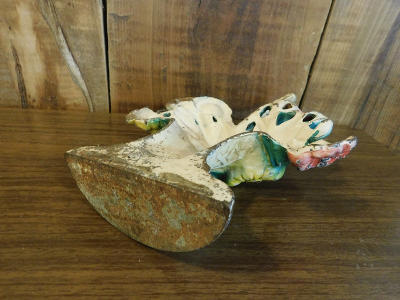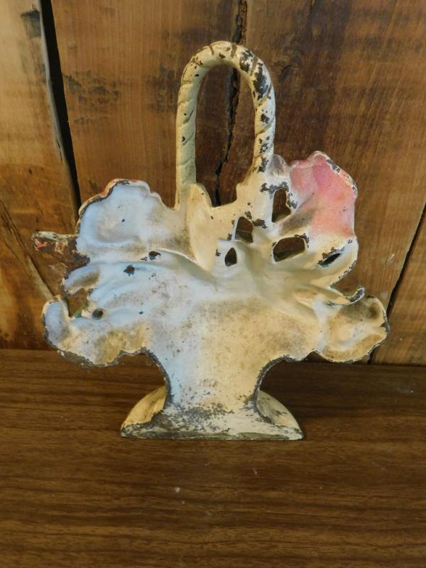 Antique Cast Iron Painted Flower Basket Door Stop is truly authentic cast piece and extremely heavy ..Paint wear and some oxidation on bottom of stop.