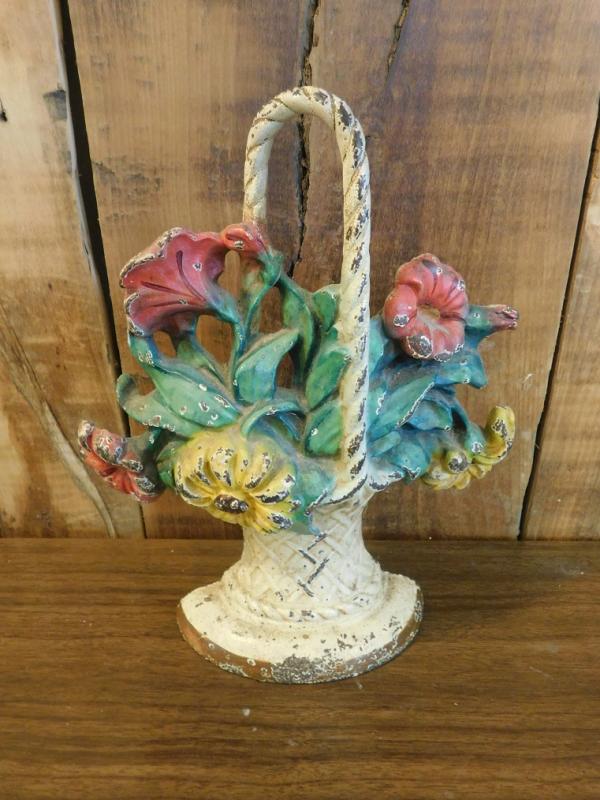 Antique Cast Iron Painted Flower Basket Door Stop
