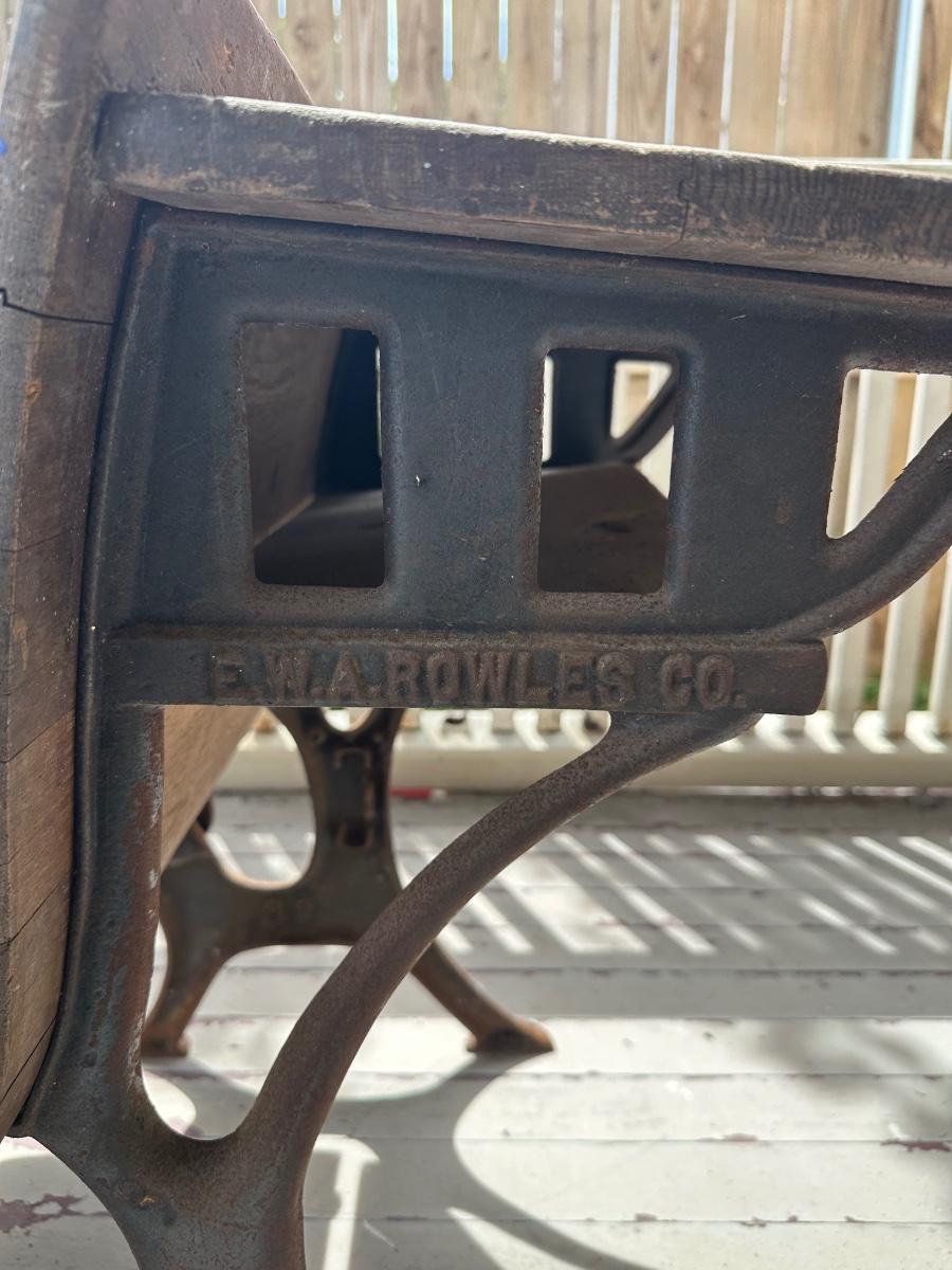 Pair of vintage school desks by E.W.A. Rowles Co., Chicago. Features original cast iron frames with embossed maker’s mark and wood seats/desktops. Surfaces show age and wear consistent with age. Structurally solid—great as-is or a restoration project.