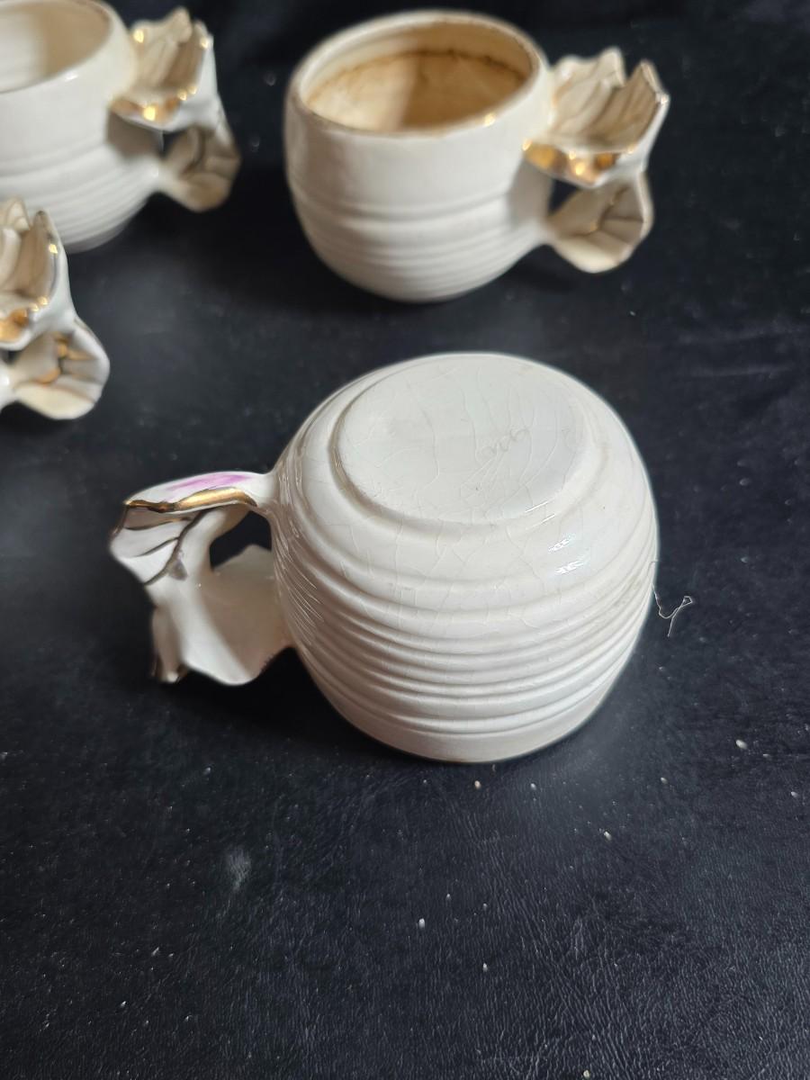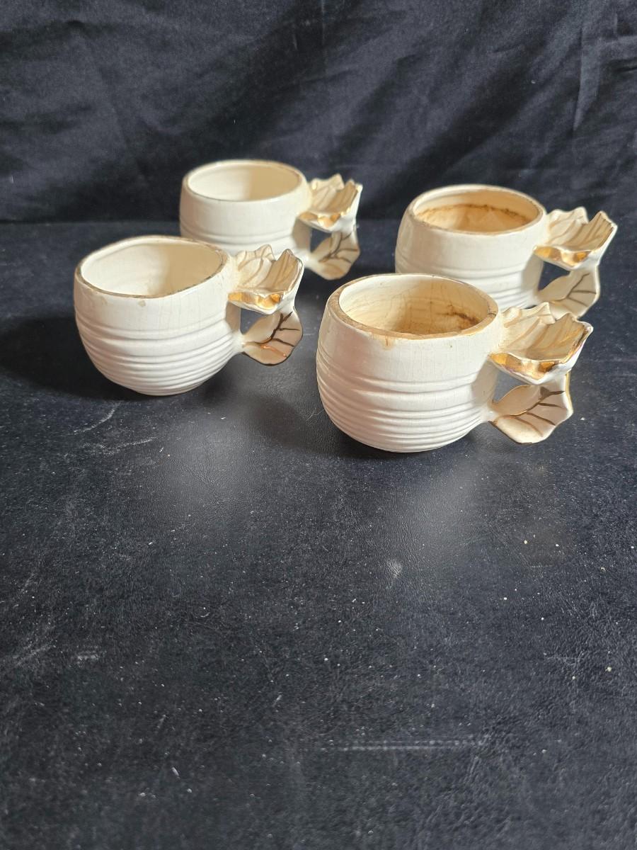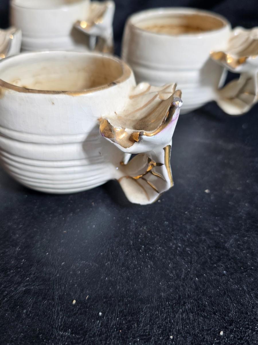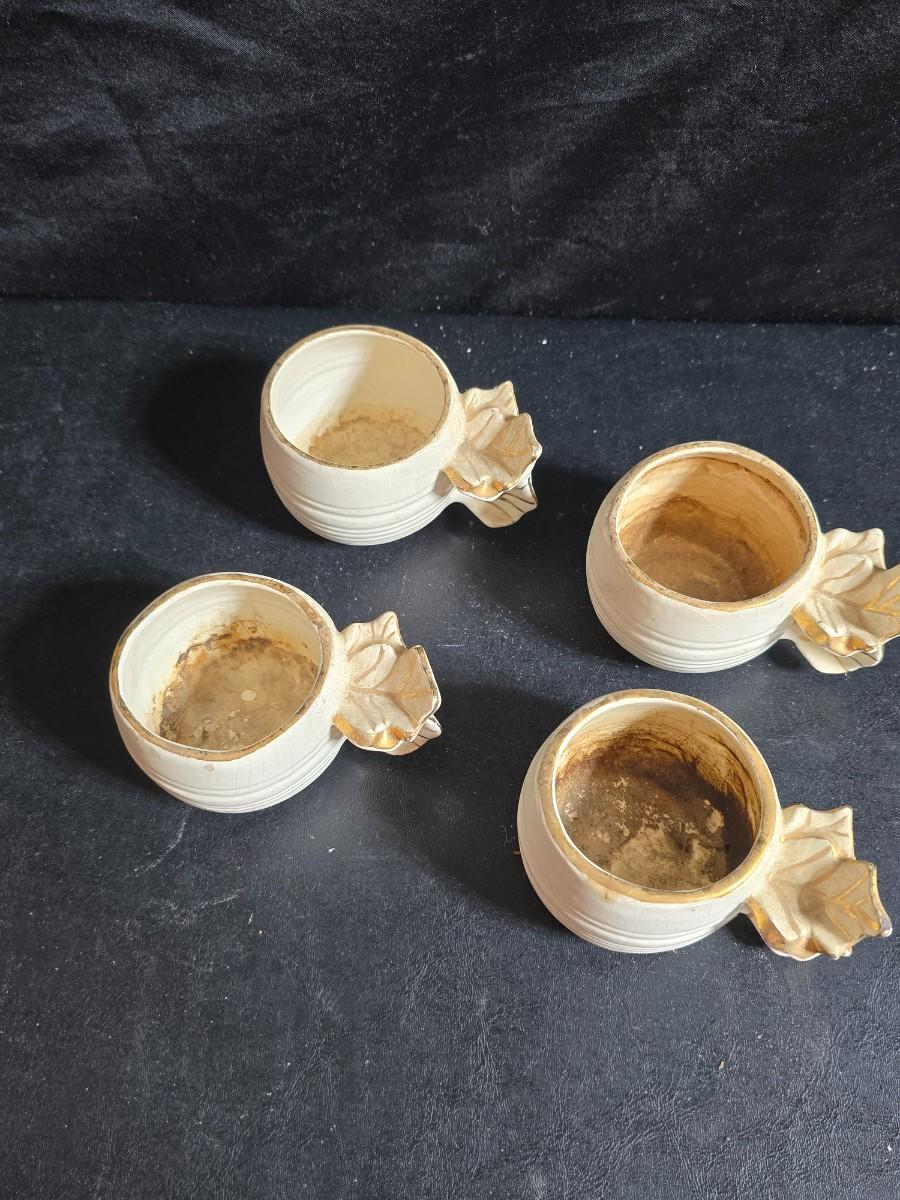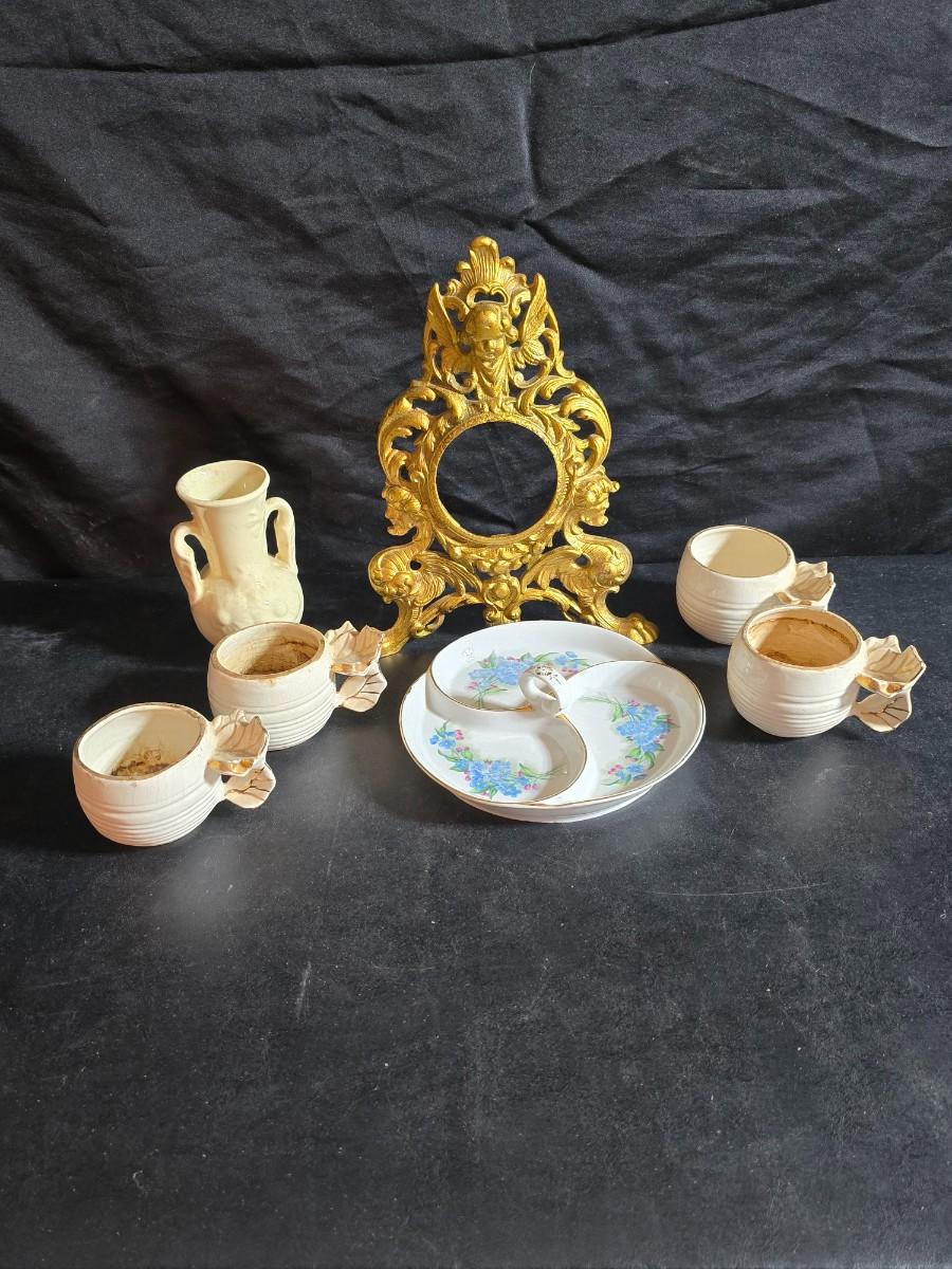 Antique cast metal gold guild clock face frame with Saja China dish - four small, vintage ceramic cups with leaf like handles and a small vase