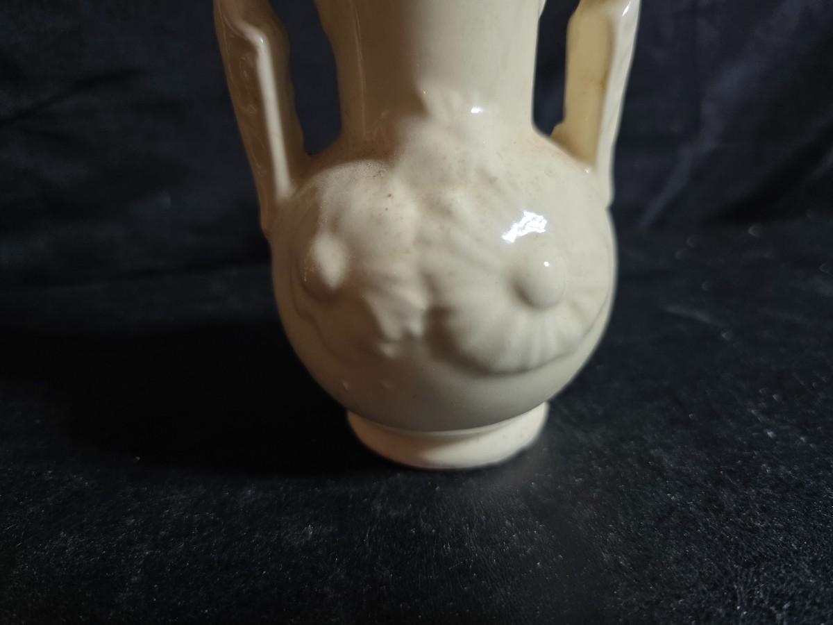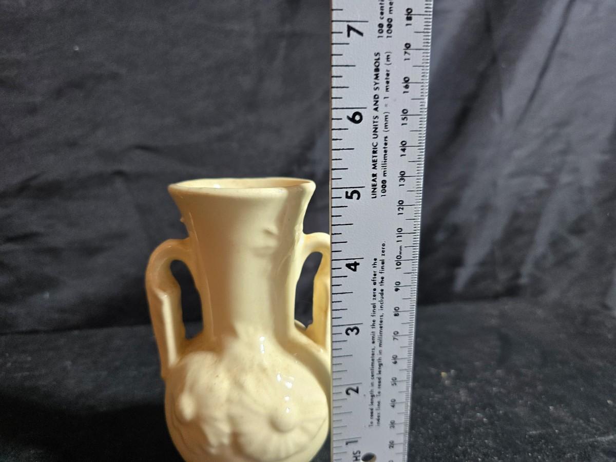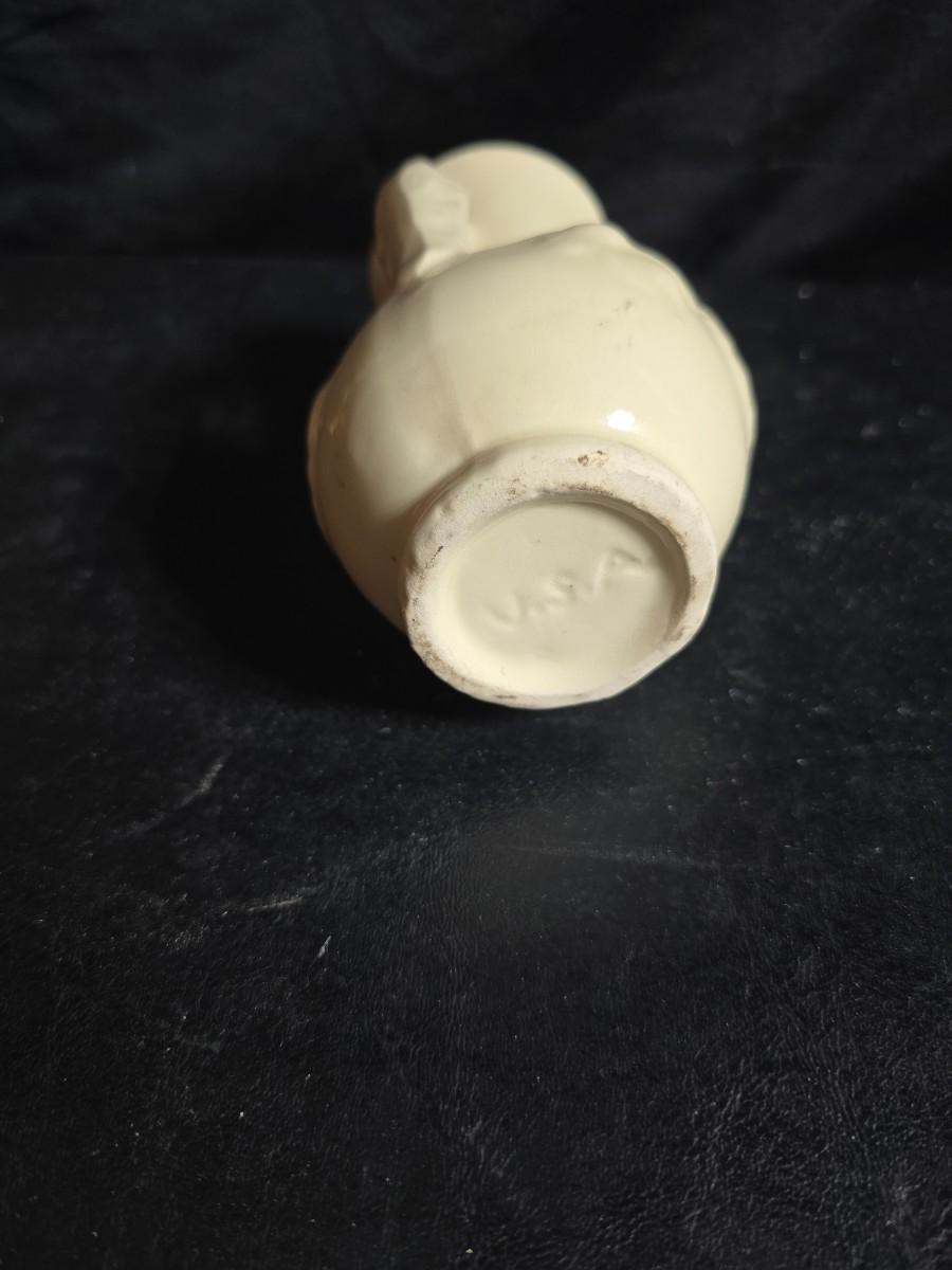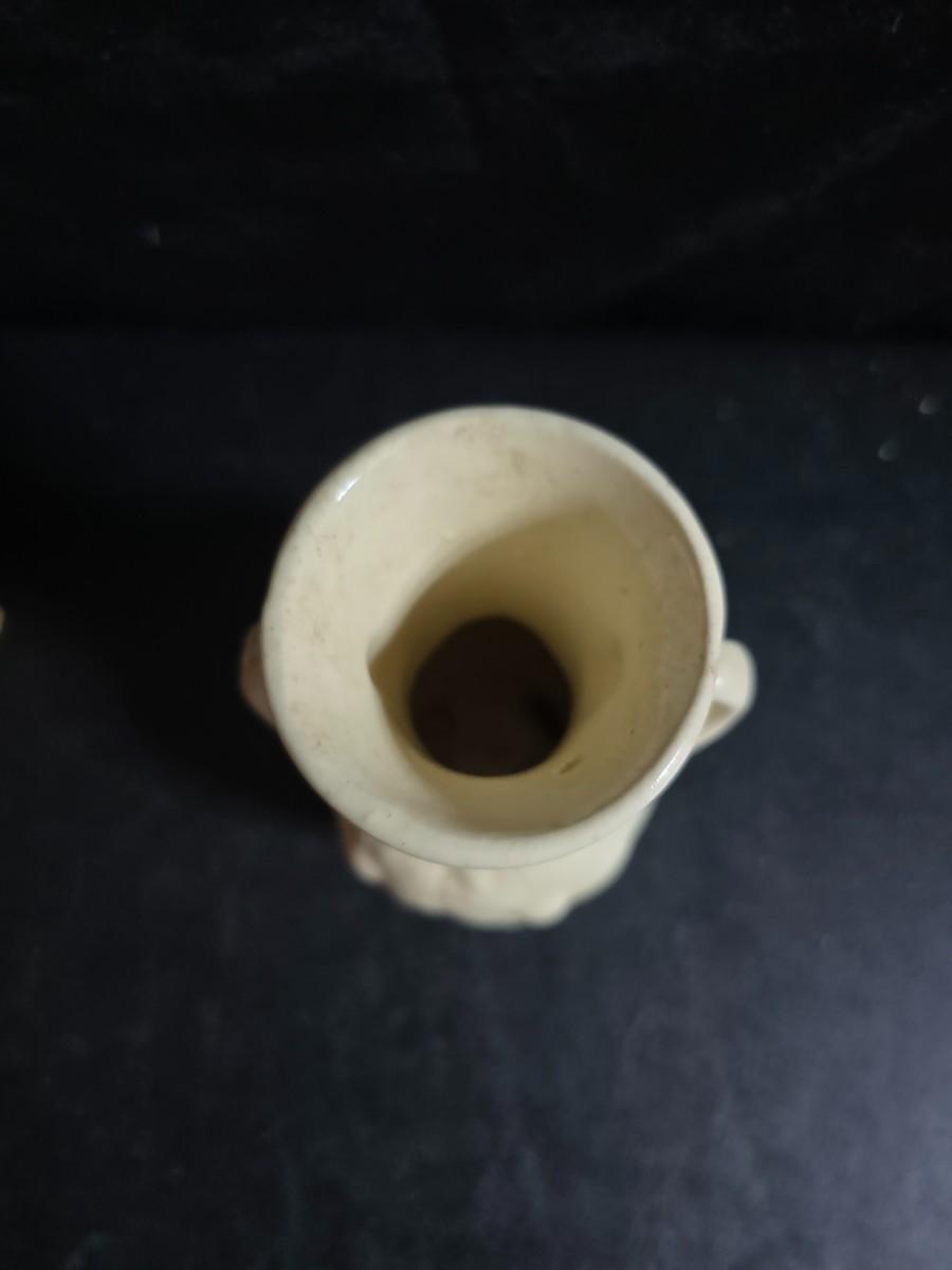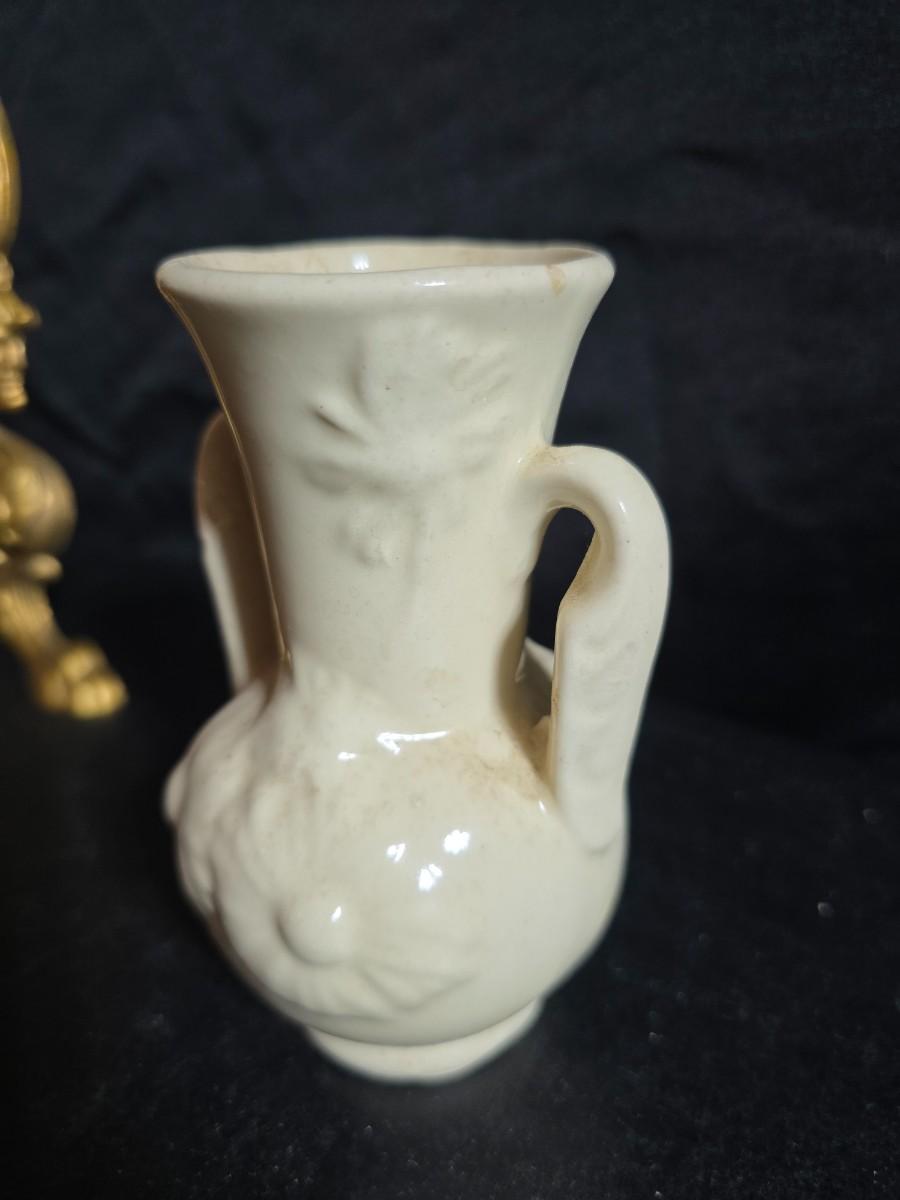 Antique cast metal gold guild clock face frame with Saja China dish - four small, vintage ceramic cups with leaf like handles and a small vase