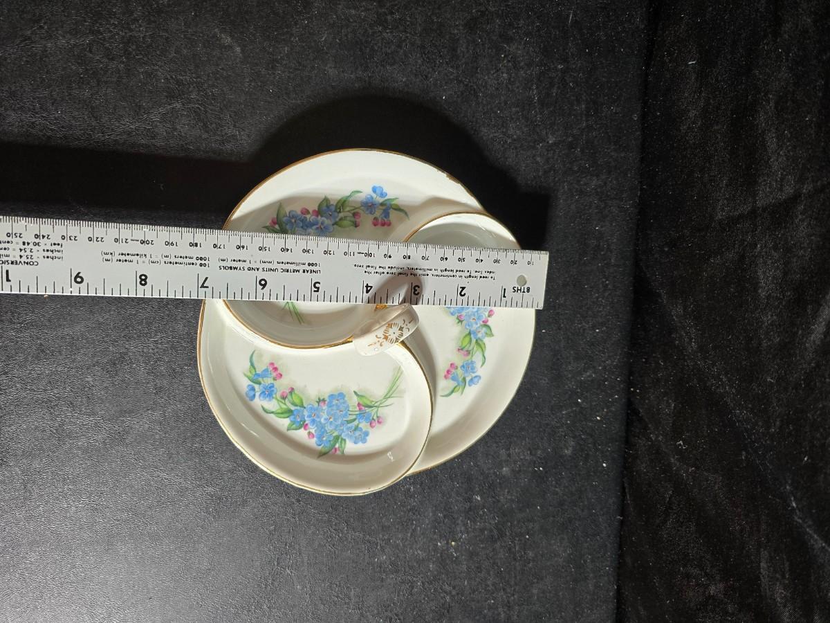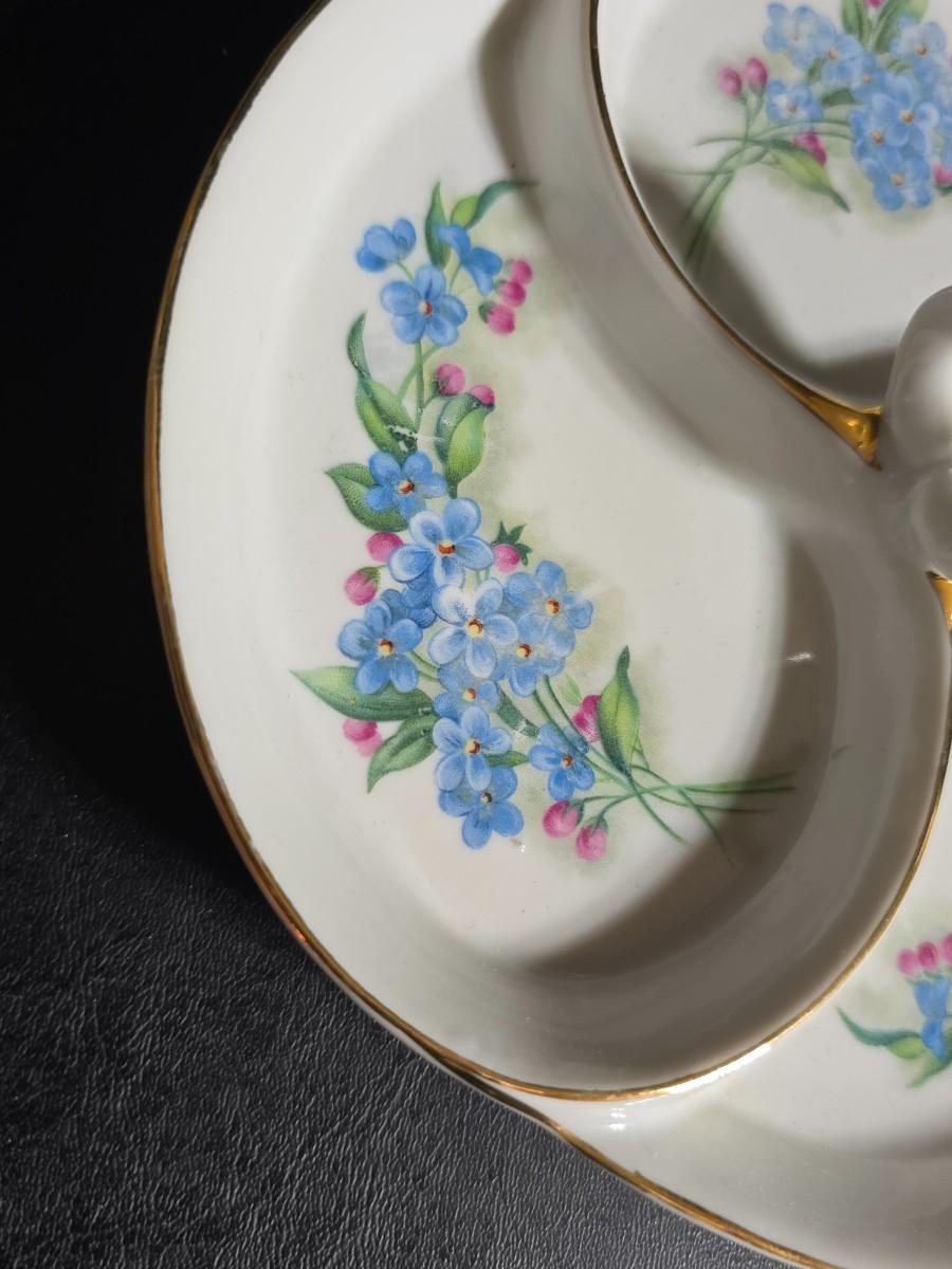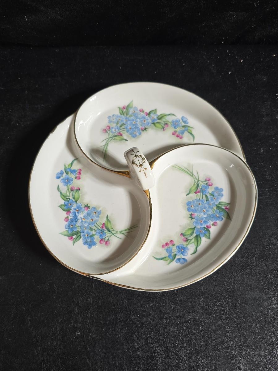Vintage Saji Fancy Fine China divided serving dish or tray with a center handle. It features a delicate blue floral "Forget-Me-Not" pattern with gold trim it is marked 6/579 on base.
