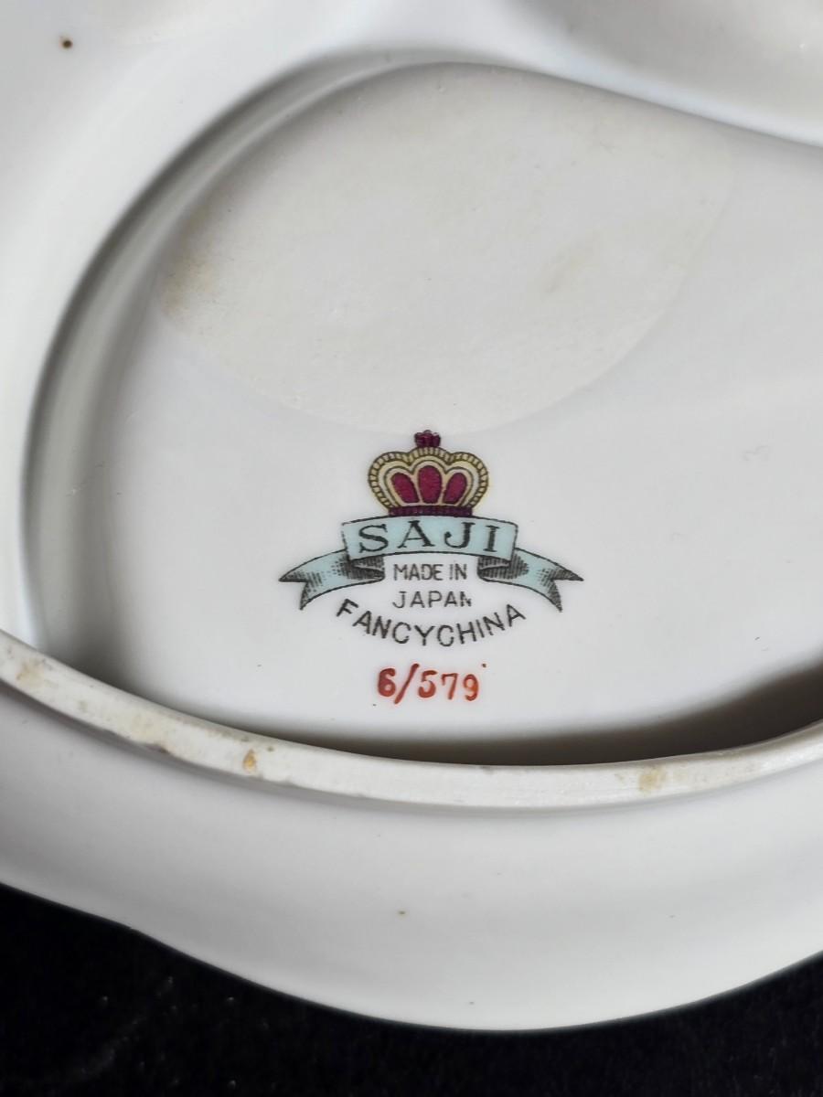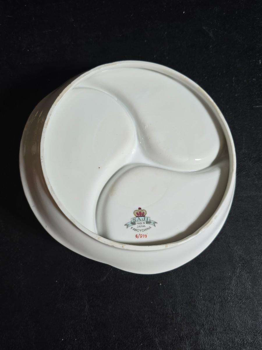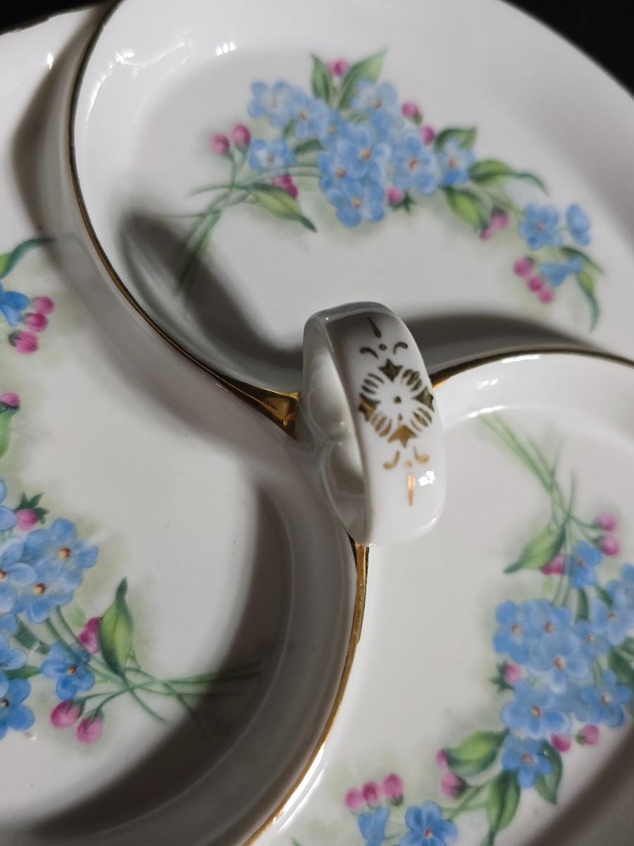 Vintage Saji Fancy Fine China divided serving dish or tray with a center handle. It features a delicate blue floral "Forget-Me-Not" pattern with gold trim it is marked 6/579 on base.