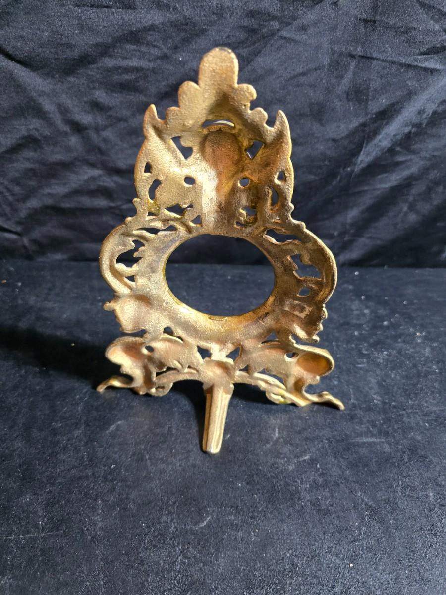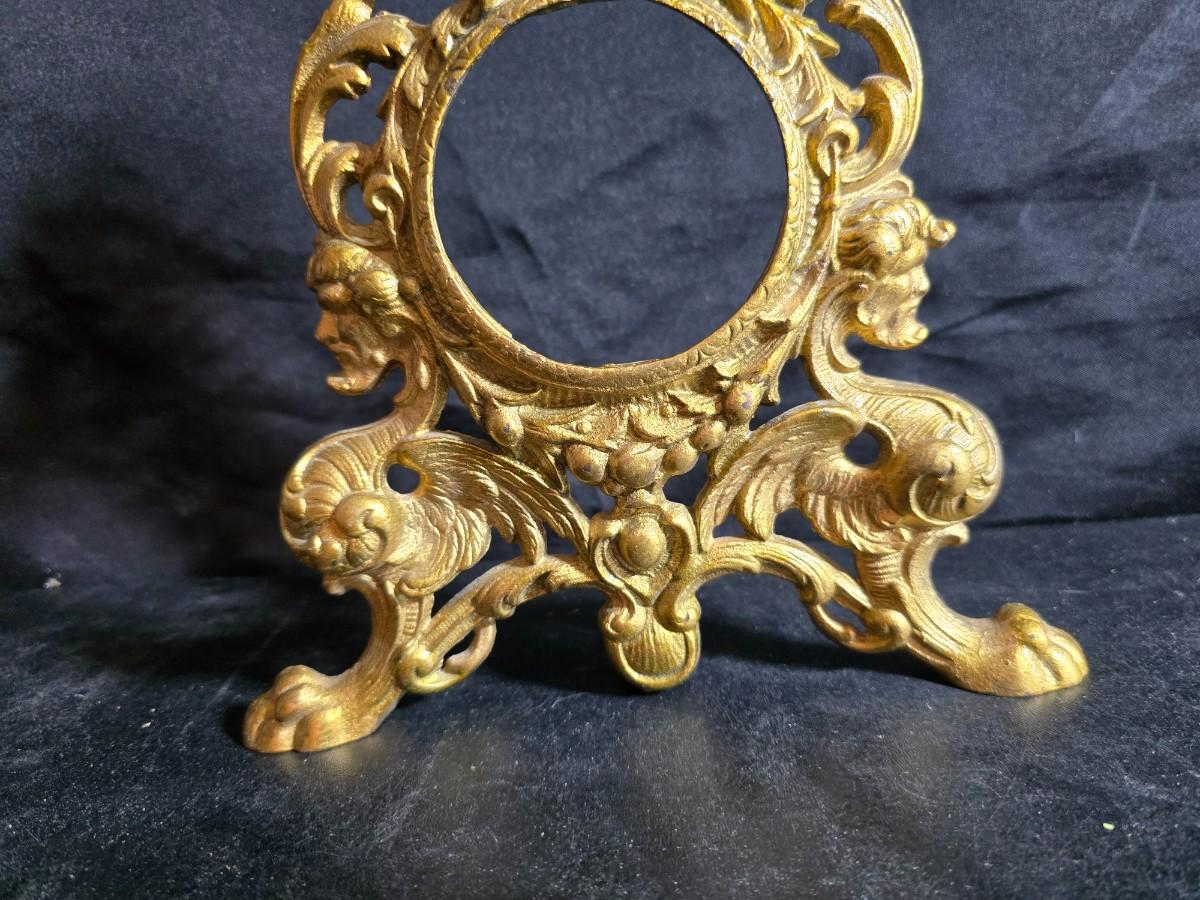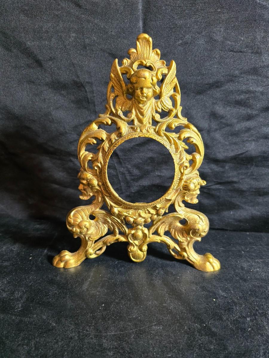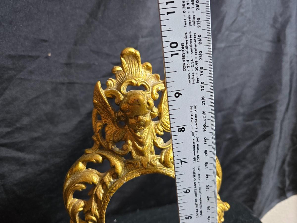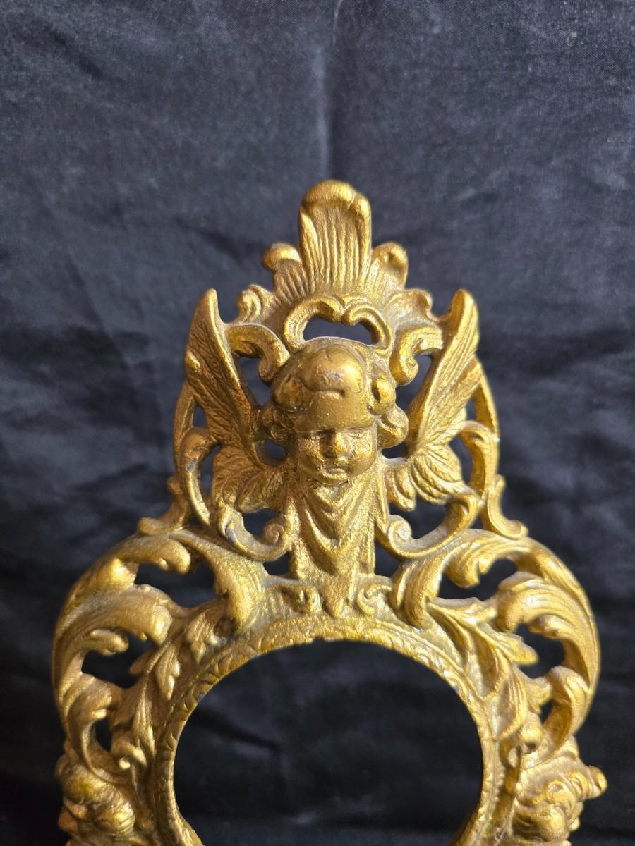 Antique, likely late Victorian or Rococo-style, gilt metal picture frame or mirror, featuring an ornate design with a cherub bust at the crest.