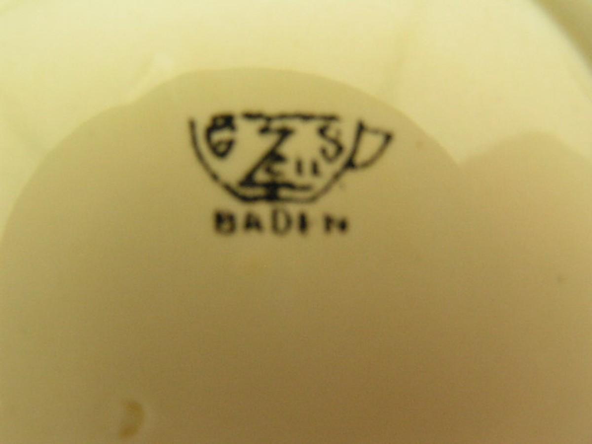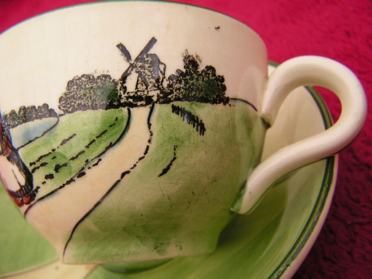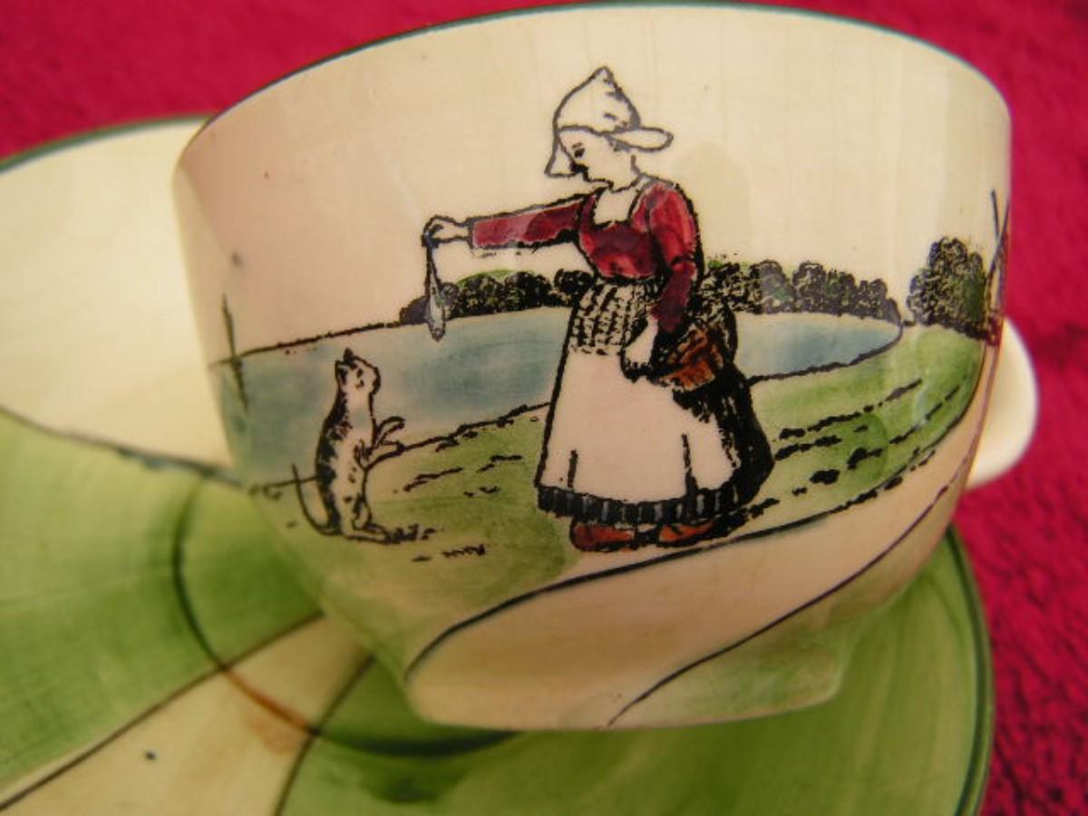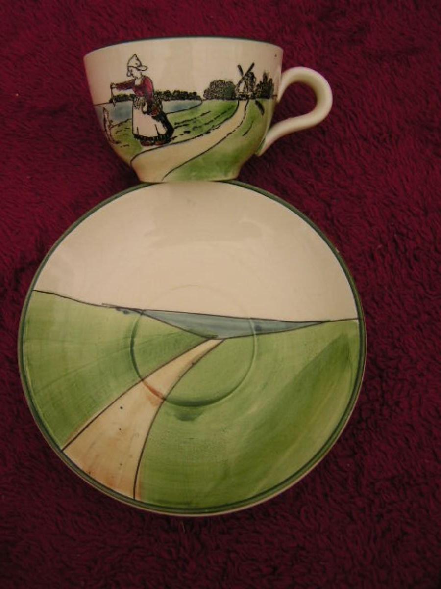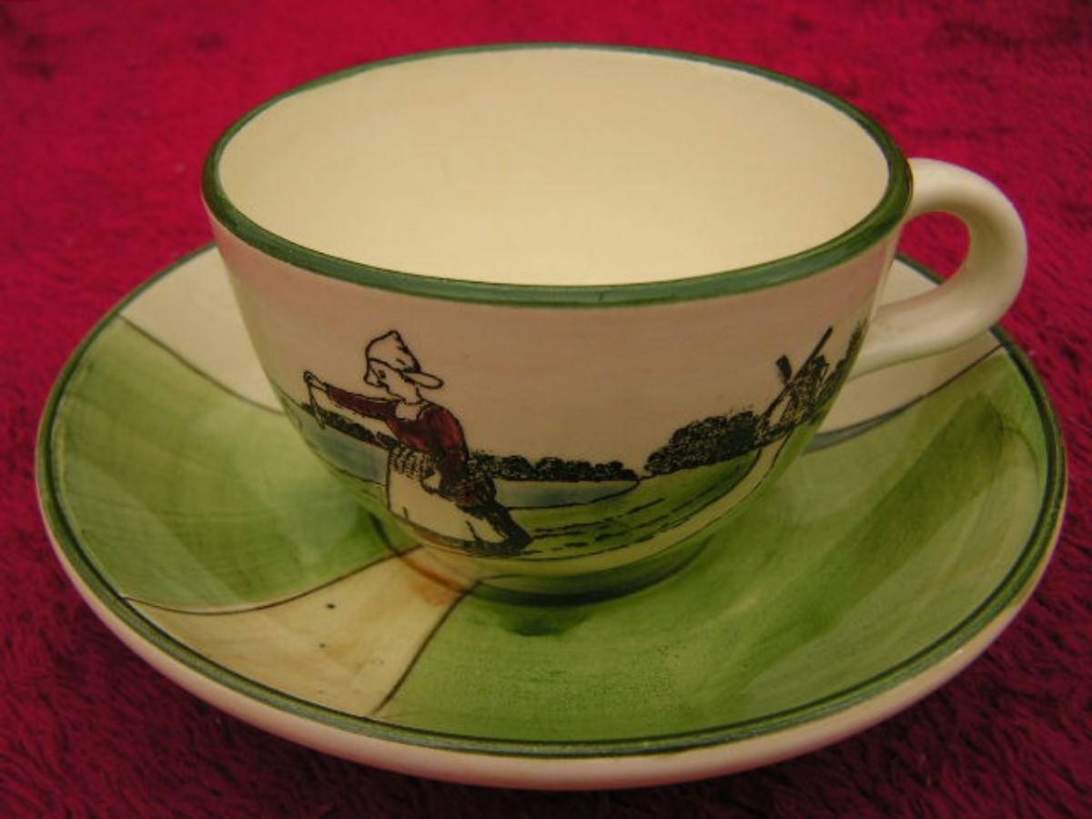 Antique ceramic teacup & saucer set early 20th century. Produced by Georg Schmider ZELL BADEN United Ceramic Factories, likely between 1907-1928. Likely made with high quality Majolica ceramic. The hand painted scene features a Dutch girl in traditional attire and a Dutch windmill. EX to Mint