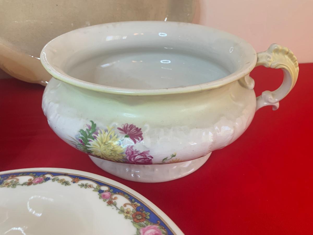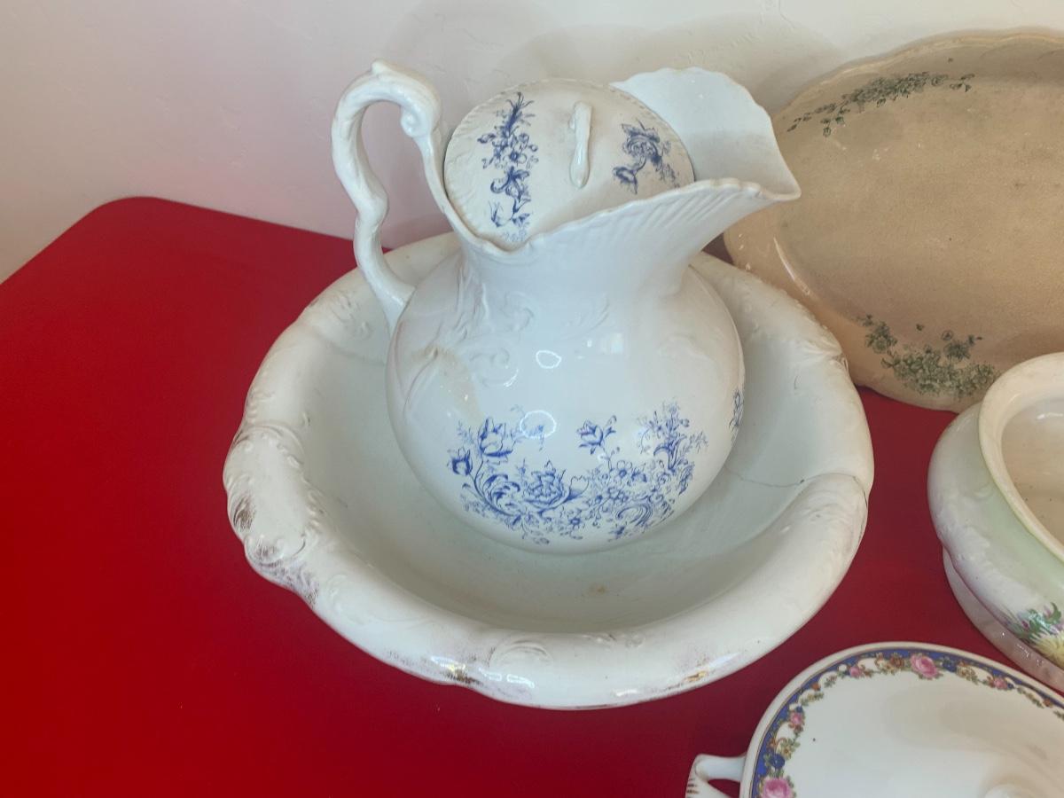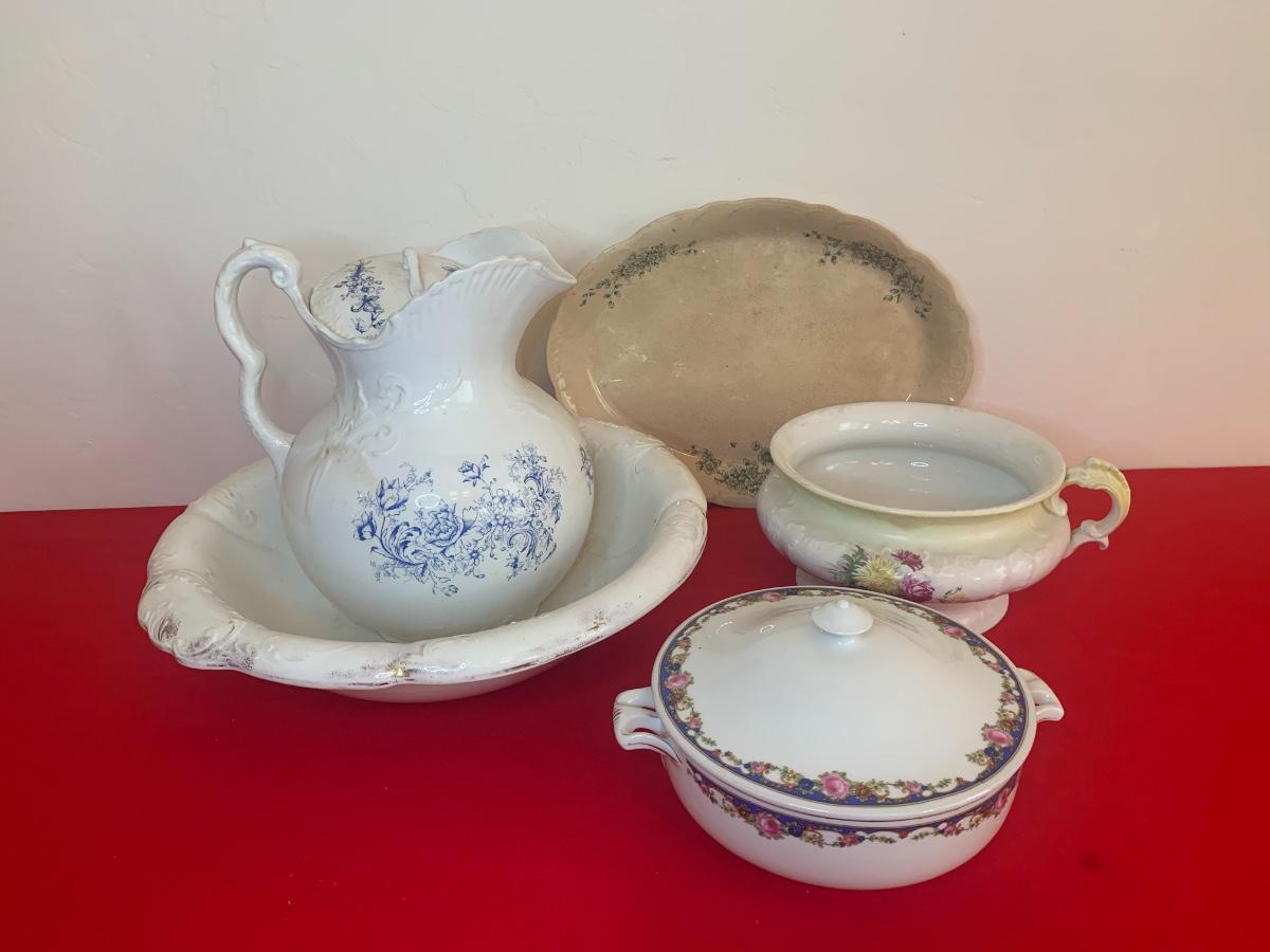 Lot includes a Goodwin Pottery semi-porcelain transferware platter (heavy crazing), an LDB co Bavaria lidded vegetable server, a pitcher and bowl (bowl has large crack), and a chamber pot.