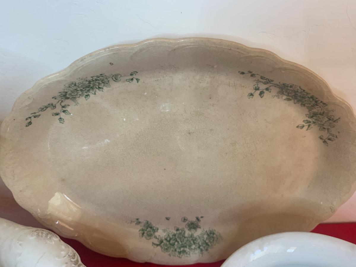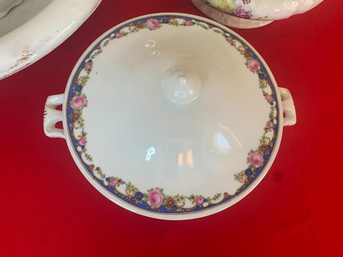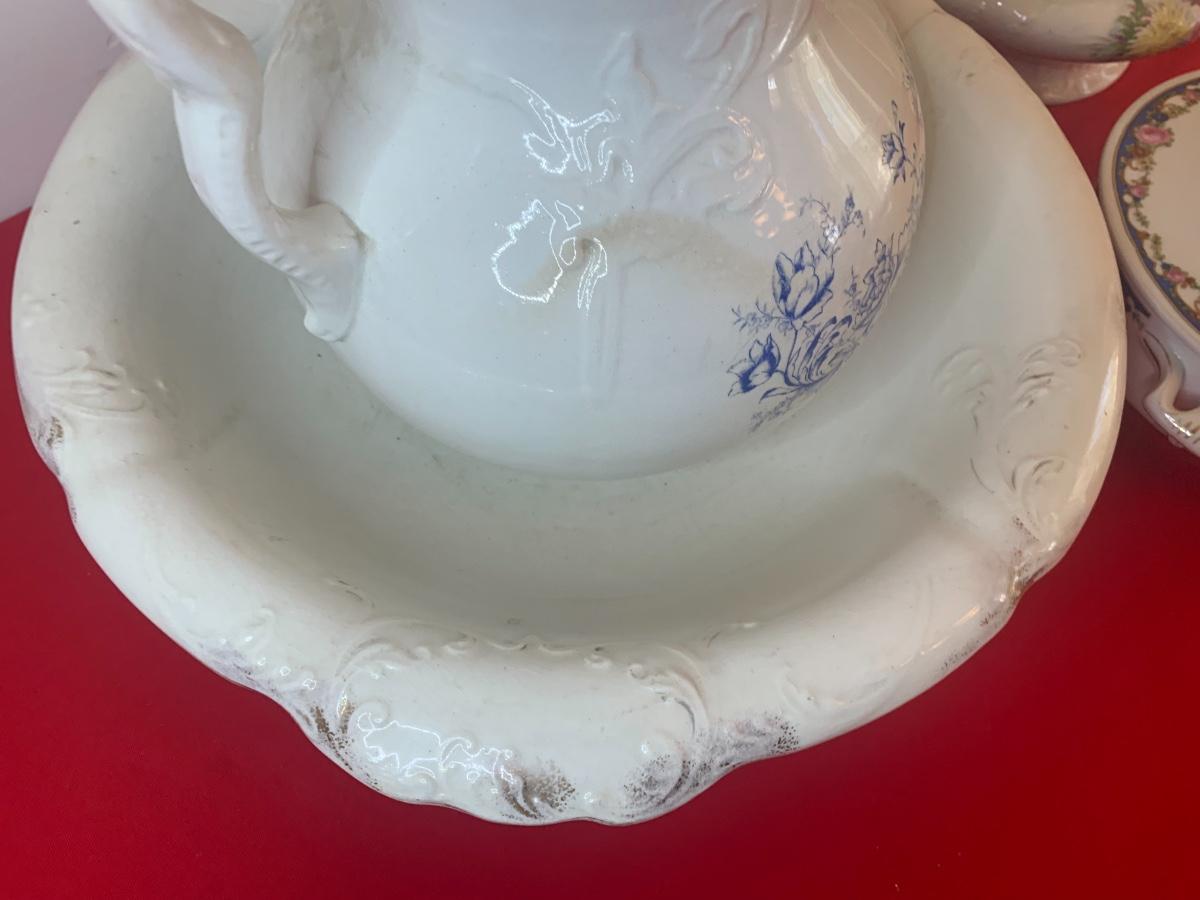 Lot includes a Goodwin Pottery semi-porcelain transferware platter (heavy crazing), an LDB co Bavaria lidded vegetable server, a pitcher and bowl (bowl has large crack), and a chamber pot.