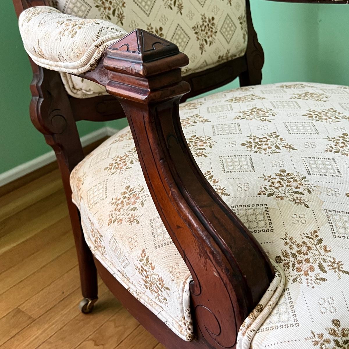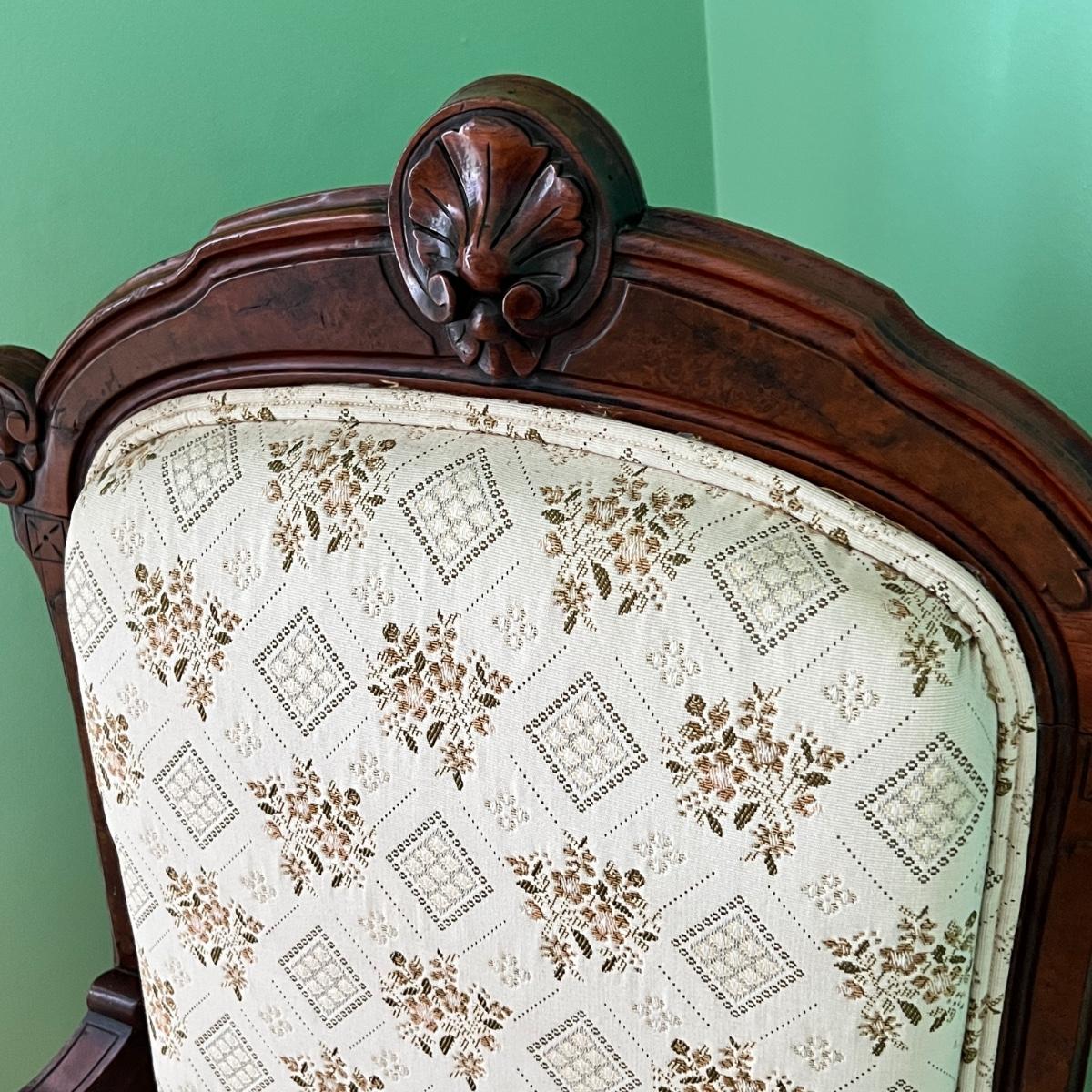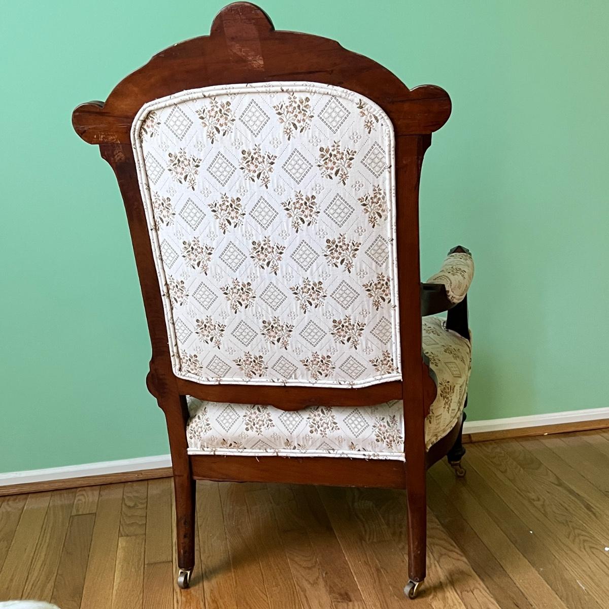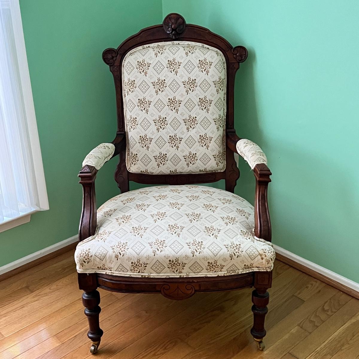 Gorgeous Victorian armchair with carved wood accented frame and muted tan and green on off white upholstery. It has metal casters and is in excellent vintage condition. There is a couch that matches this chair in the auction #268 as well. NOTE: PICK UP ONLY IN DUNKIRK MD.