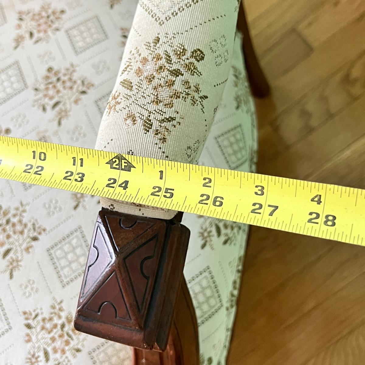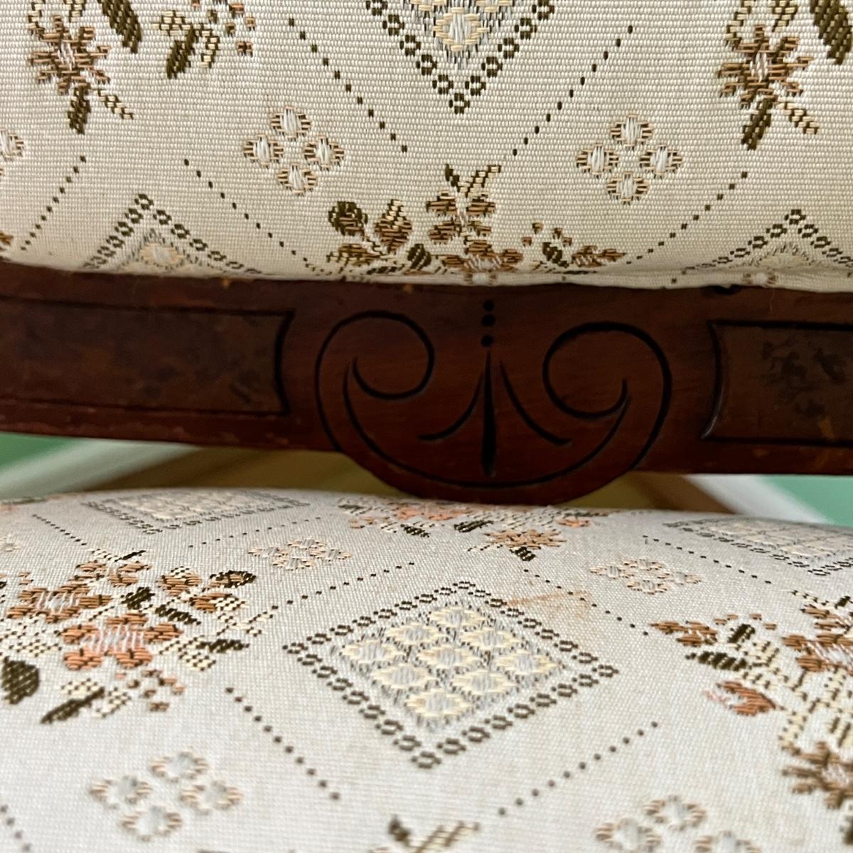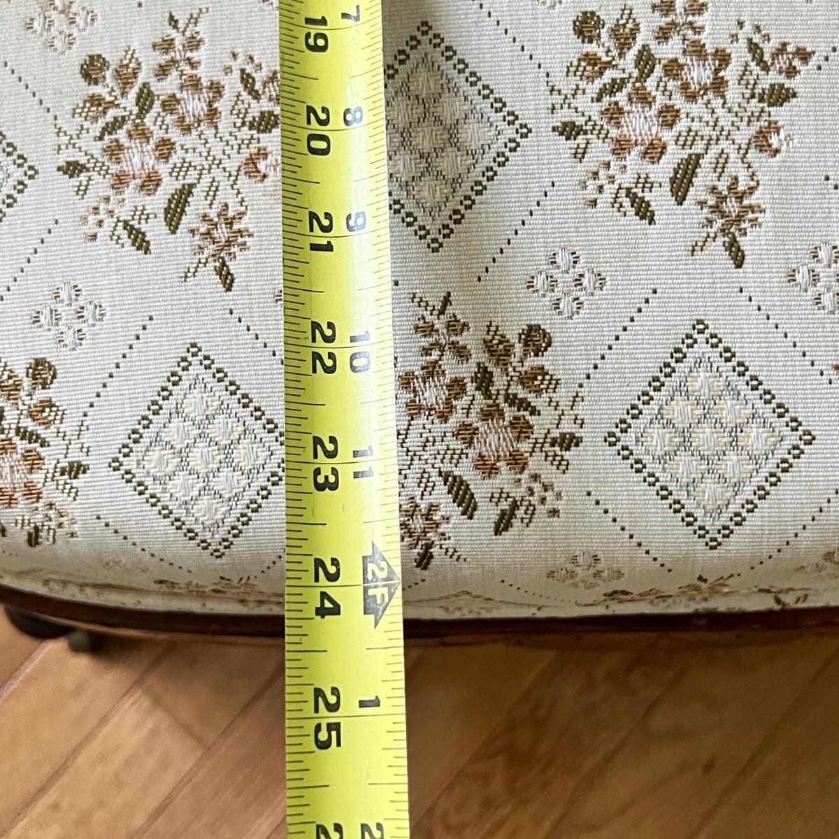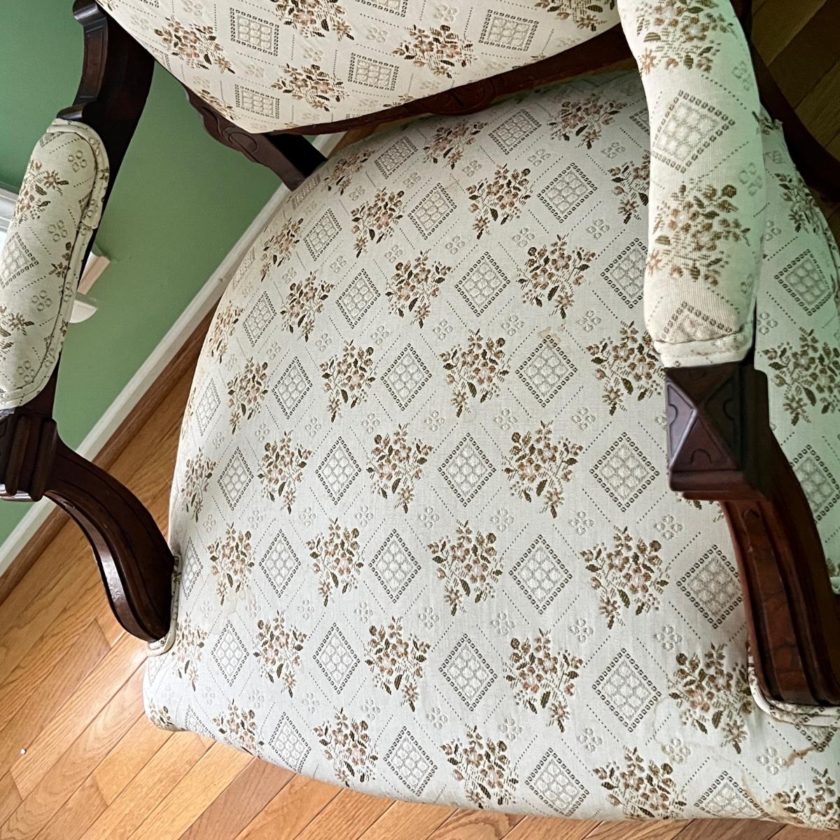 Gorgeous Victorian armchair with carved wood accented frame and muted tan and green on off white upholstery. It has metal casters and is in excellent vintage condition. There is a couch that matches this chair in the auction #268 as well. NOTE: PICK UP ONLY IN DUNKIRK MD.