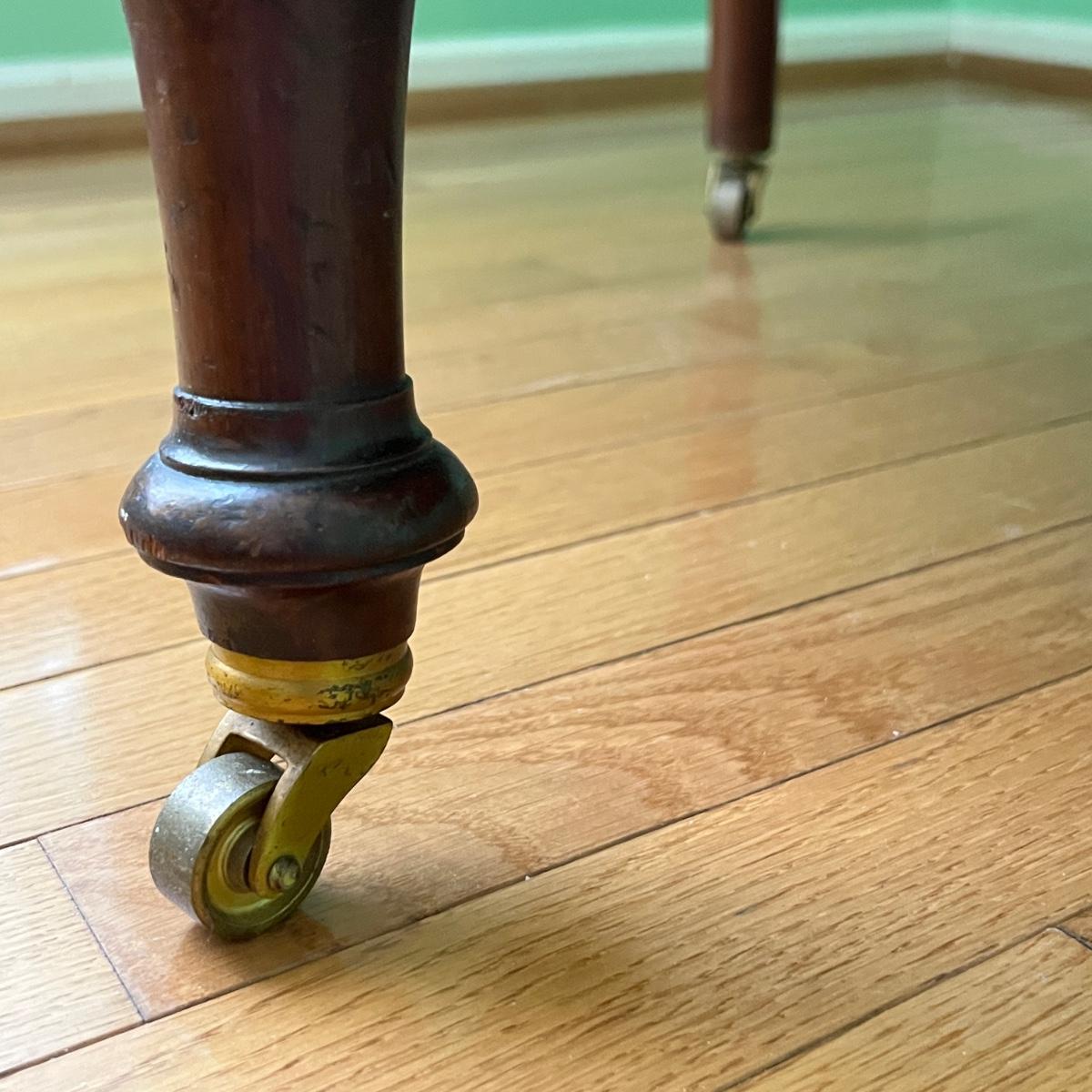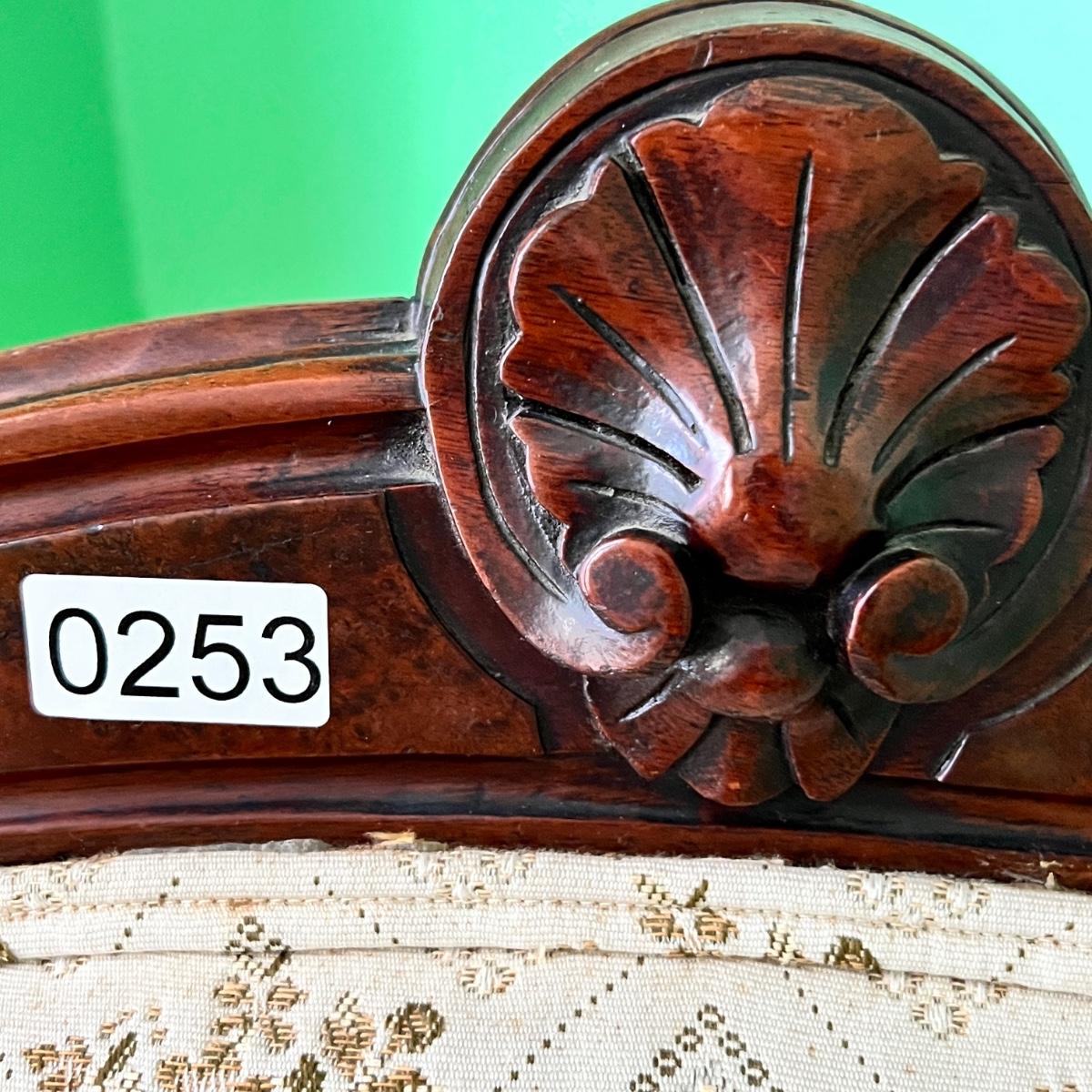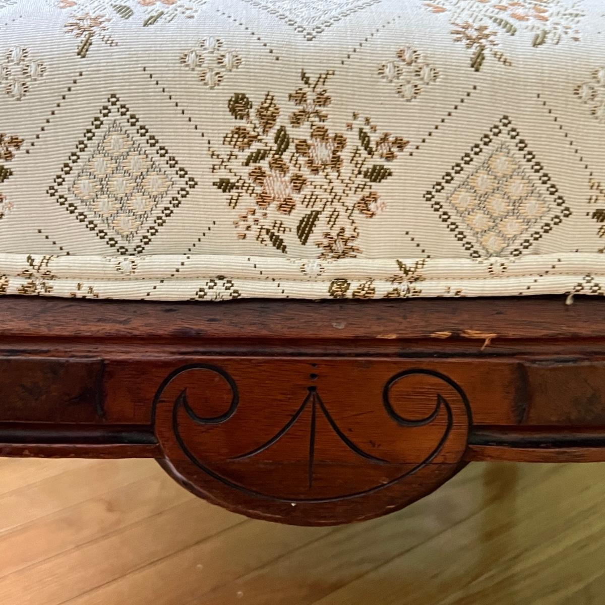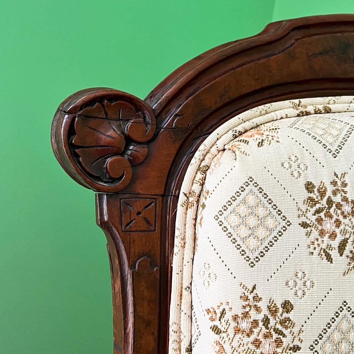 Gorgeous Victorian armchair with carved wood accented frame and muted tan and green on off white upholstery. It has metal casters and is in excellent vintage condition. There is a couch that matches this chair in the auction #268 as well. NOTE: PICK UP ONLY IN DUNKIRK MD.
