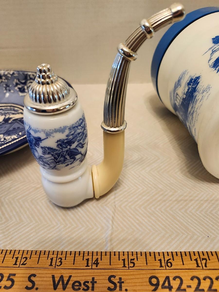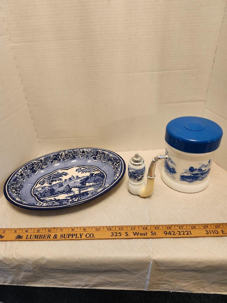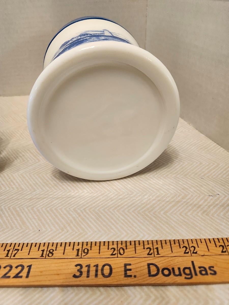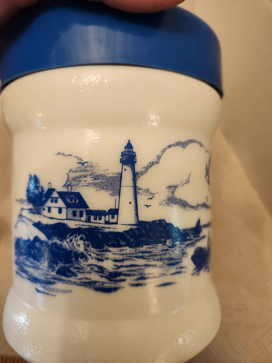 Vintage White Milk Glass Blue Delft Humidor Canister Blue Lid Lighthouse Scene