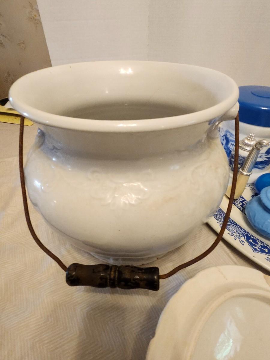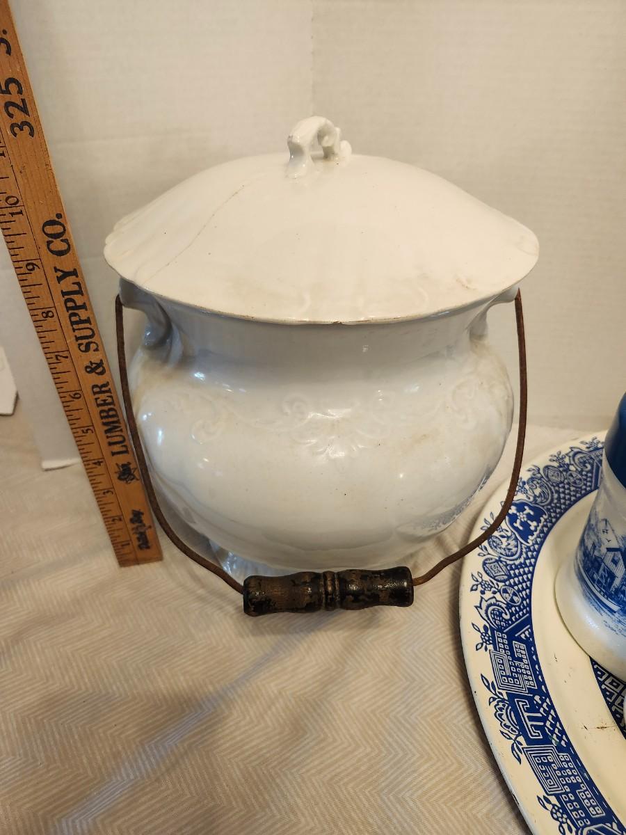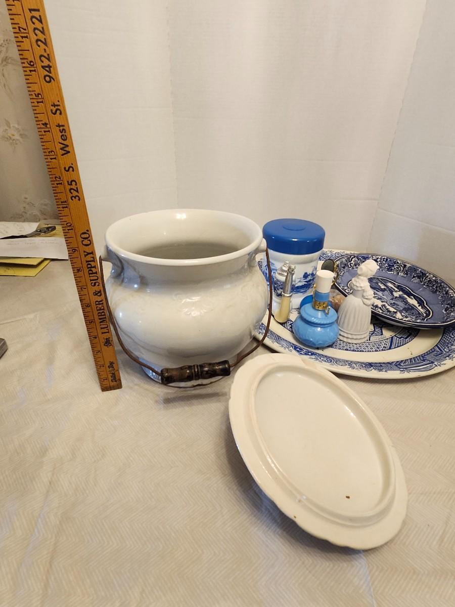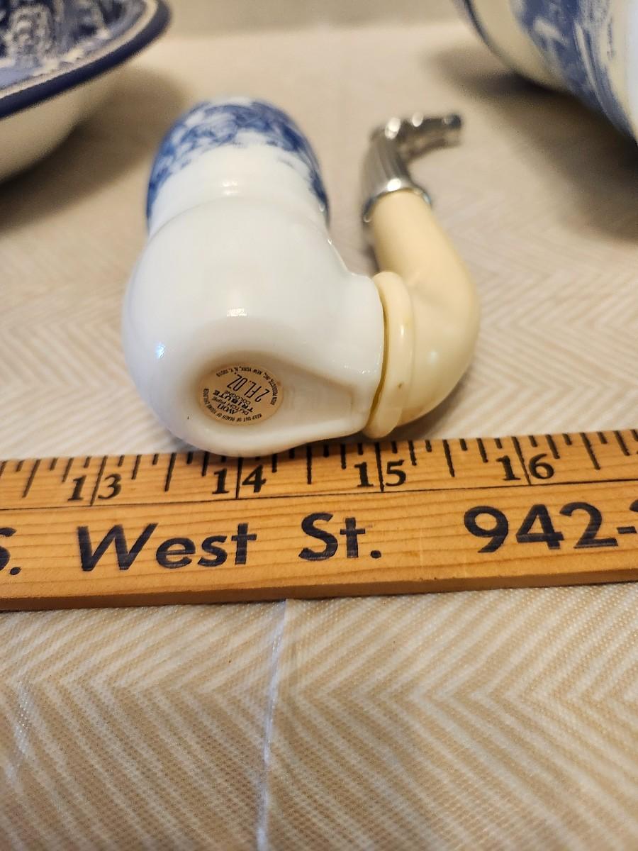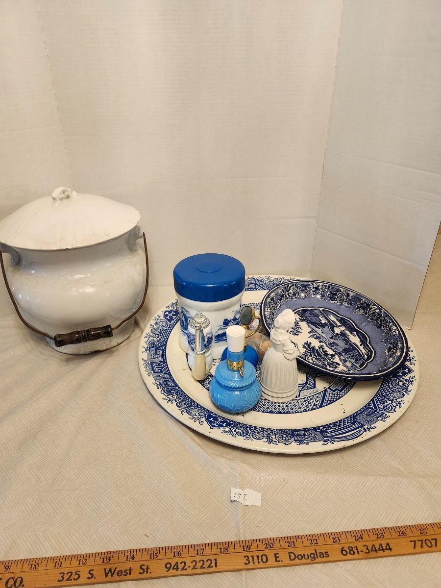 Vintage White Milk Glass Blue Delft Humidor Canister Blue Lid Lighthouse Scene