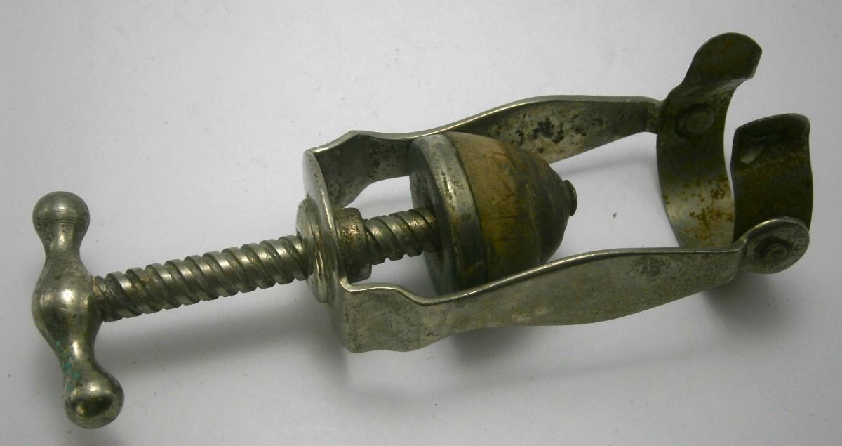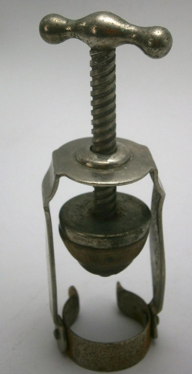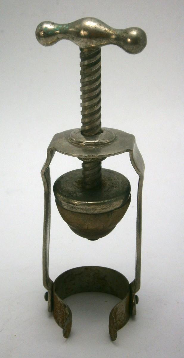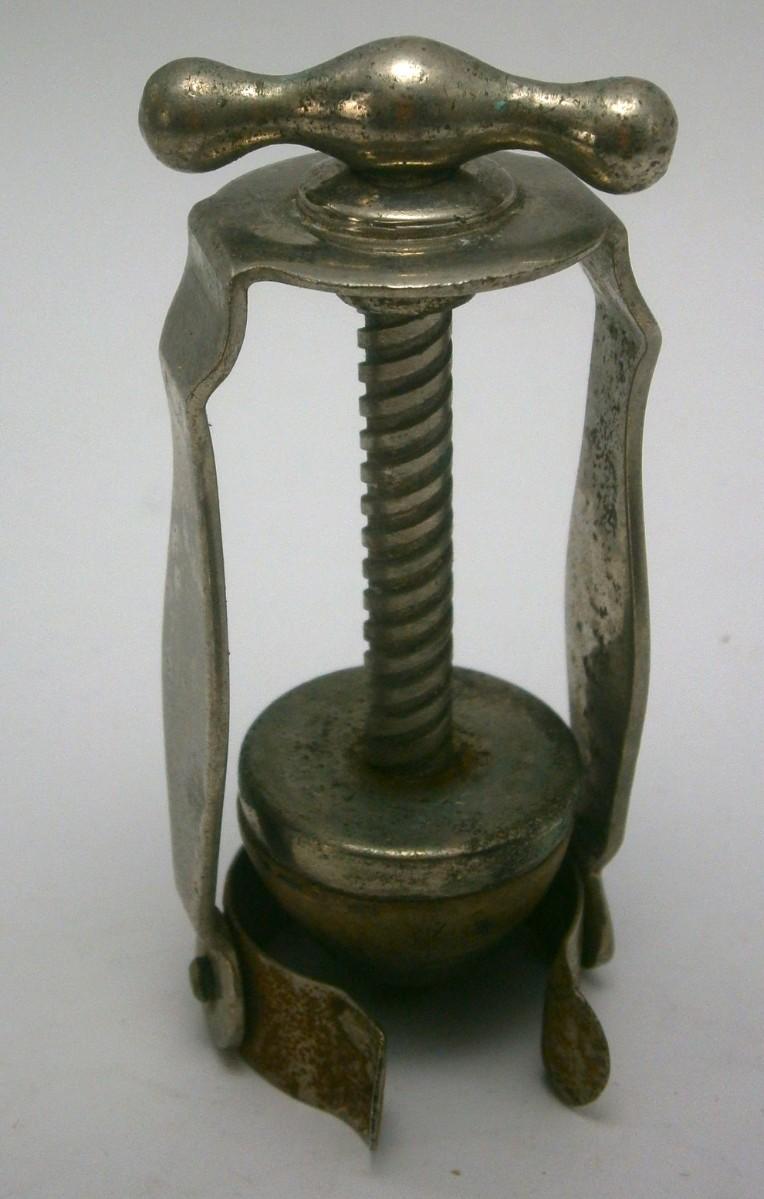 Antique Champagne Bottle Stopper, no markings, 5 3/4 in. tall (frame is 2 3/4 in. tall, nickel plated metal with leather stopper, very unusual and scarce bottle stopper.