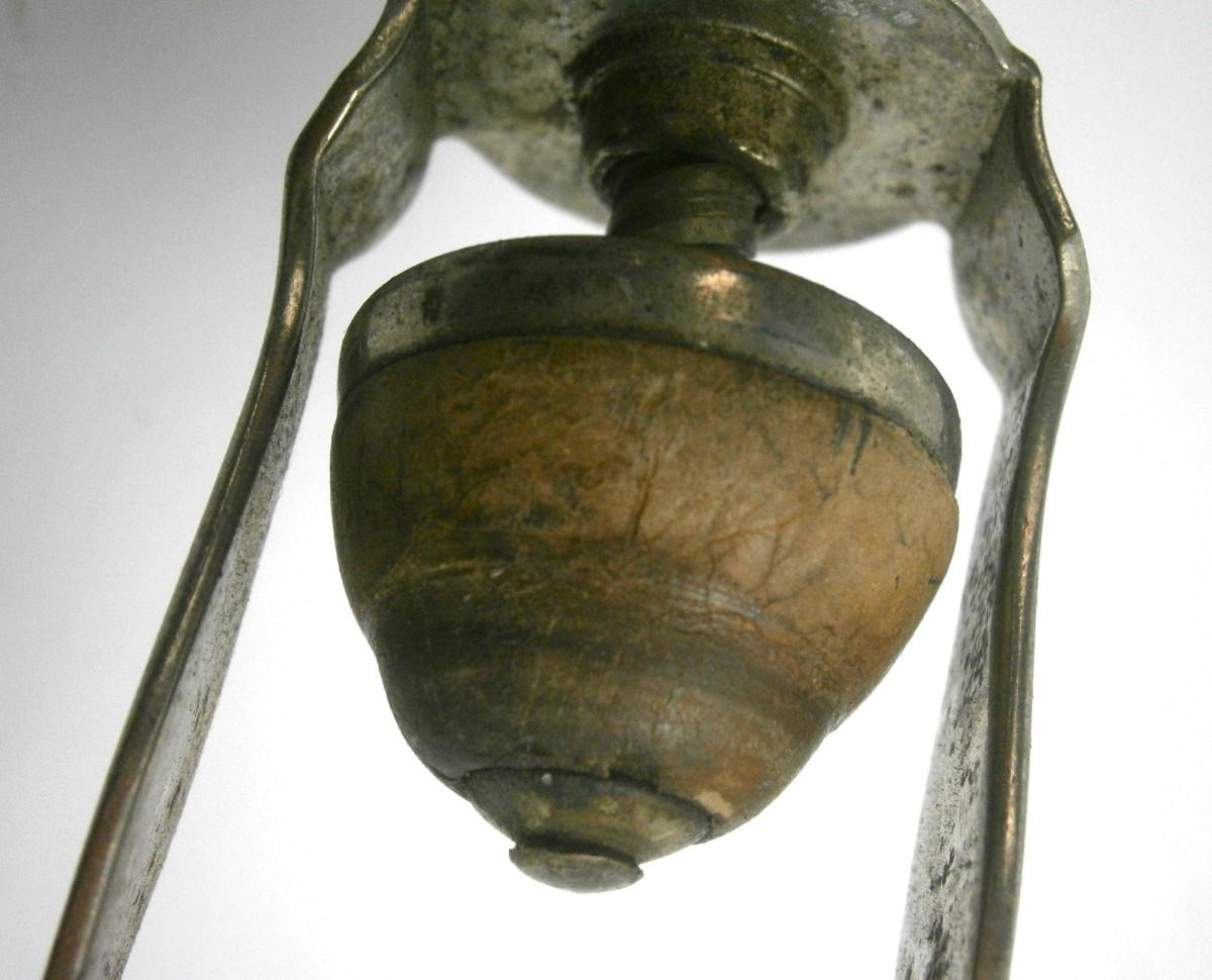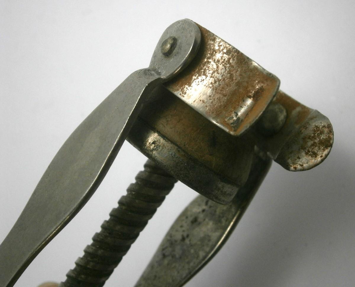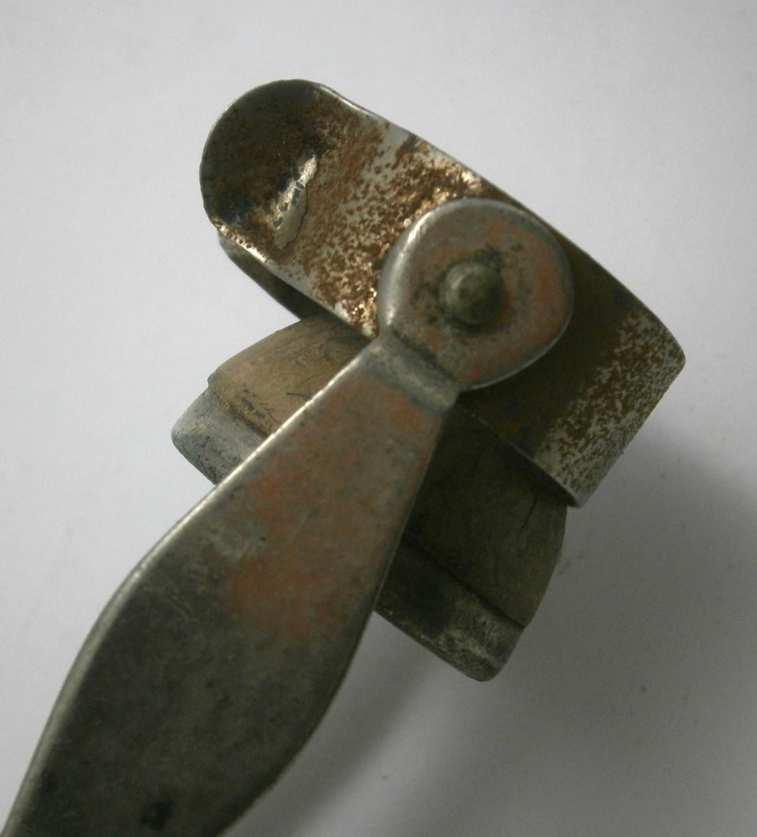 Antique Champagne Bottle Stopper, no markings, 5 3/4 in. tall (frame is 2 3/4 in. tall, nickel plated metal with leather stopper, very unusual and scarce bottle stopper.