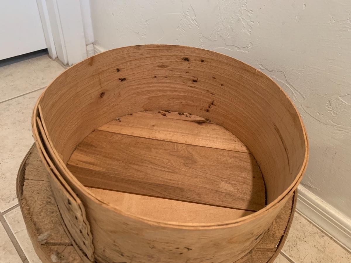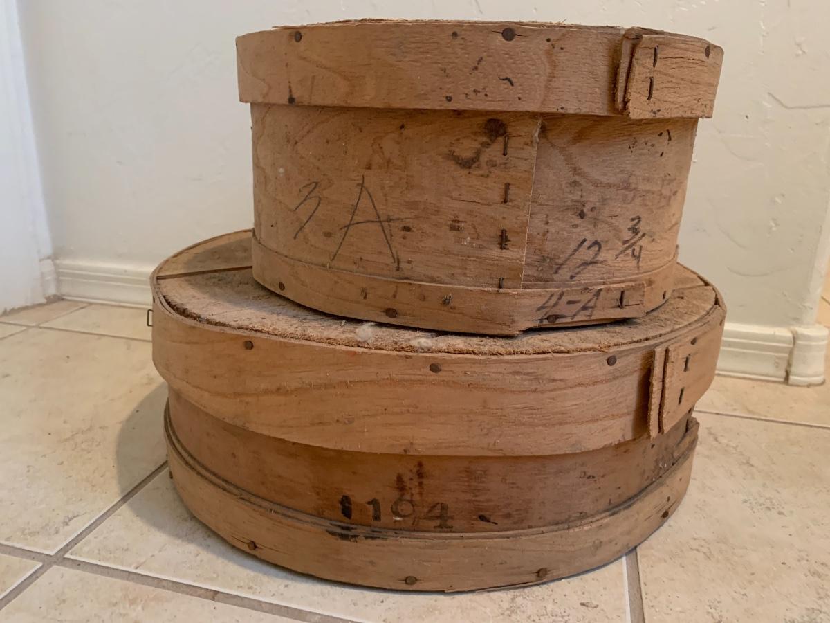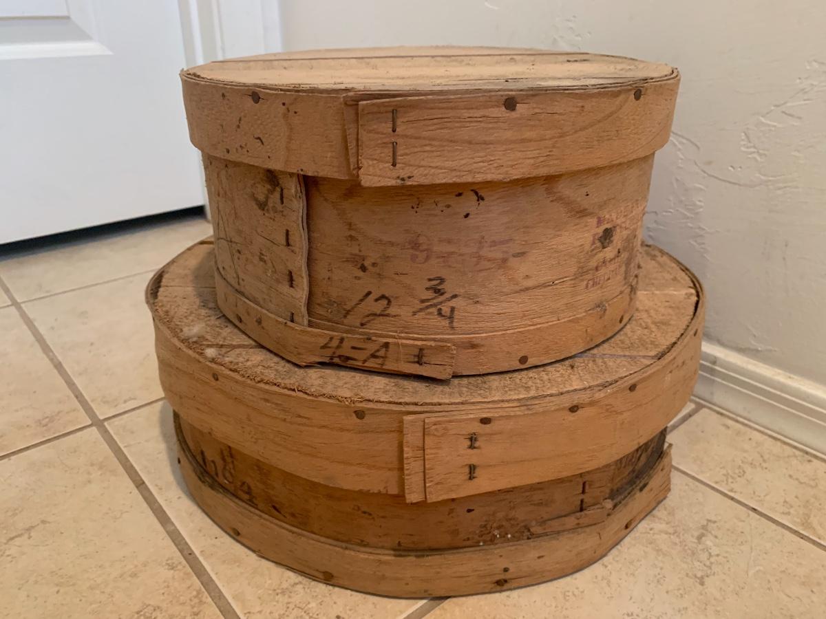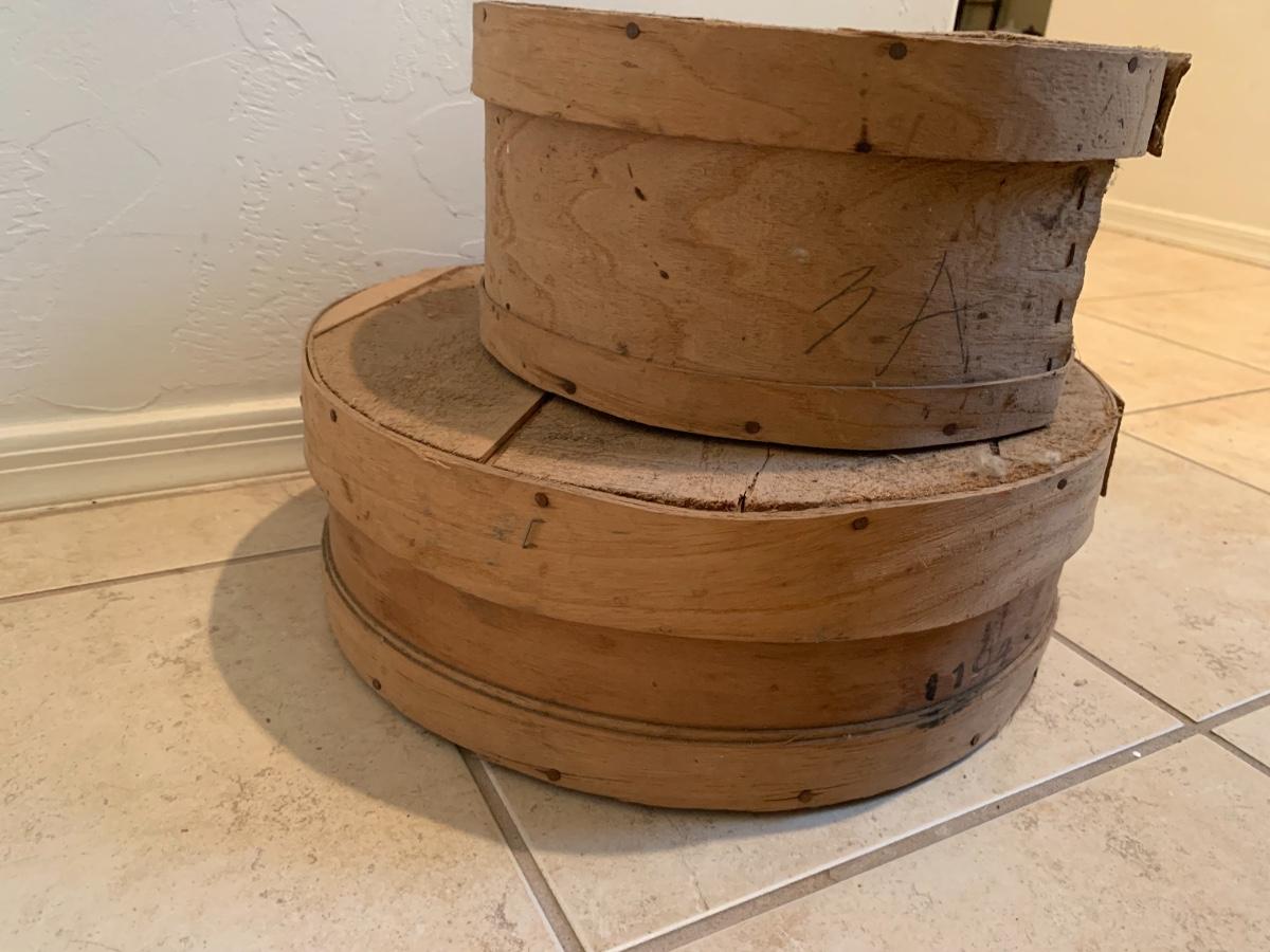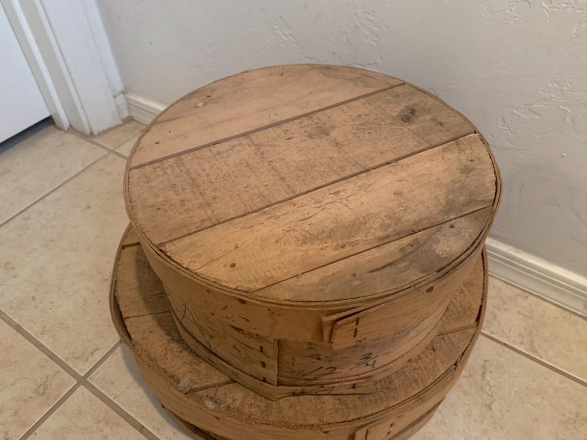 Lot includes two antique round wood cheese boxes in very good condition for age.