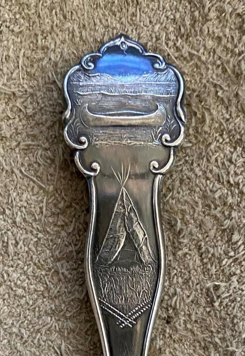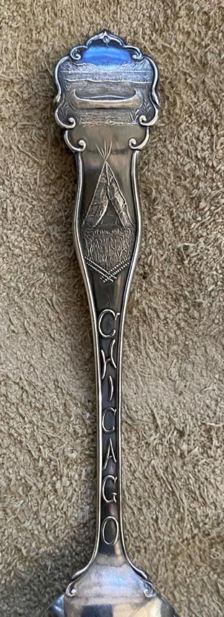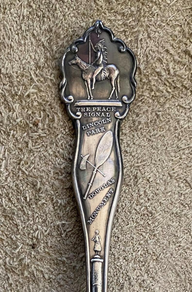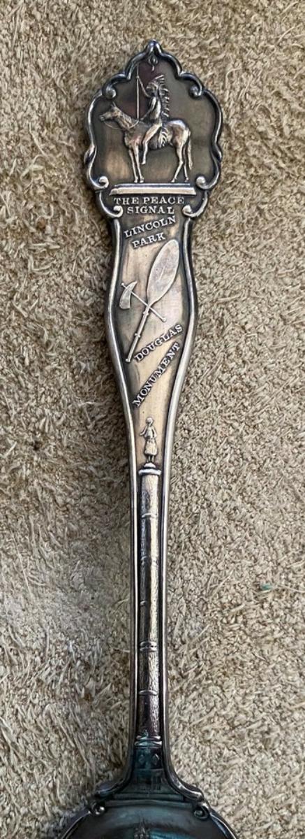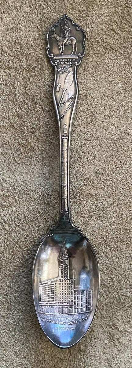 Early 20th century on this silver plate souvenir spoon for CHICAGO..Unknown maker?...Crisp elaborate details..The Peace Signal Bronze in Lincoln Park..Stephen A. Douglas Monument...and the bowl features the Montgomery Ward Tower Building built in 1907...6" long...29.6 grams.
