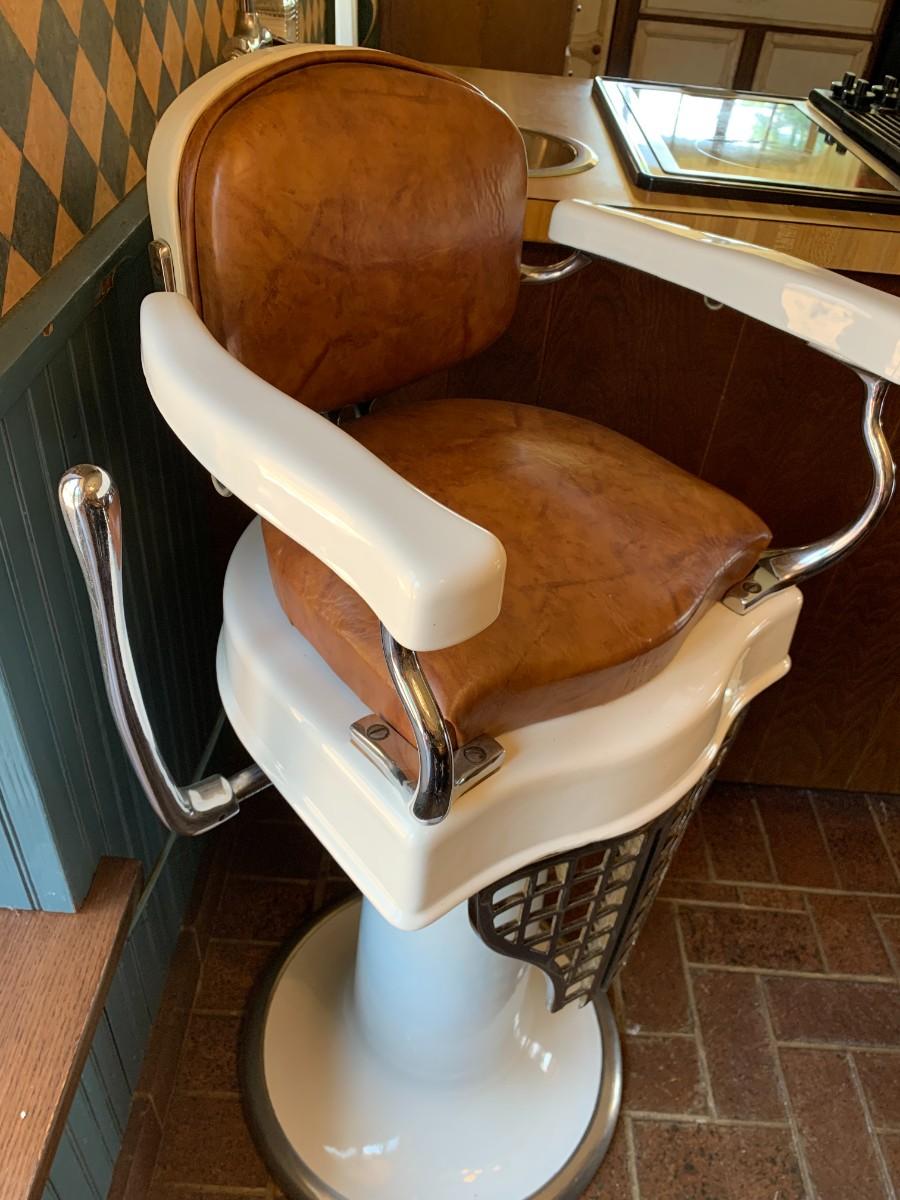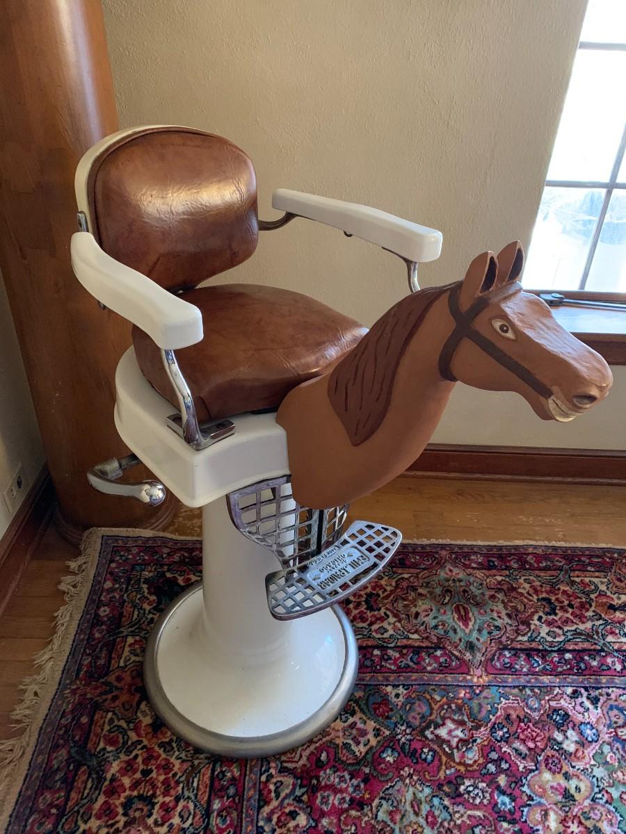Spectacular condition! This Emil J Paidar child's barber chair is in great working condition. I has been sitting in the kitchen of the family home for decades. When the family liquidated the estate via an estate sale, they discovered the hand-carved horse head packed away in a box in the attic! Everything appears to be original to the circa 1920-1930 barber chair. Note in the pictures, that a small piece of the chrome grate that holds the foot rest is broken. It has no effect on the performance of the chair and is hidden by the foot rest.