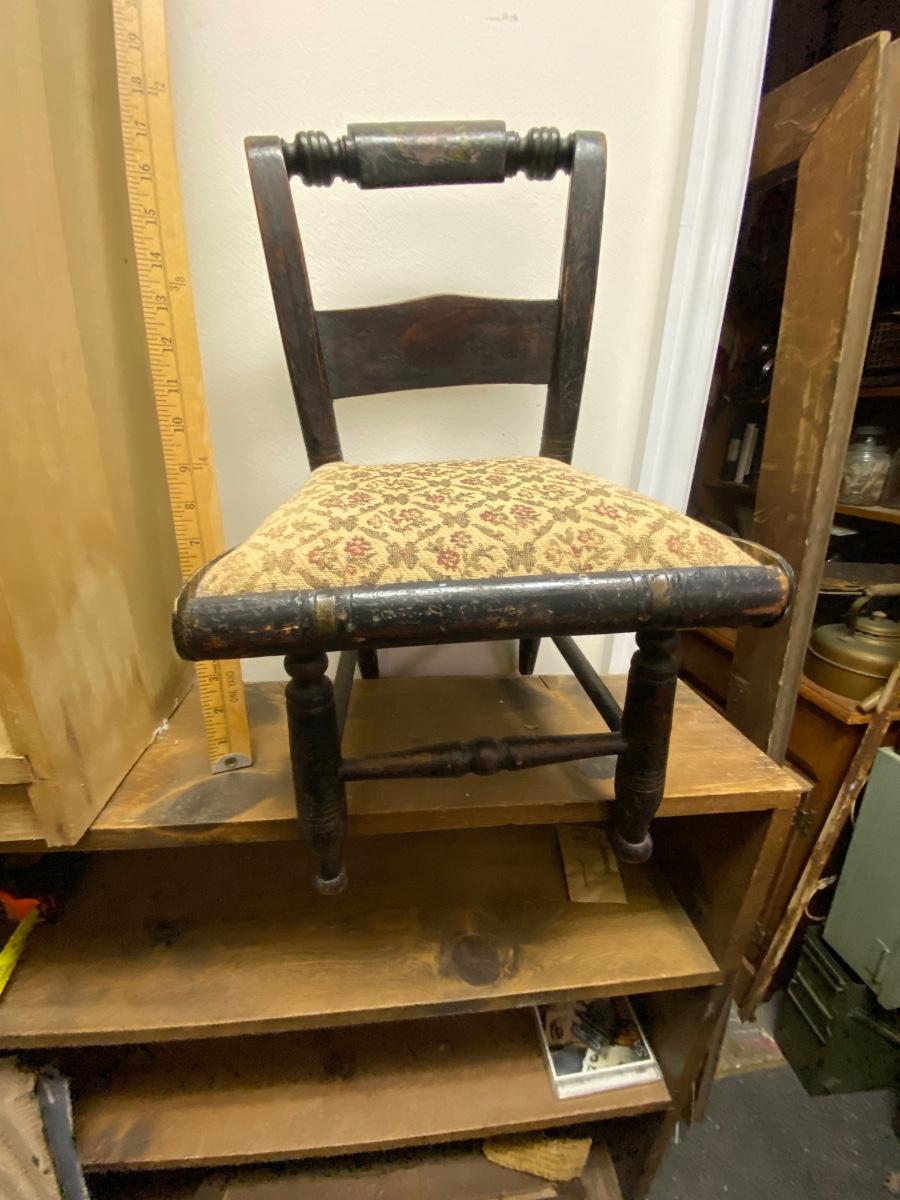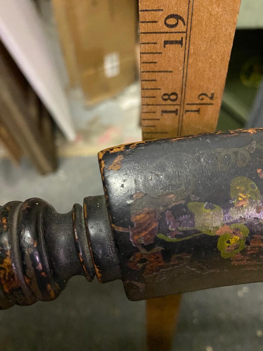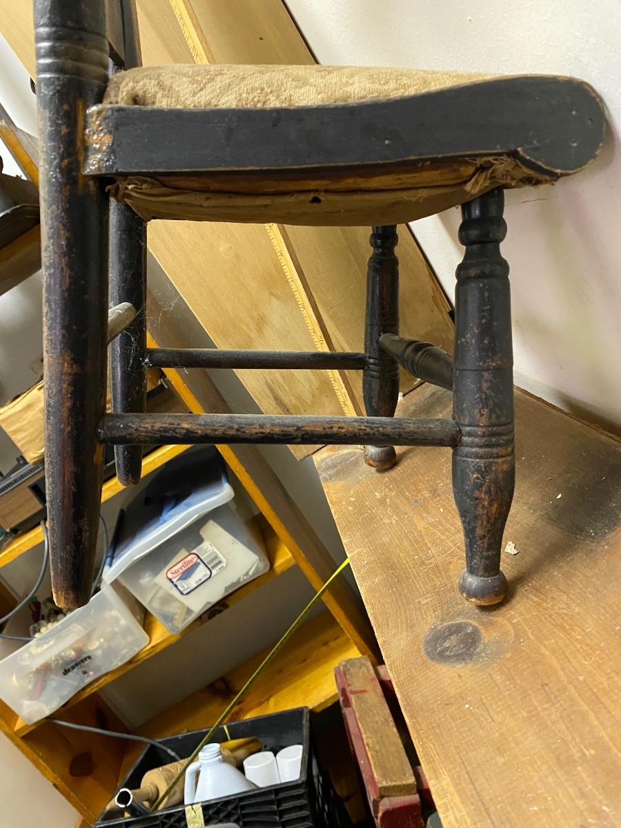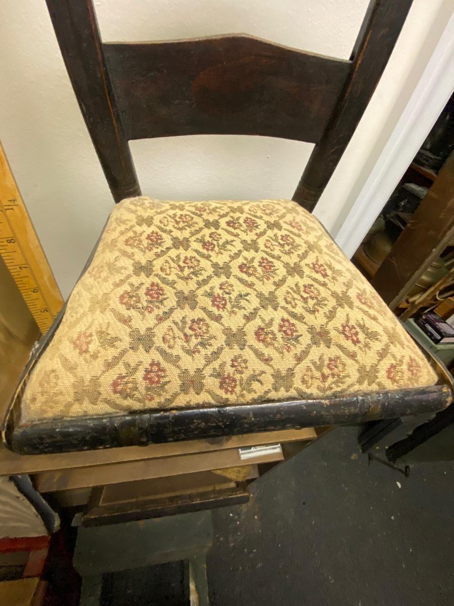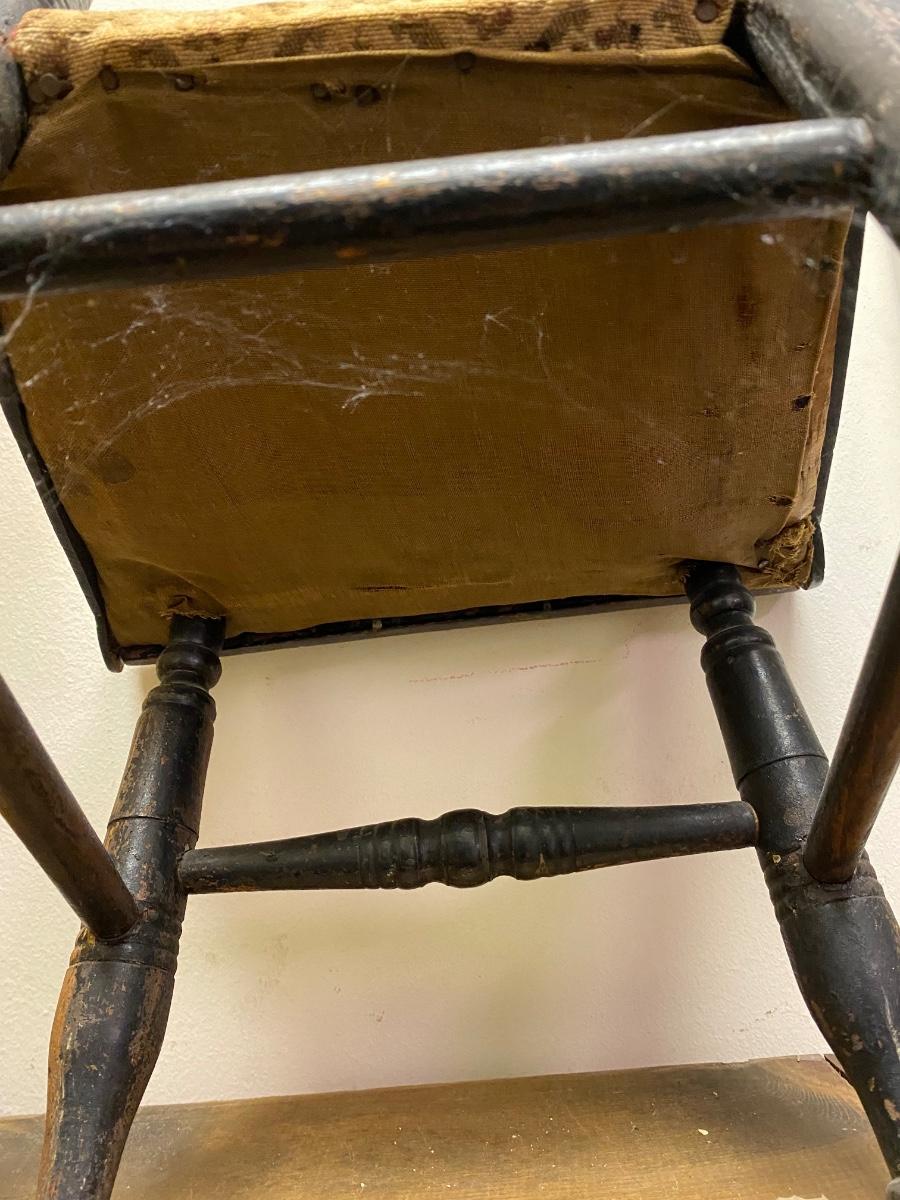 Wooe framed, upholstered seat, backing in tact on bootm. Some signs of wear on seat, distressed wood. Painteddetail