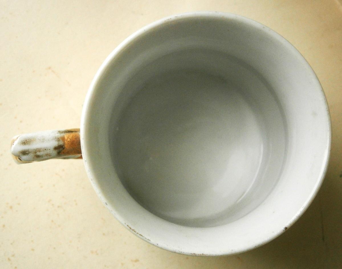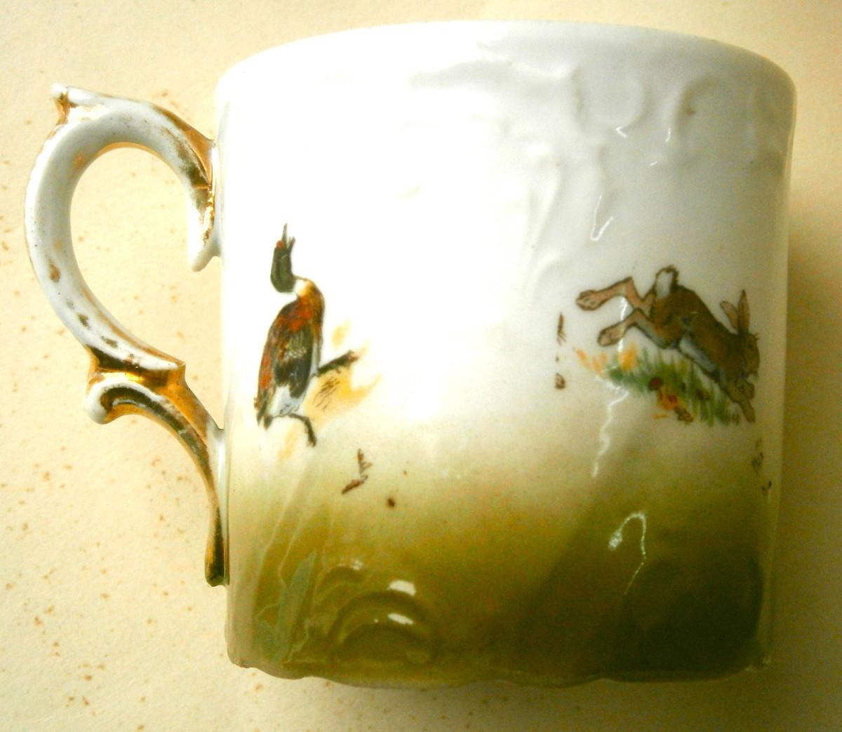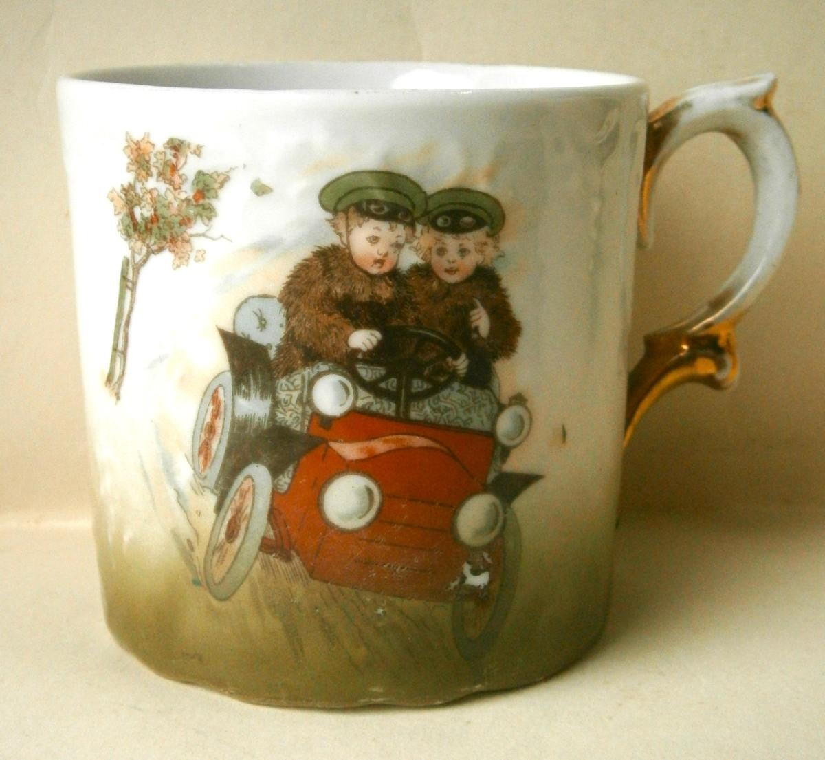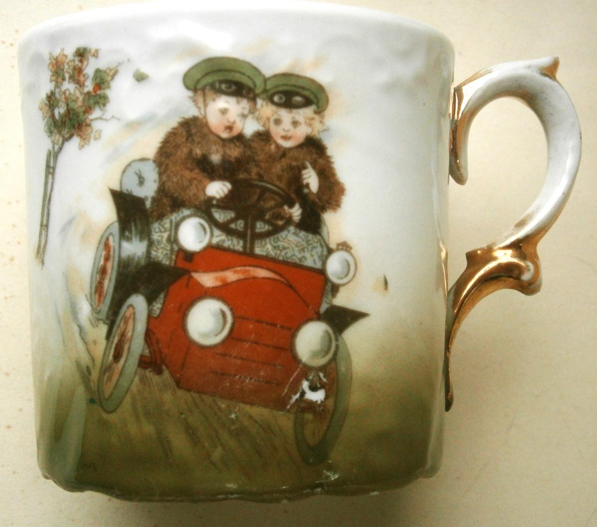 Antique Child's Cup with Automobile from the early 1900's, transfer on porcelain, 2 1/2 in. tall.