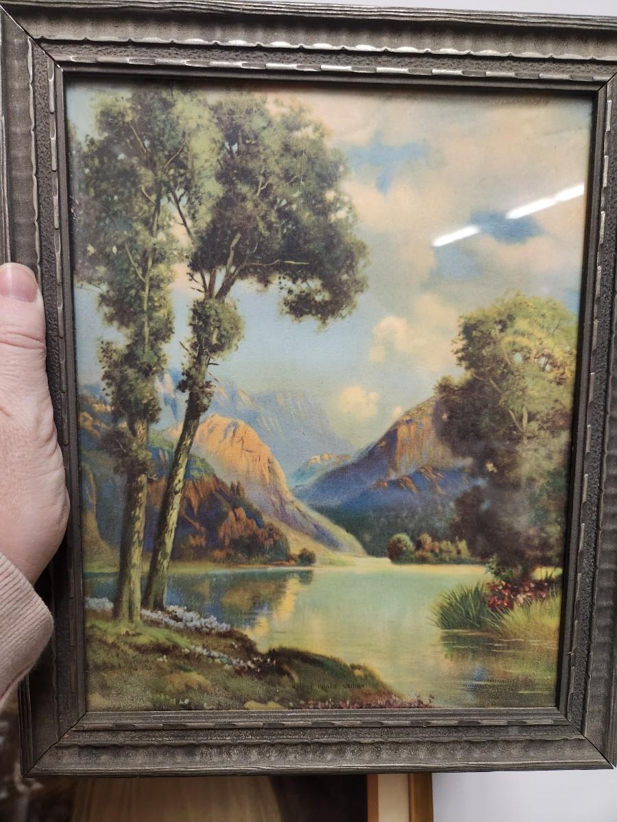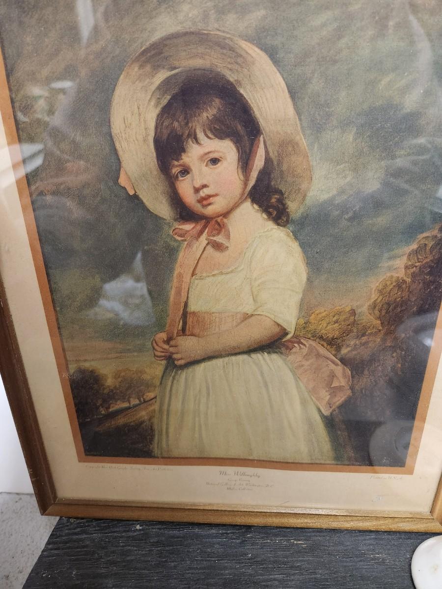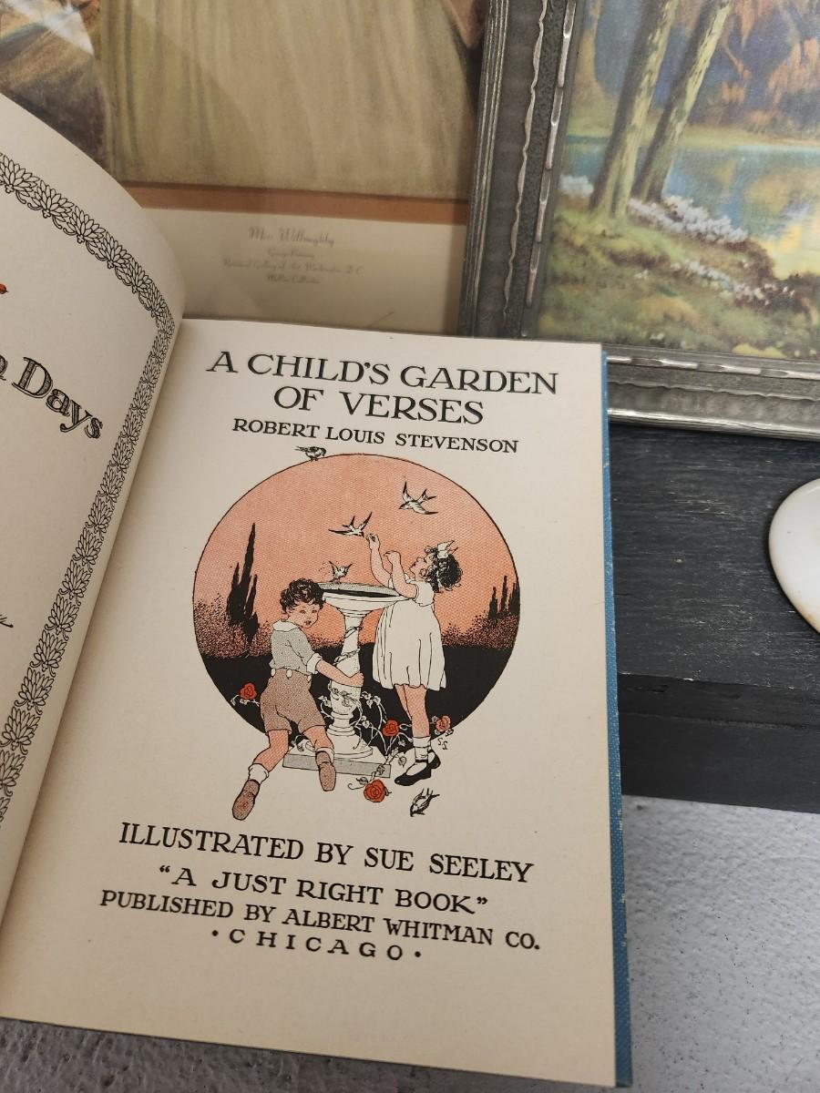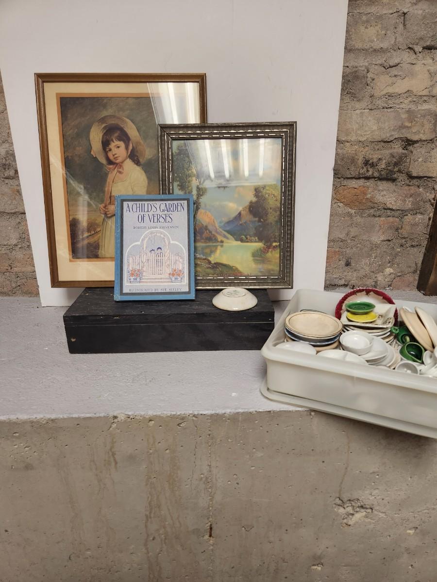 2 really great prints, sweet old book and a Tupperware full of antique children play dishes.
