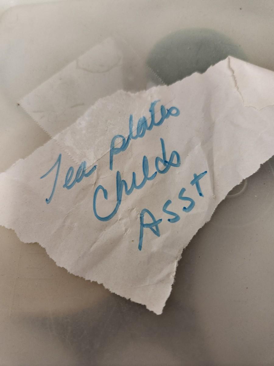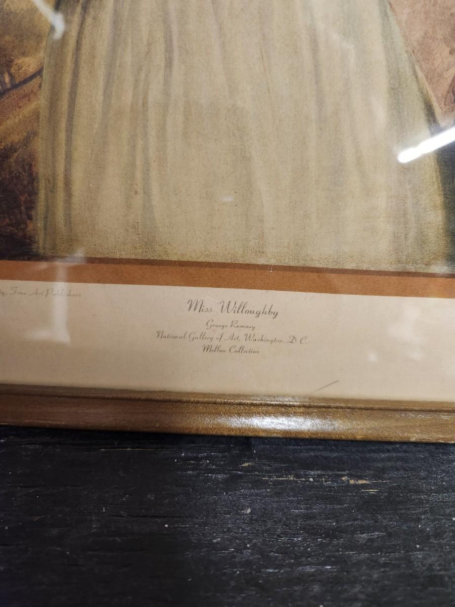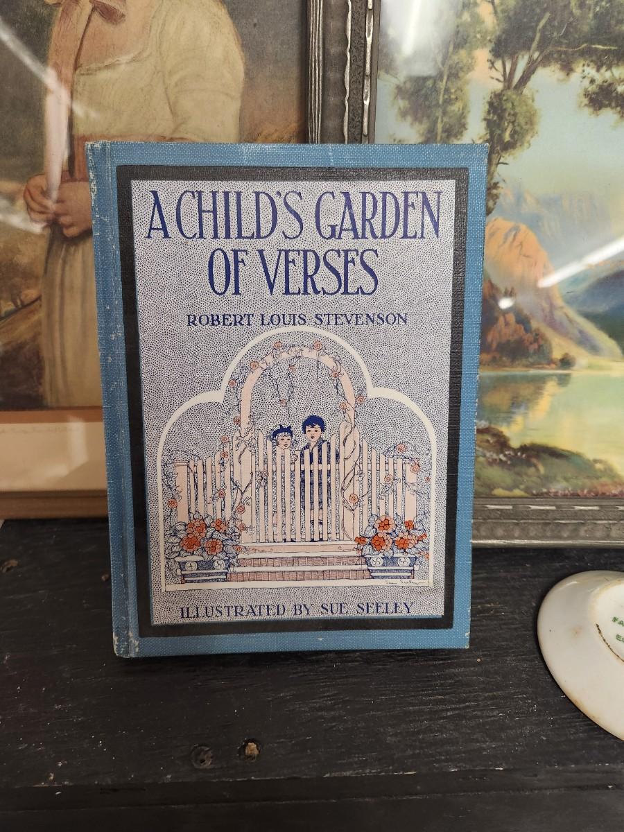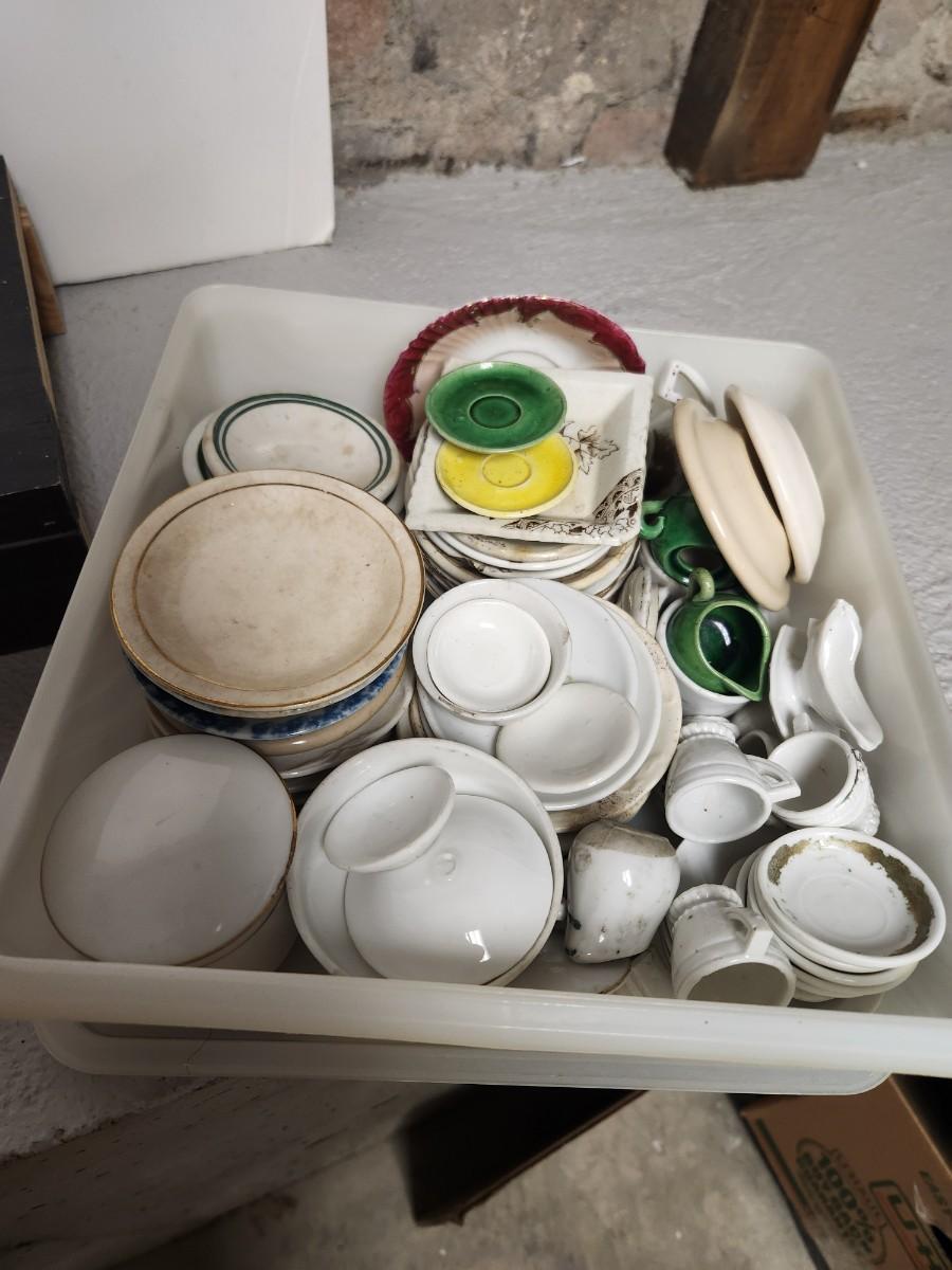 2 really great prints, sweet old book and a Tupperware full of antique children play dishes.
