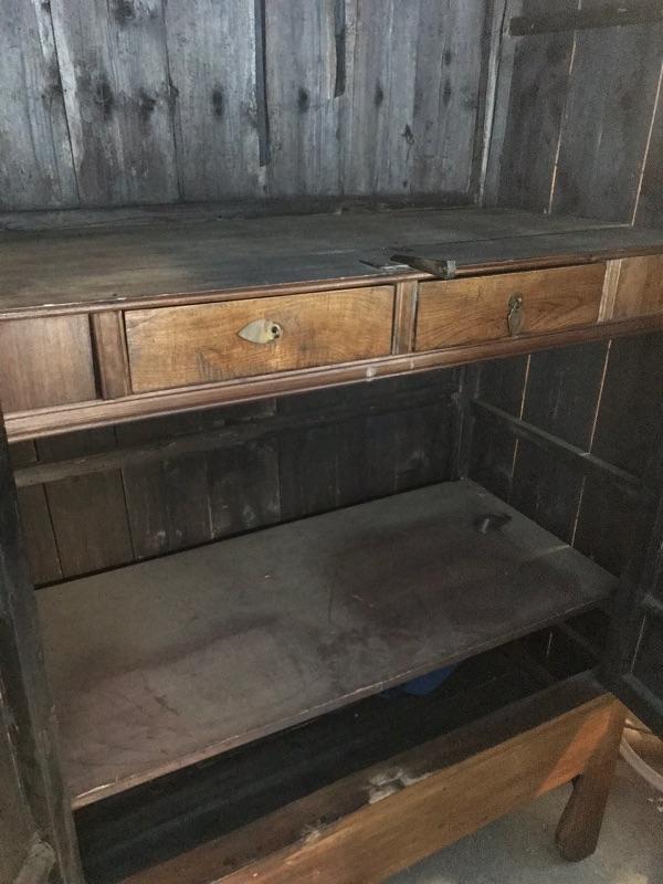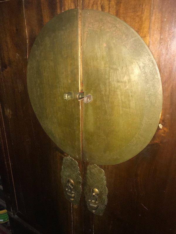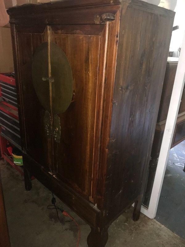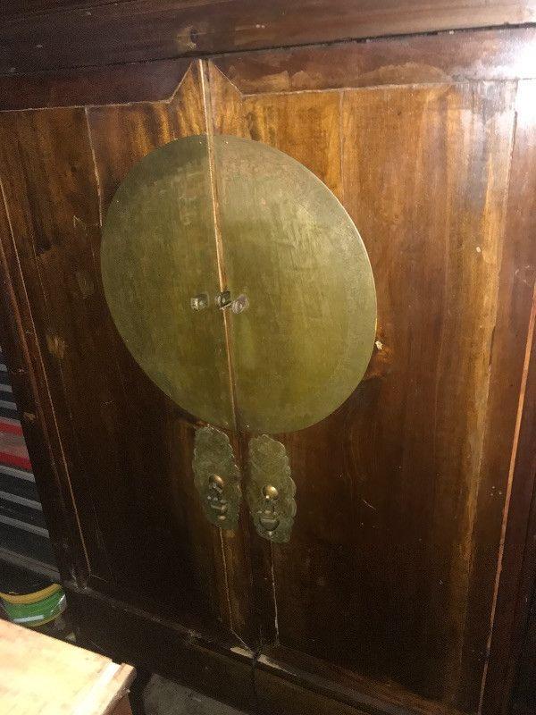 This is an antique Chinese wedding cabinet/chinoiserie. It is at least 19th Century or could be even a lot earlier. There is a large filigree brass medallion decorating the door. It is made of pine and chestnut. It is all mortise and tenon. It is missing a pull on the door. This is an extremely old piece. It is fully functional. This is an in lacquered version. The wood is extremely old wood. It has wormholes and expansion cracks that are indicative of a very old cabinet. Feel free to compare this cabinet to other similar Chinese chinoiserie cabinets priced at $6,500.00 or better. The dimensions are: 68” tall by 43 1/4” wise by 22” deep.