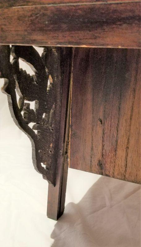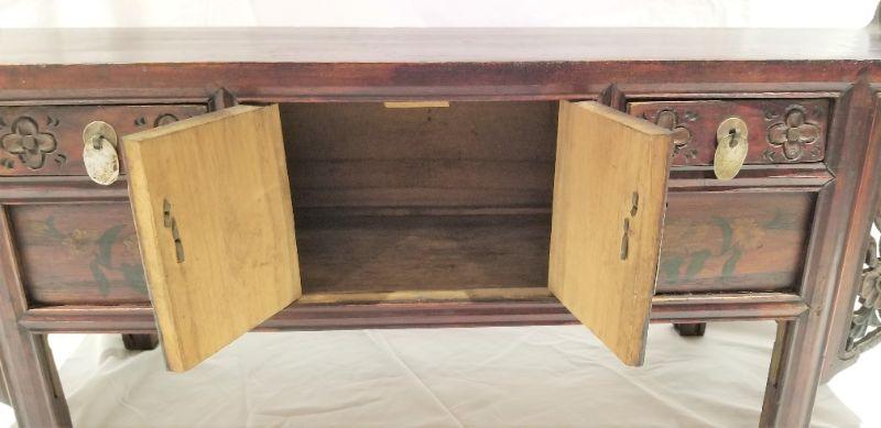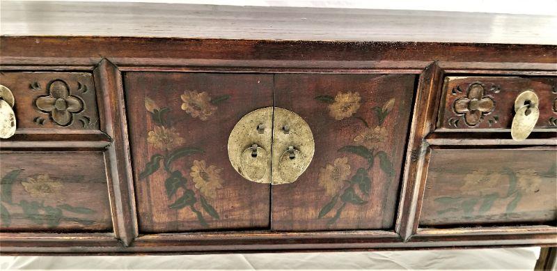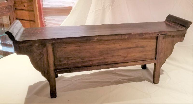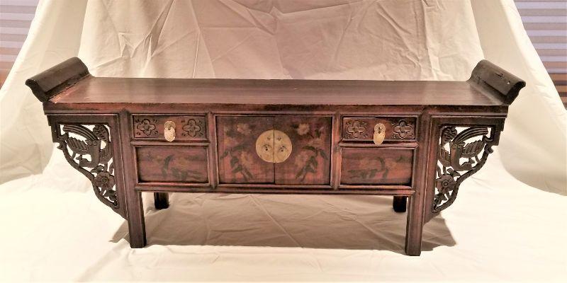 A Cool piece - antique Chinese Home Altar - great look but has some condition issues with repairs. One leg pulling away from the piece (easy fix). Measures 36 3/4" long x 8 7.8" deep x 14 3/8" tall.