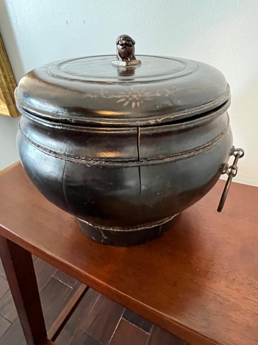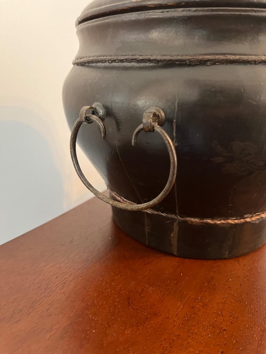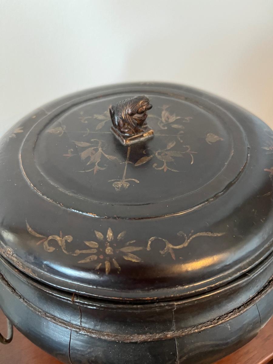 This black lacquered round rice box is topped with a darling foo dog finial and painted in gold with leaves and vines. There is a split along one side.