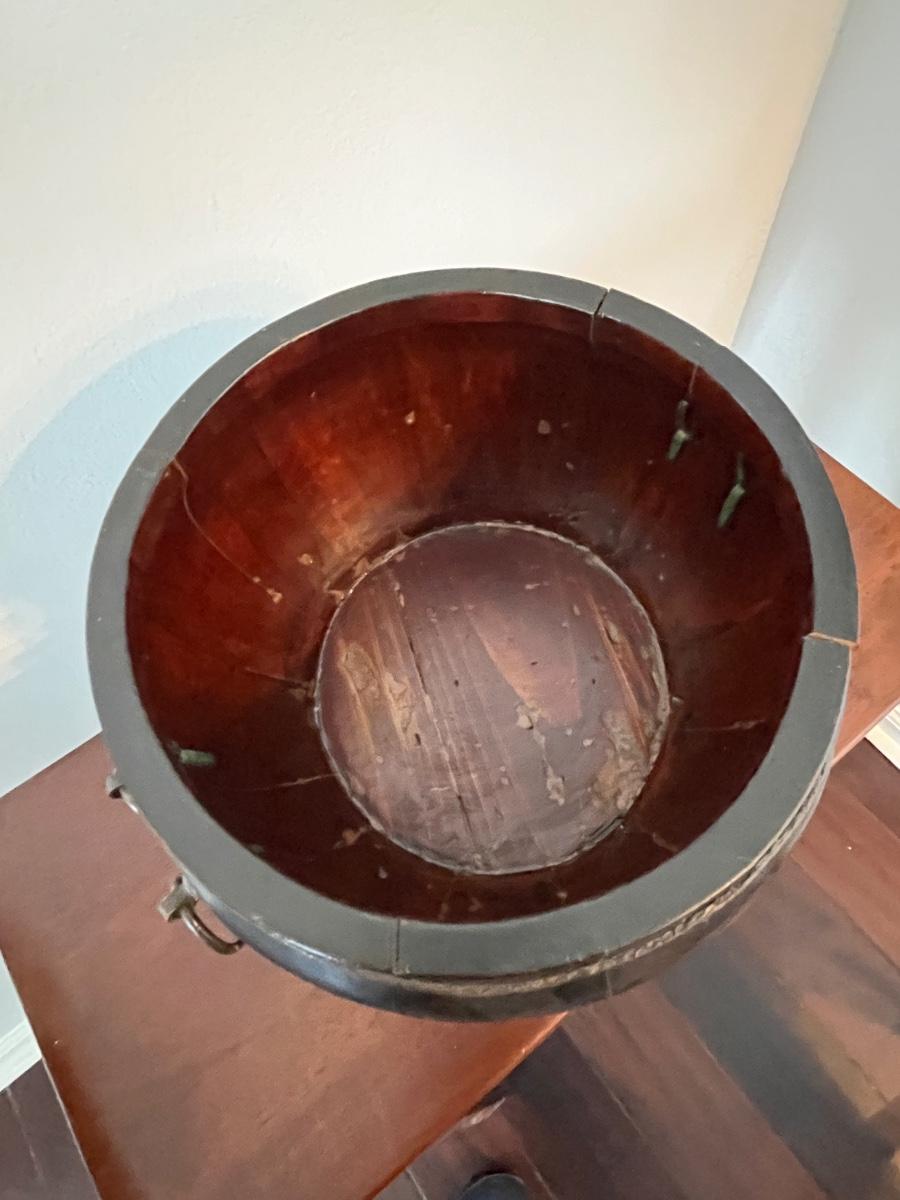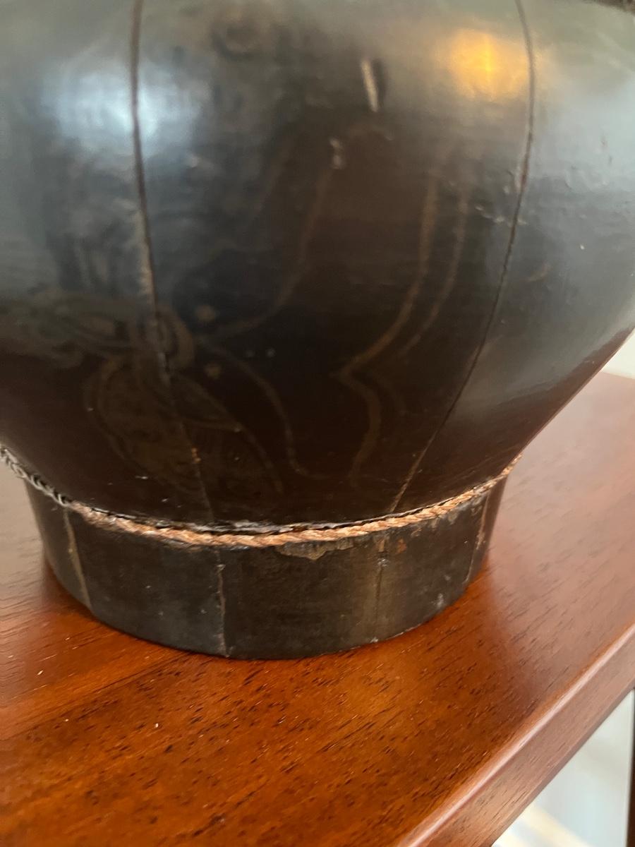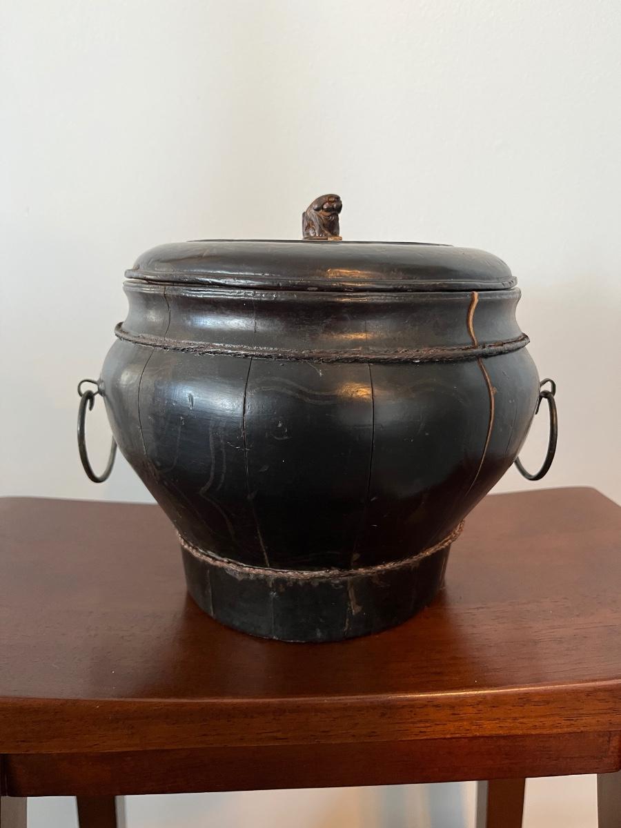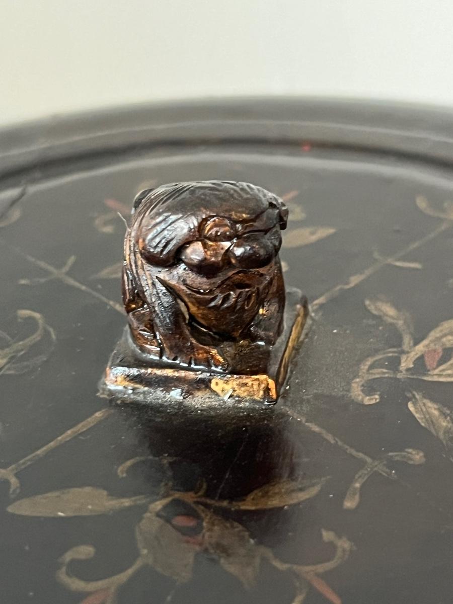 This black lacquered round rice box is topped with a darling foo dog finial and painted in gold with leaves and vines. There is a split along one side.