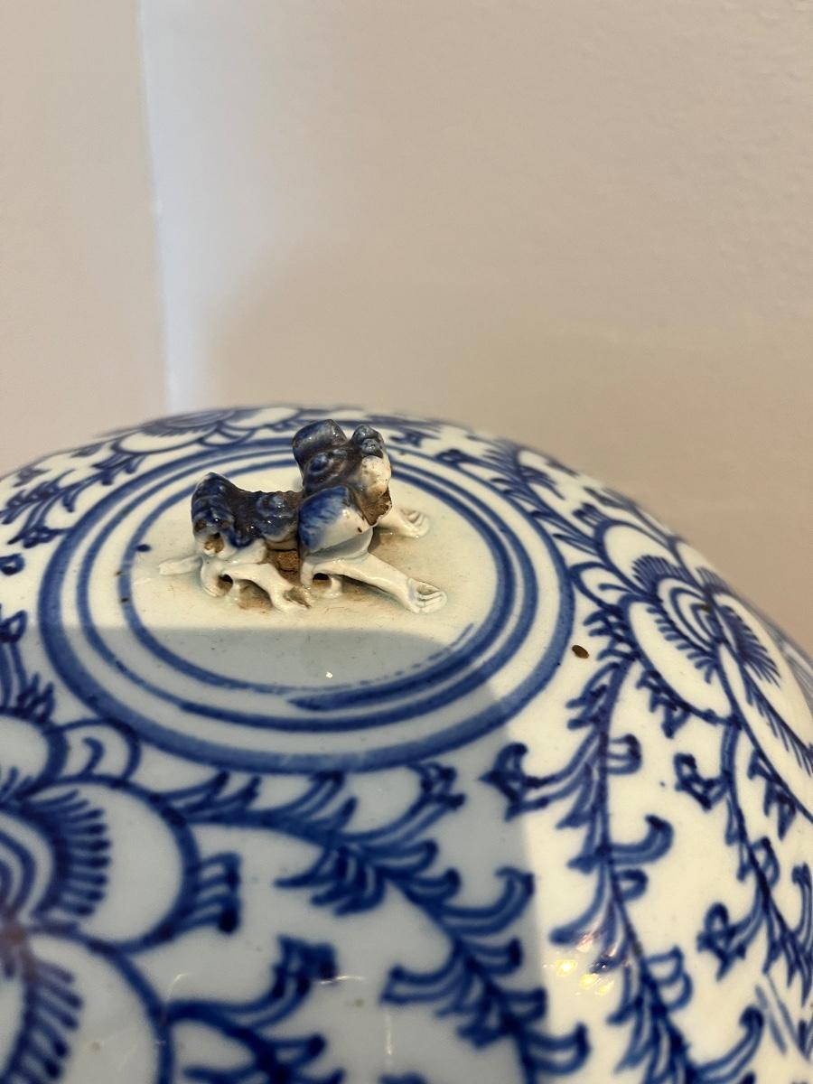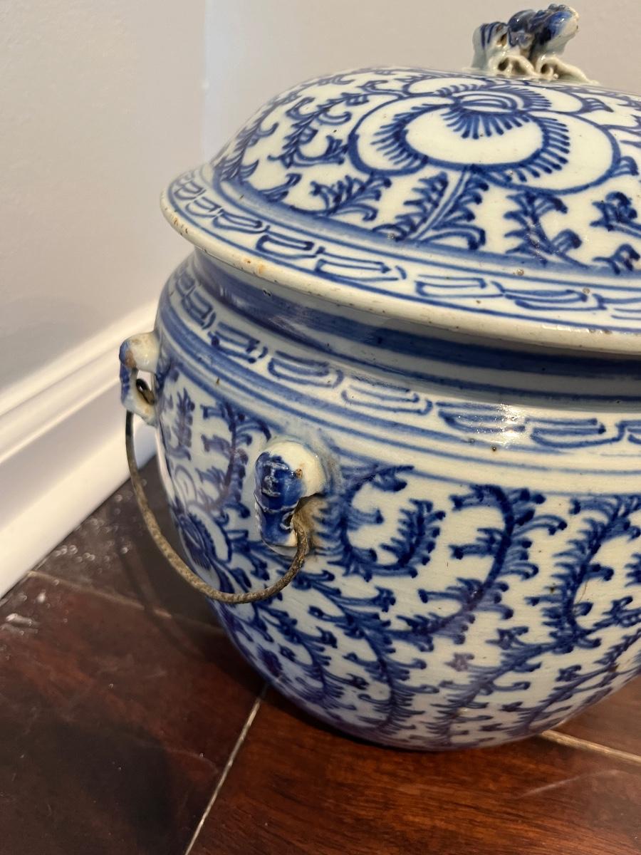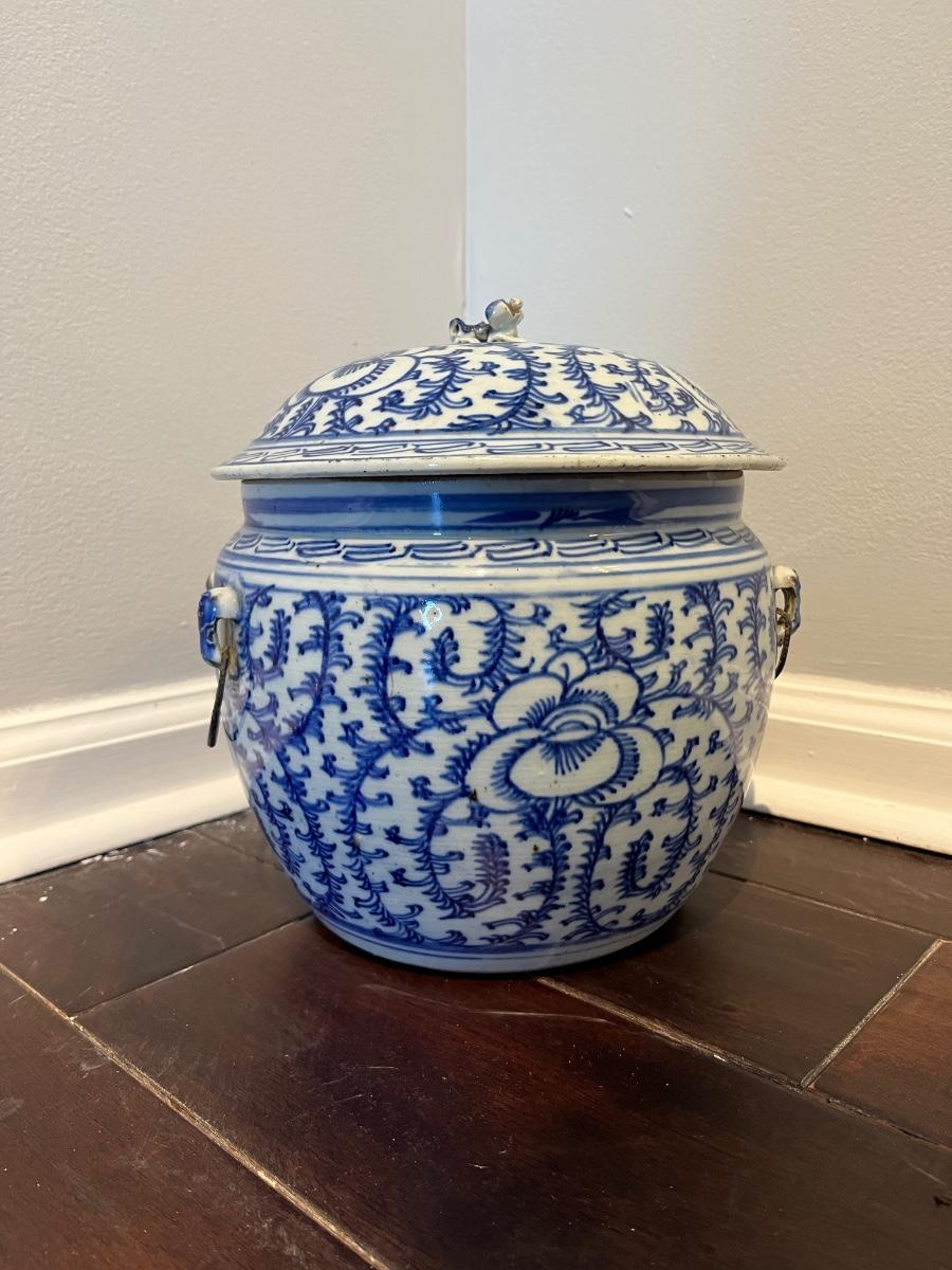 A lovely 19th century Chinese blue and jar decorated with flowers and scrolling vines. The lid is topped with a foo dog finial and the jar has metal handles. There are no signs of any damage. The bottom is marked with a customs stamp.