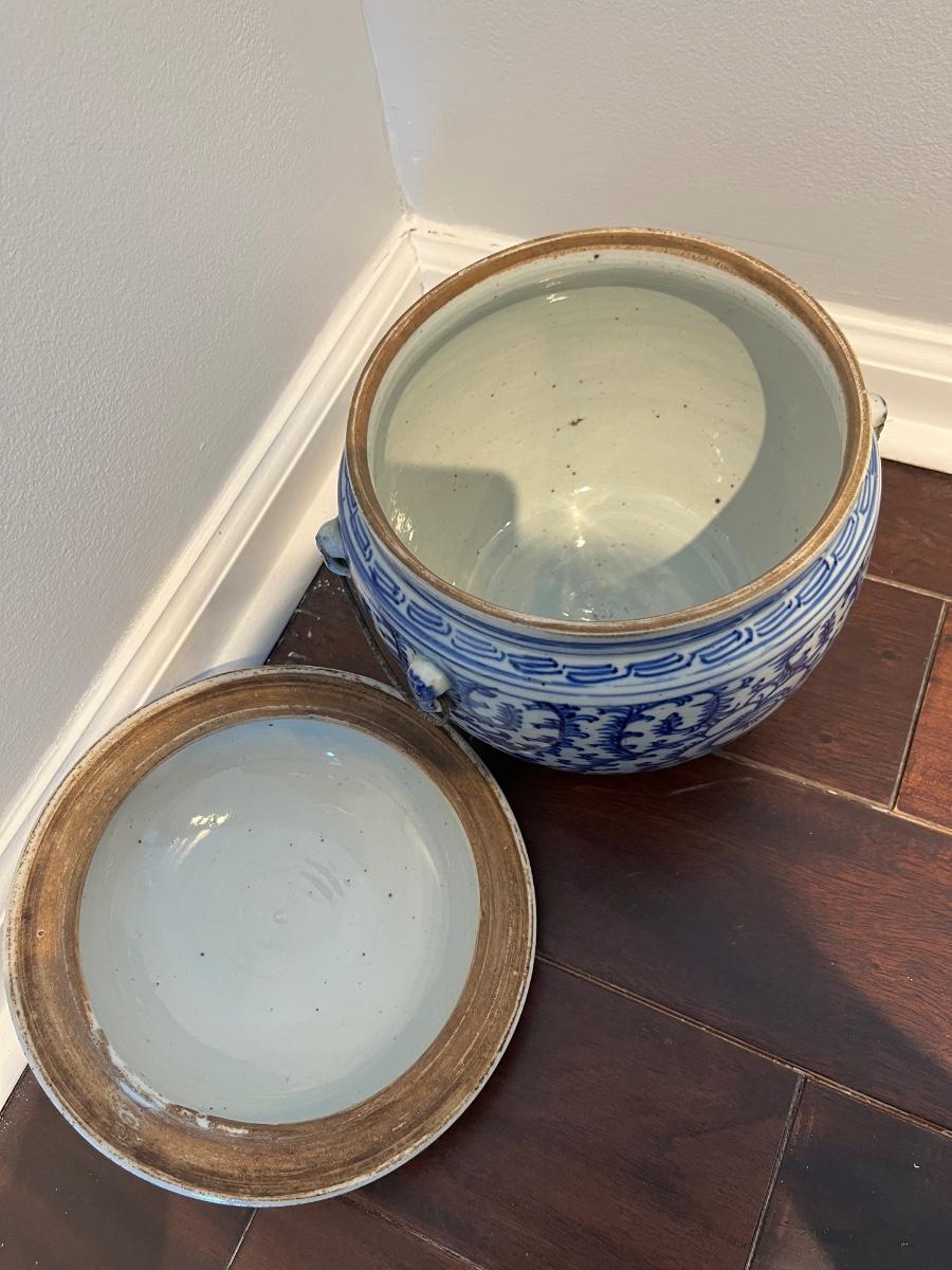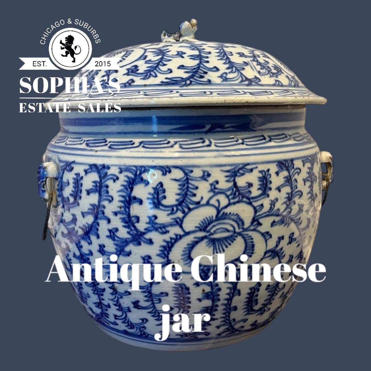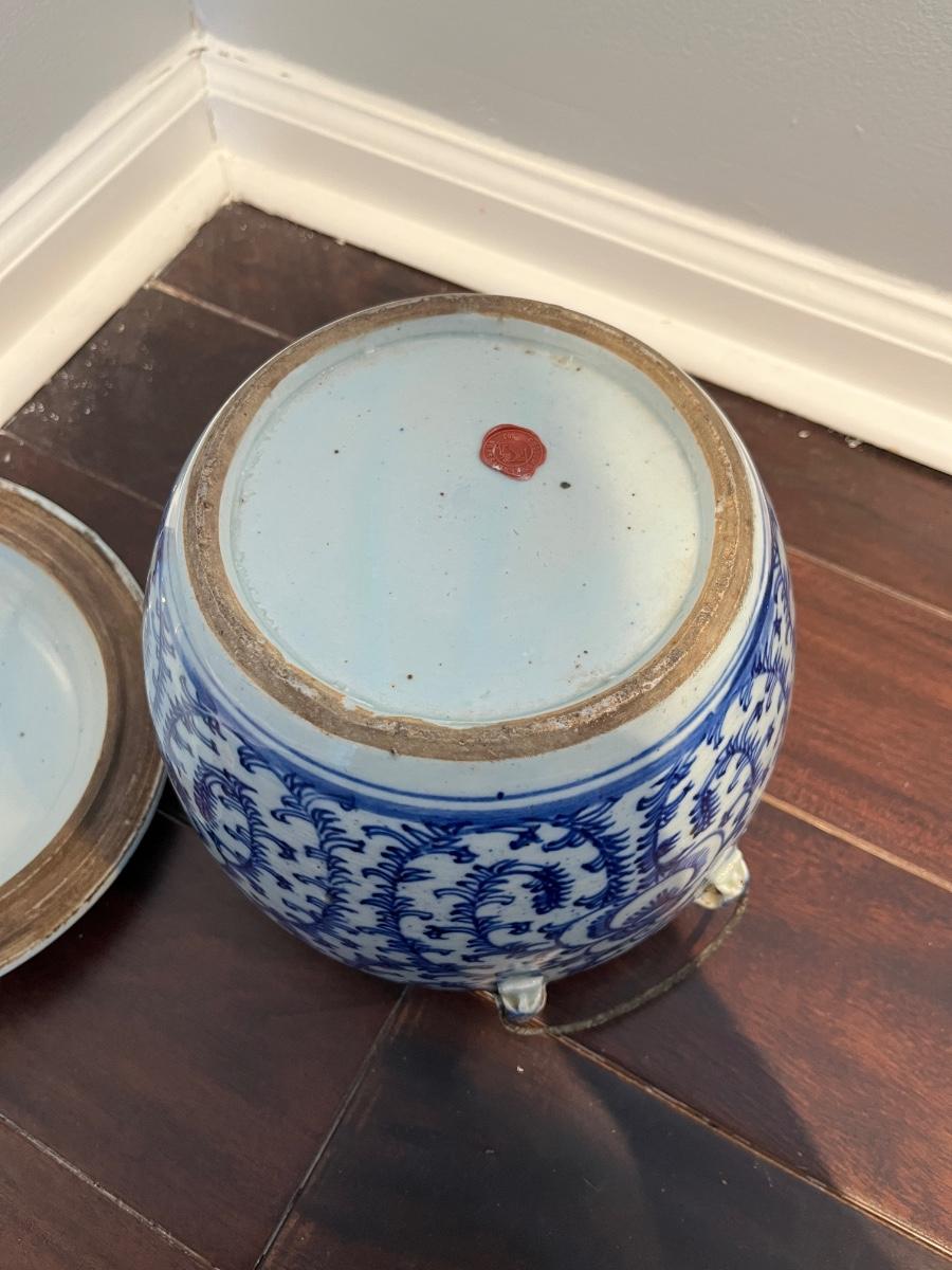 A lovely 19th century Chinese blue and jar decorated with flowers and scrolling vines. The lid is topped with a foo dog finial and the jar has metal handles. There are no signs of any damage. The bottom is marked with a customs stamp.