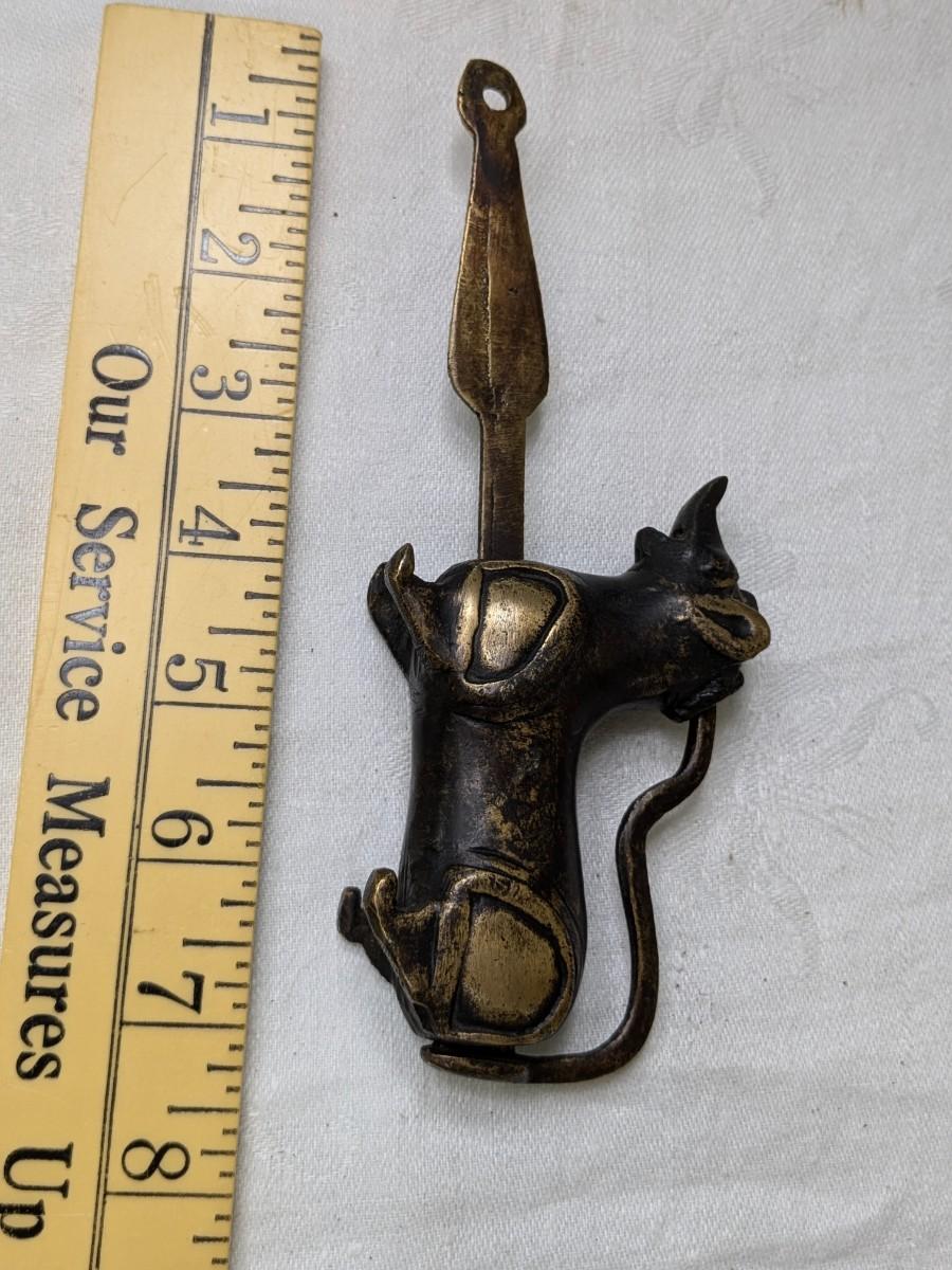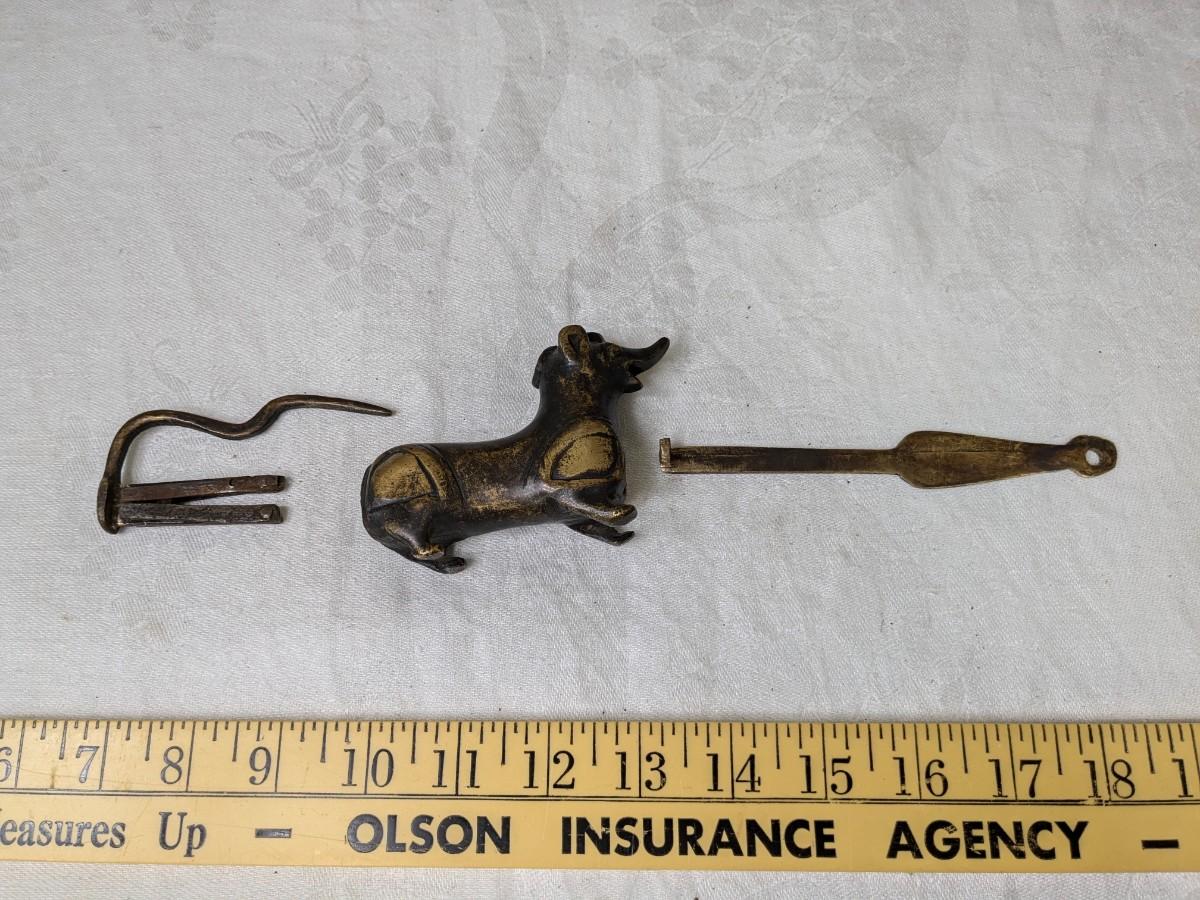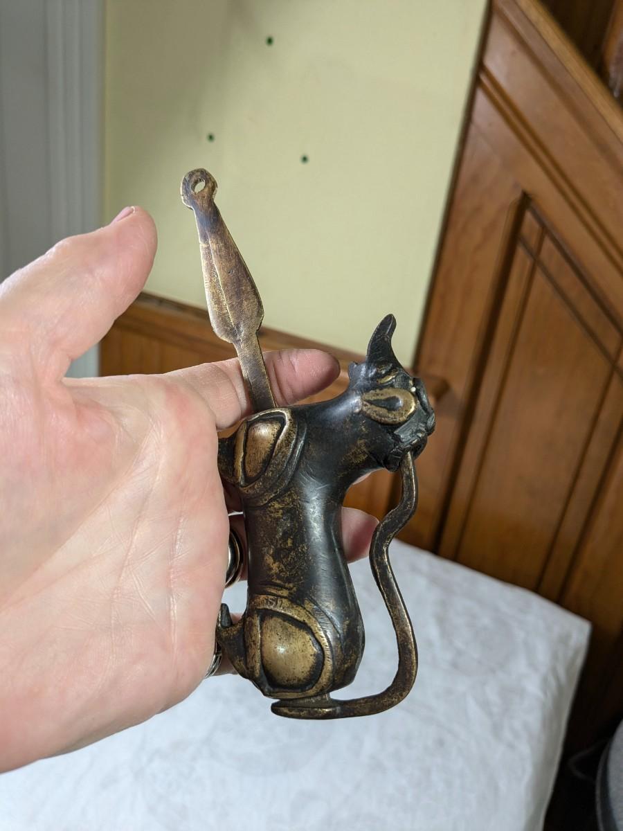 An old Chinese brass furniture lock. Unusual dog form where the tail closes the clasp in the back of the dogs head. A separate key pushes the tail clasp apart from the dog's body. Three pieces total. Good condition with old, accumulated surface patina.