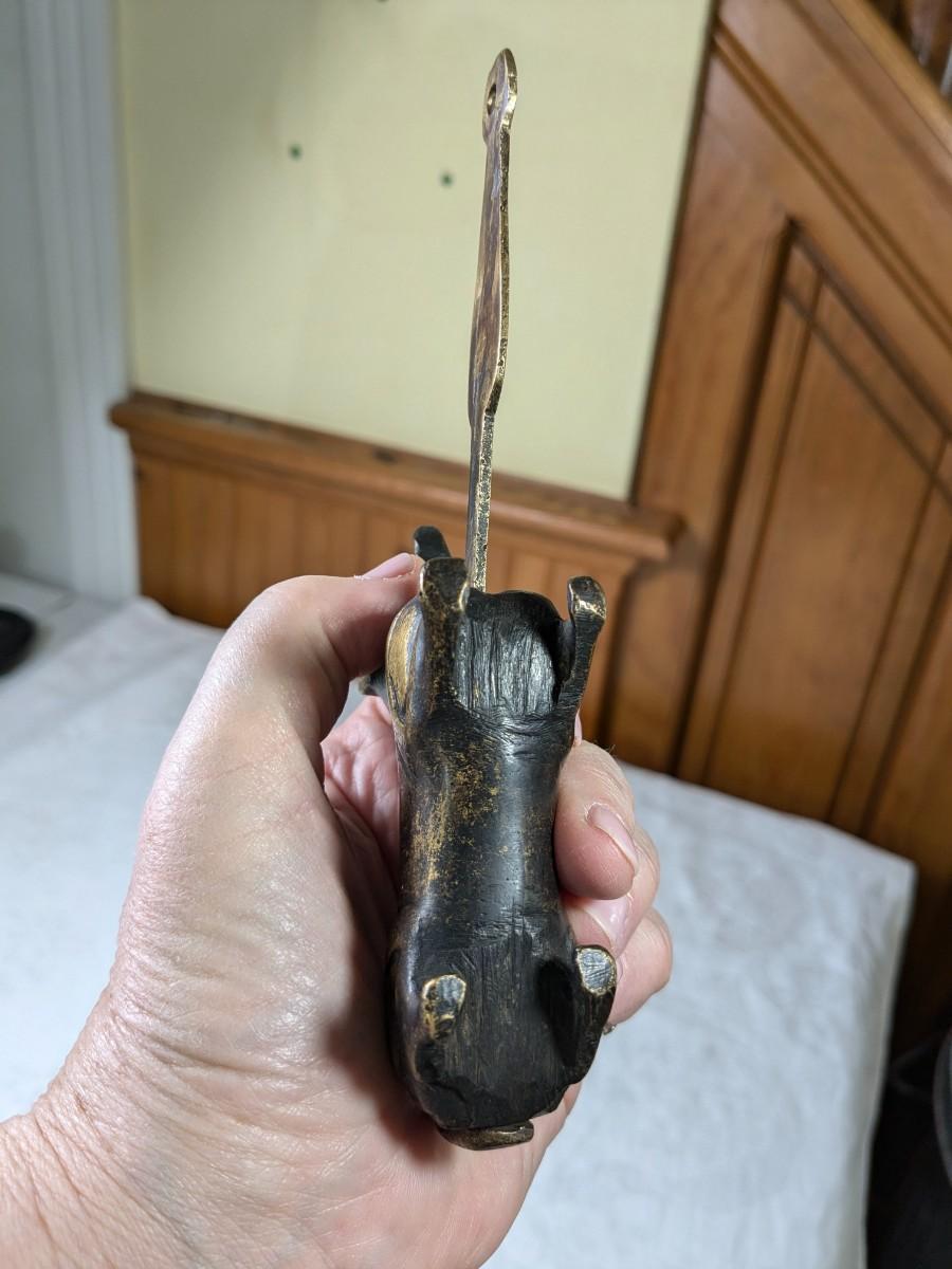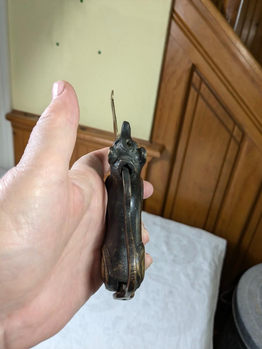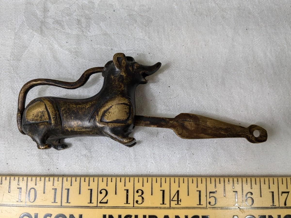An old Chinese brass furniture lock. Unusual dog form where the tail closes the clasp in the back of the dogs head. A separate key pushes the tail clasp apart from the dog's body. Three pieces total. Good condition with old, accumulated surface patina.