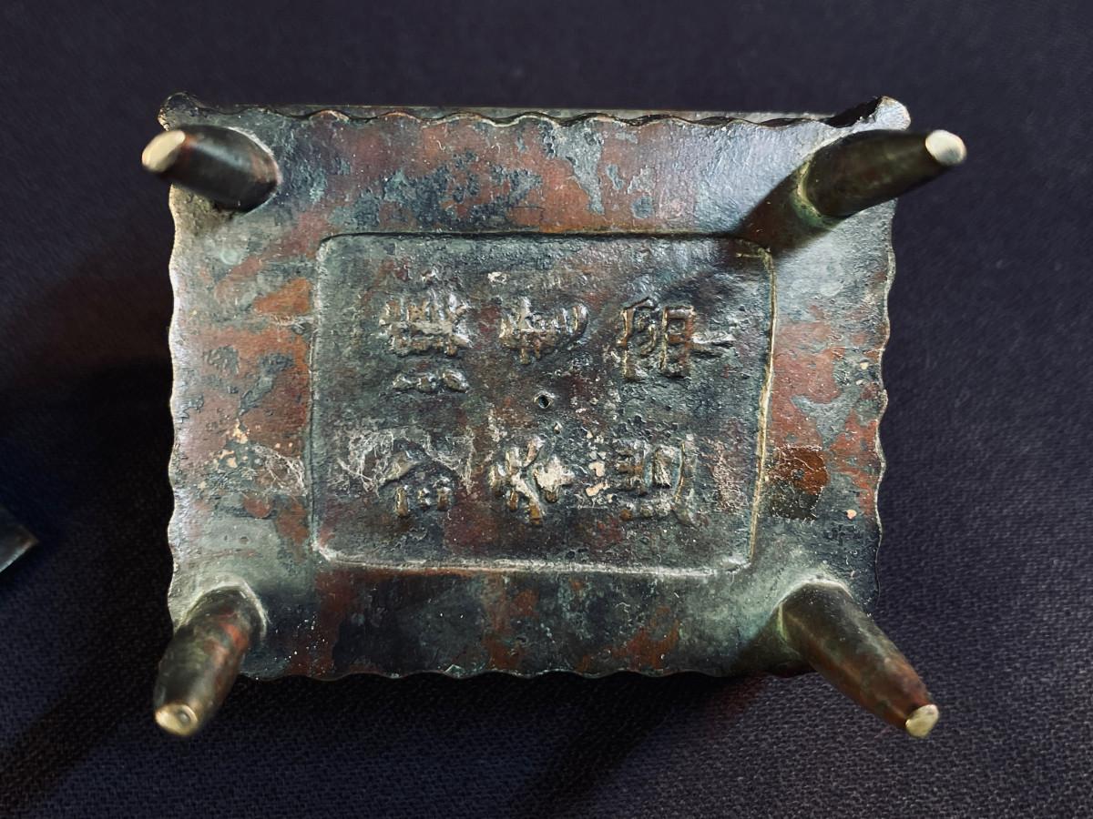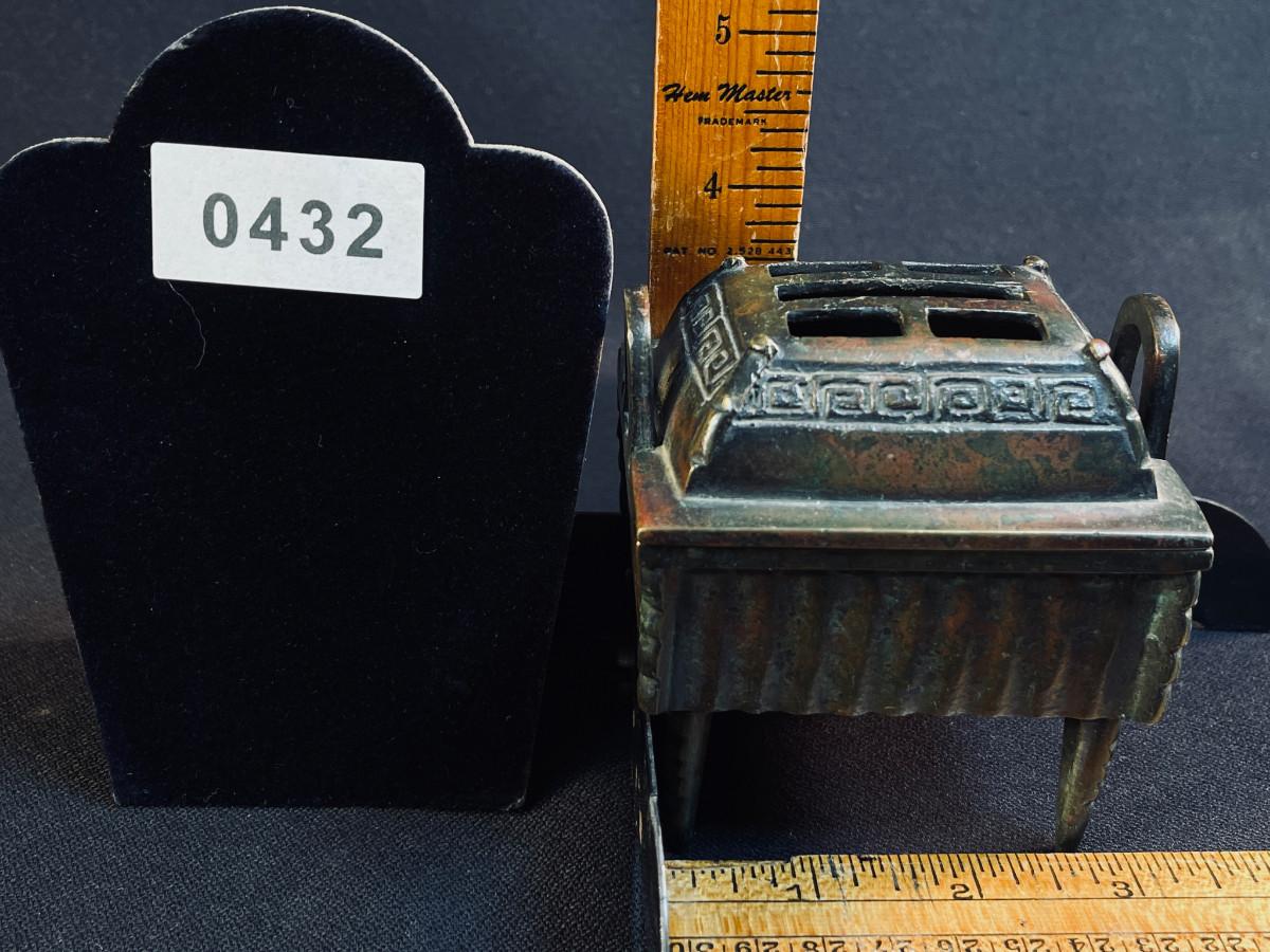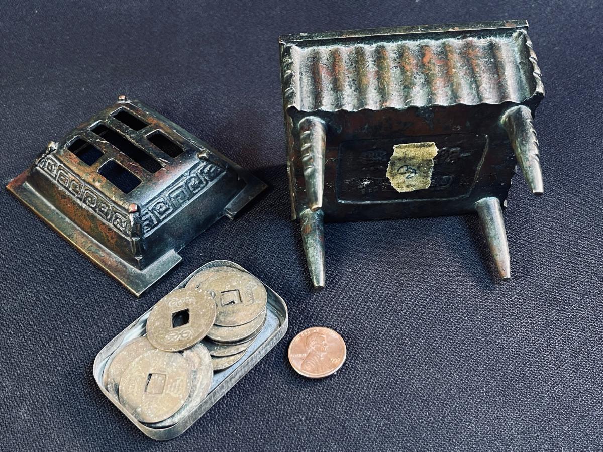 DESCRIPTION: This is a small Chinese bronze incense burner, designed to safely burn incense by depositing the ashes into a heavy, secure gridded bronze box. The tin and pieces inside were kept there and are included. These are strung and hung or worn as protective amulets rather than for monetary use.
