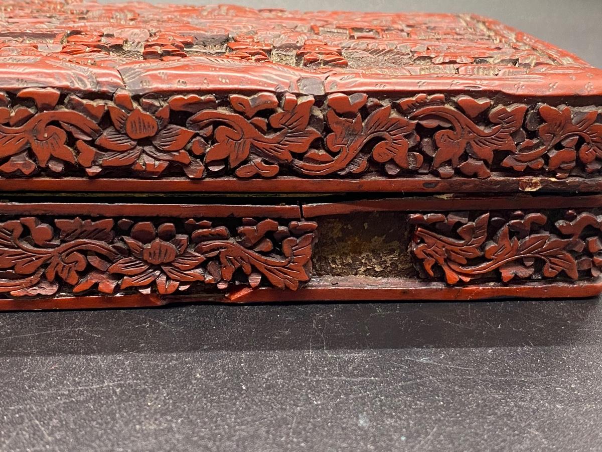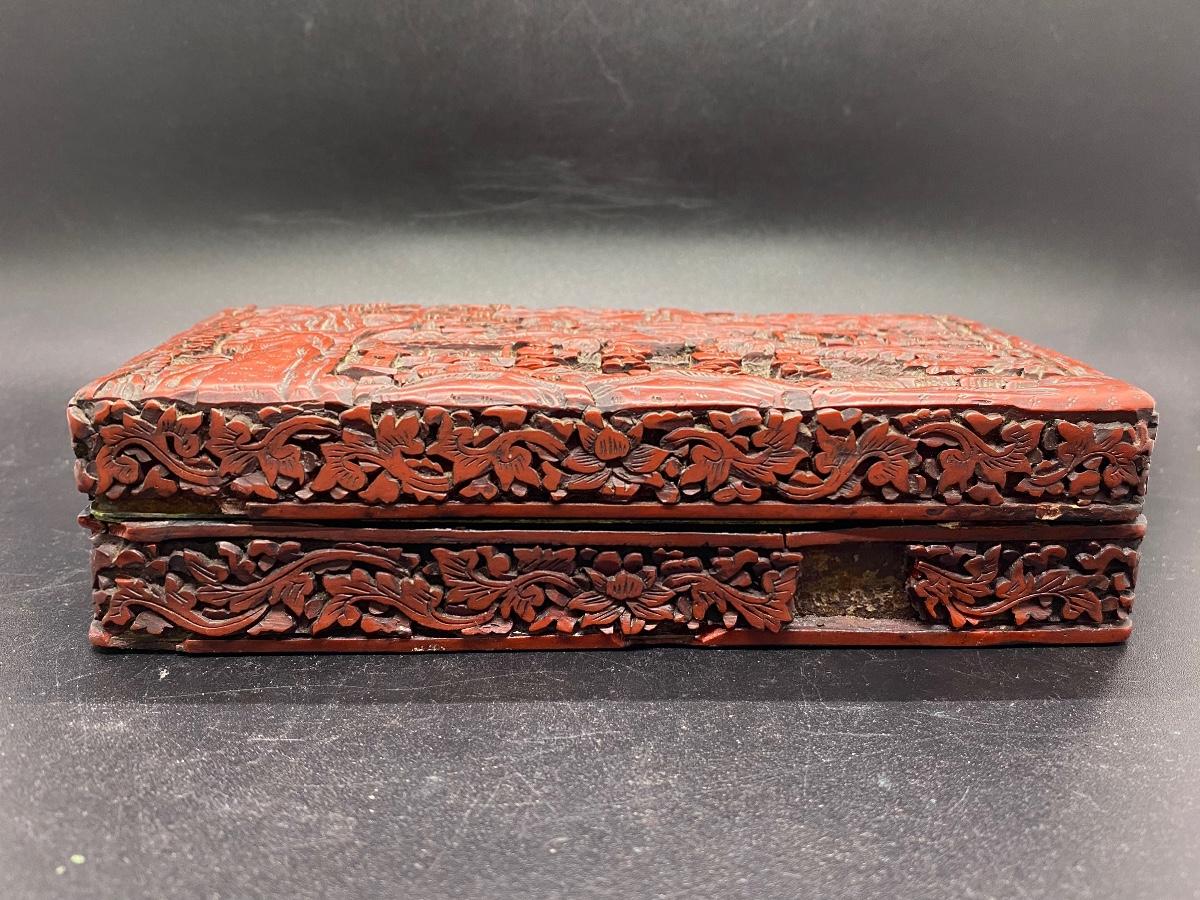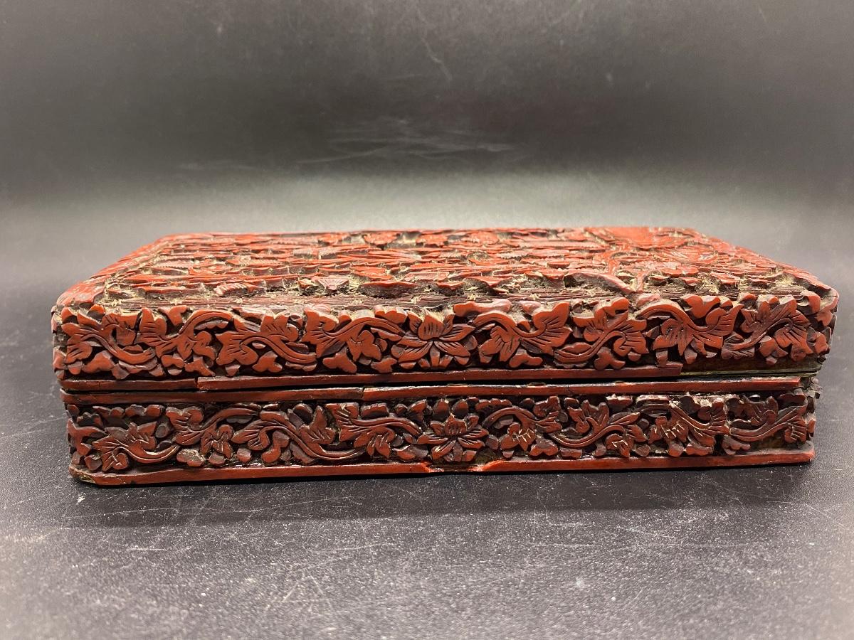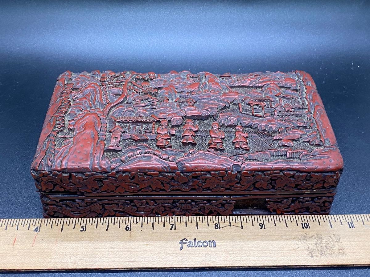 Beautiful ornate Chinese carved cinnabar lacquer box. Lidded box, about 6" size. Great detail to lid and sides. There is some light wear and a chipped piece. Lacquer shows age as well. Deep dark red color.