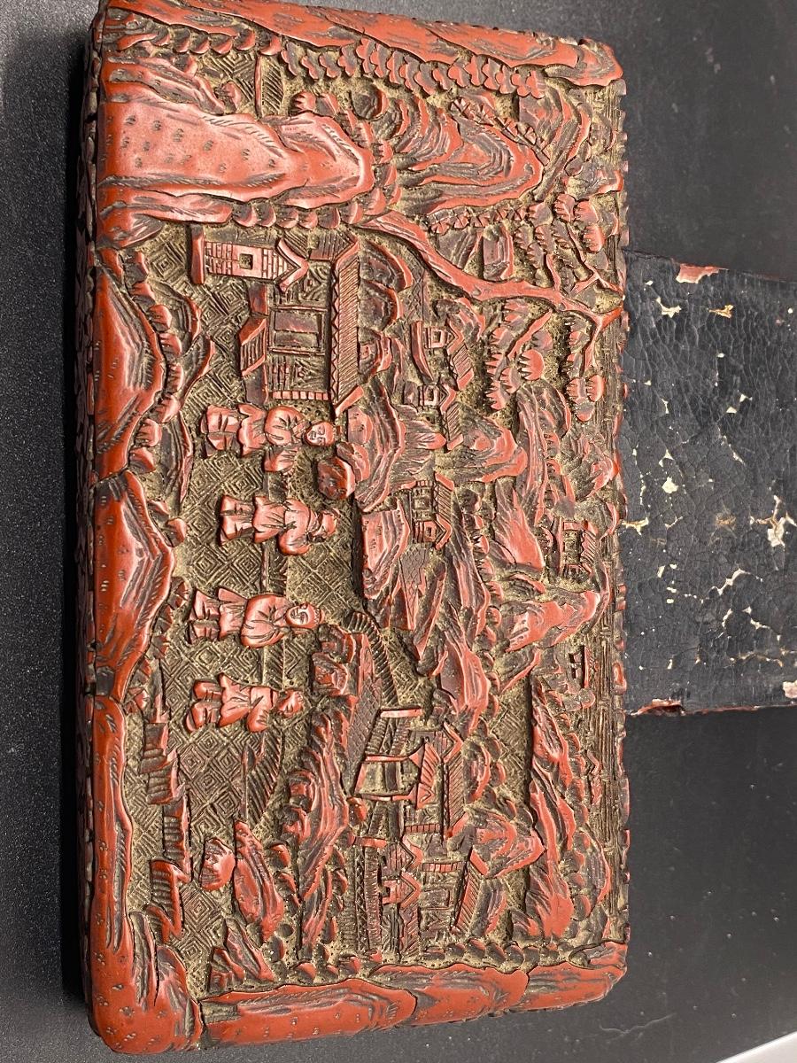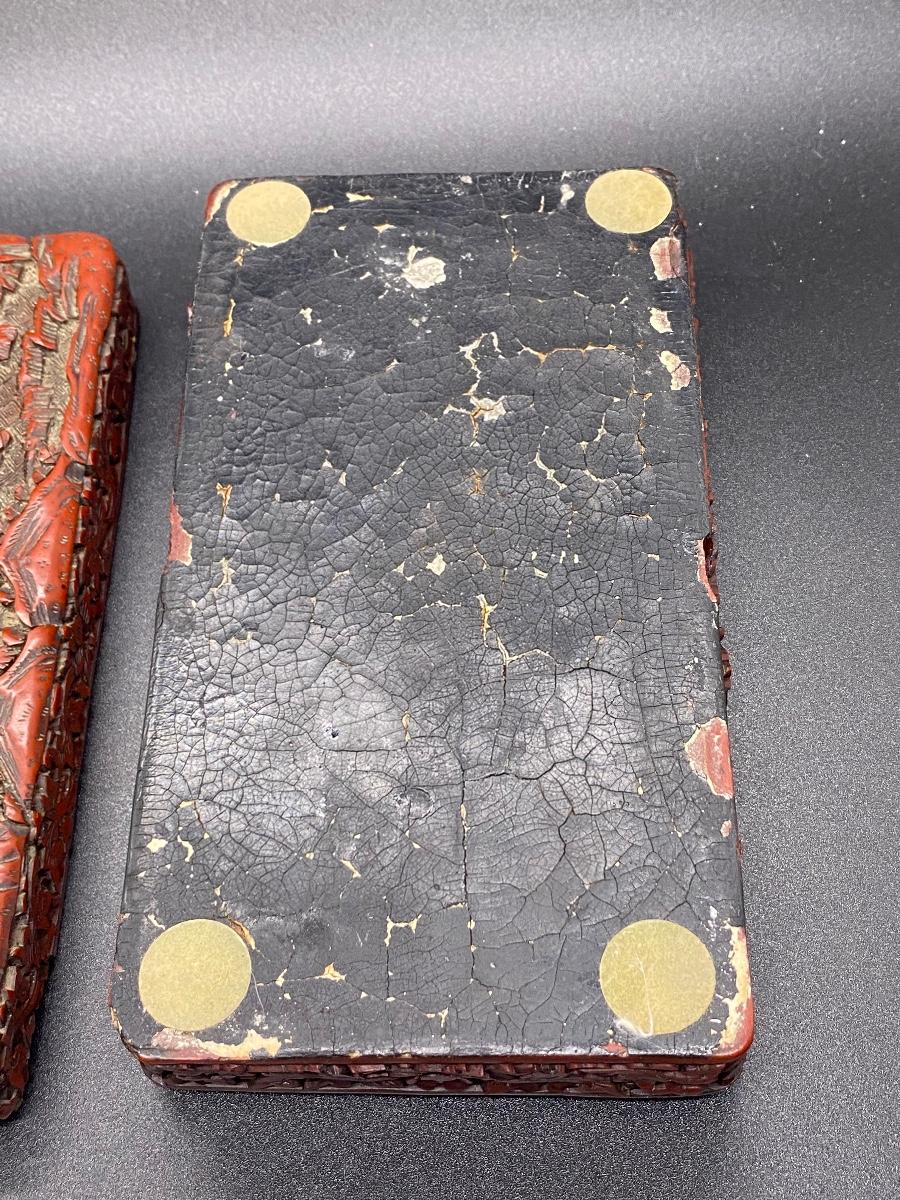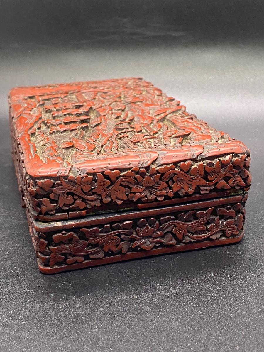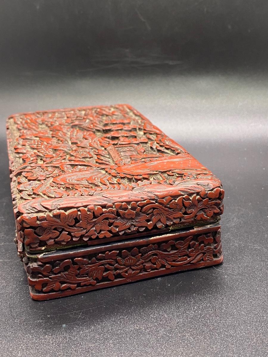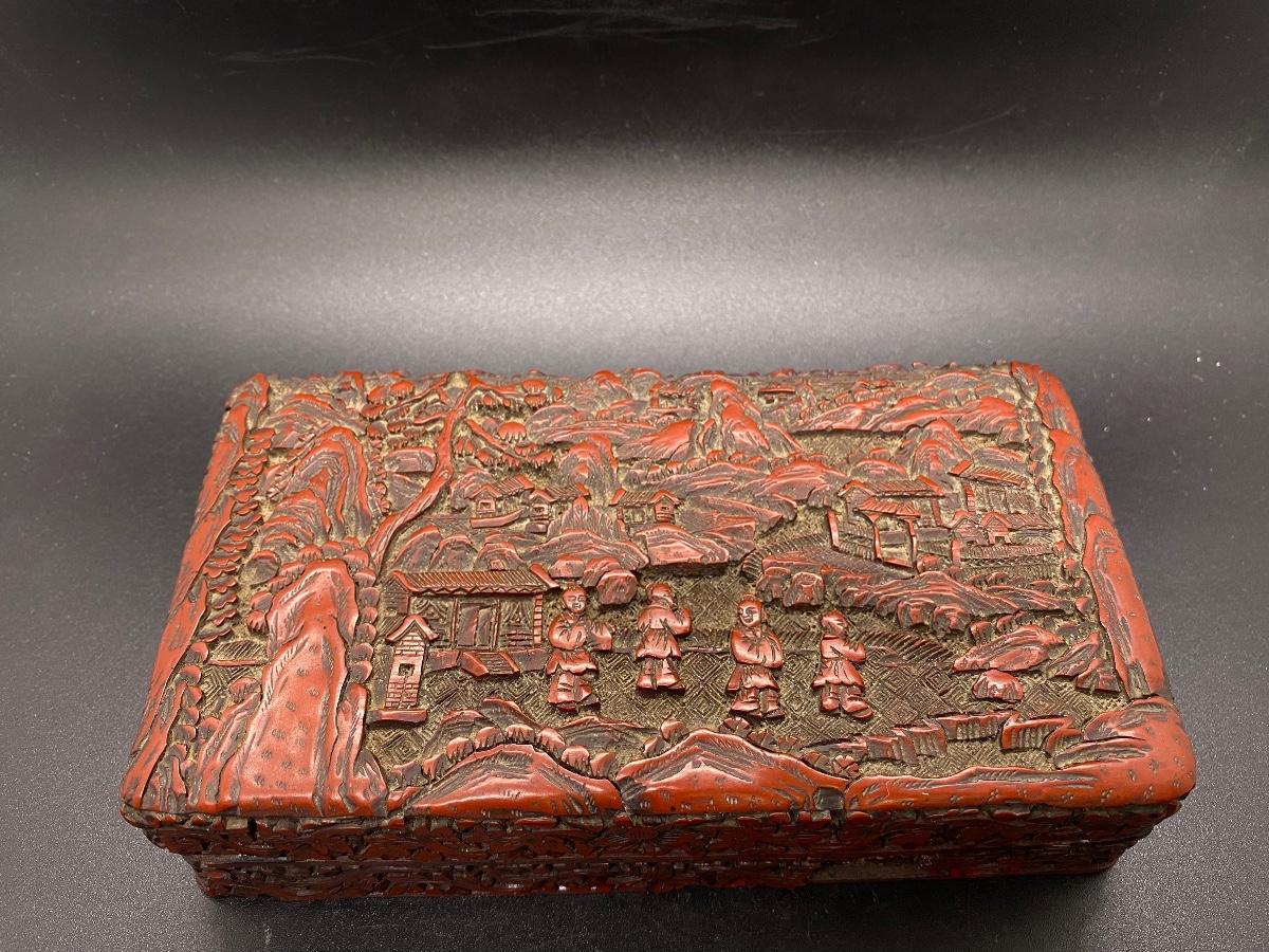 Beautiful ornate Chinese carved cinnabar lacquer box. Lidded box, about 6" size. Great detail to lid and sides. There is some light wear and a chipped piece. Lacquer shows age as well. Deep dark red color.